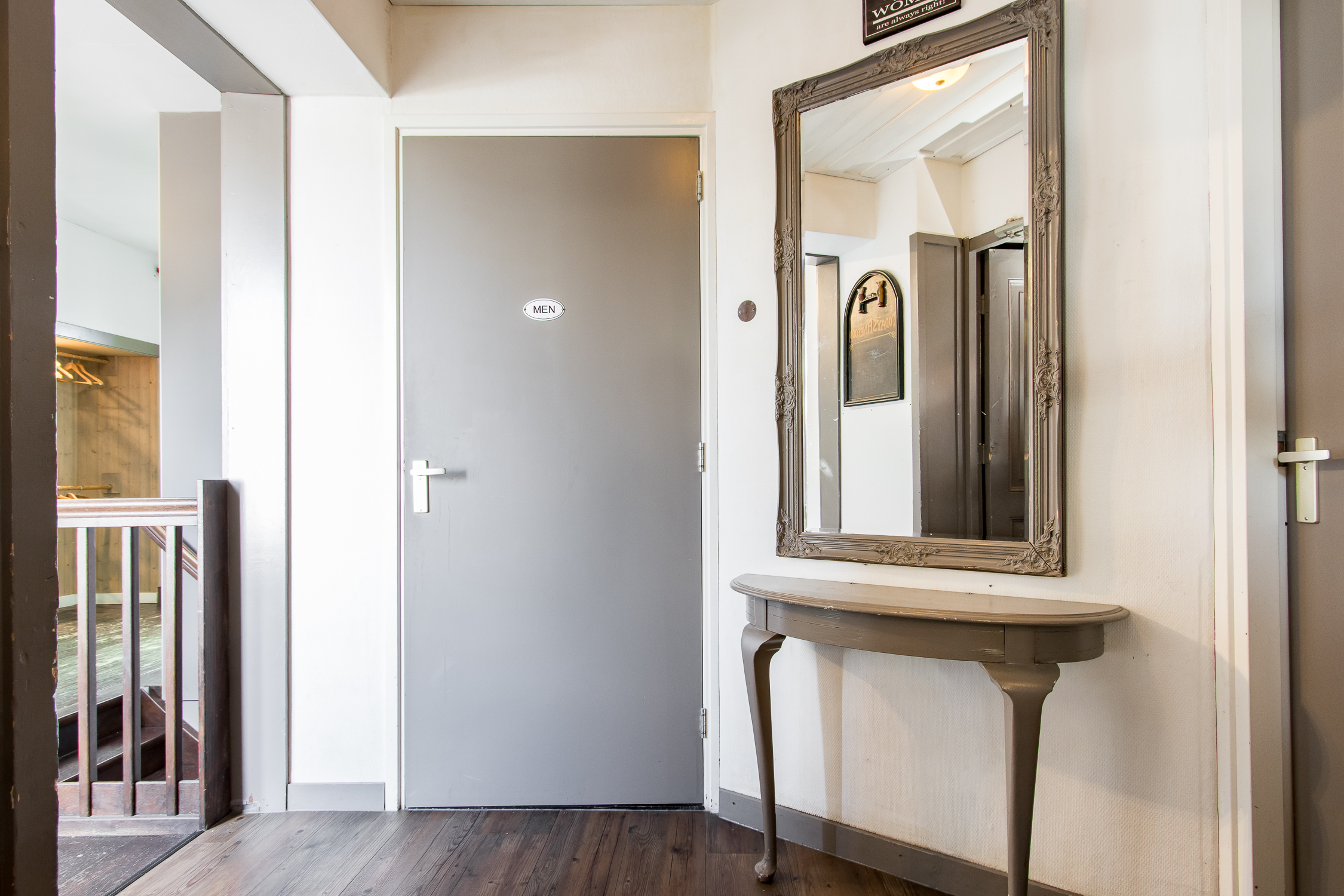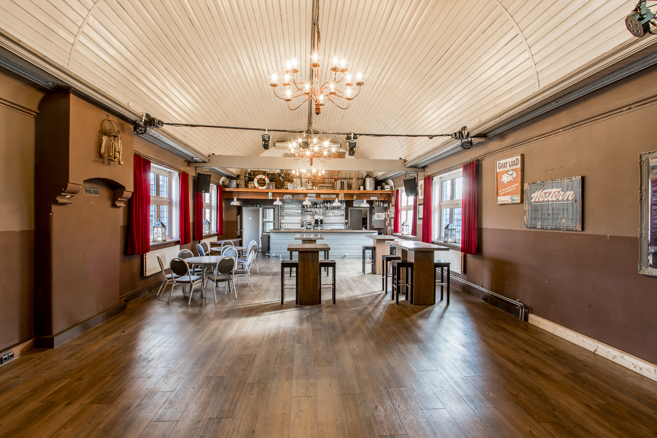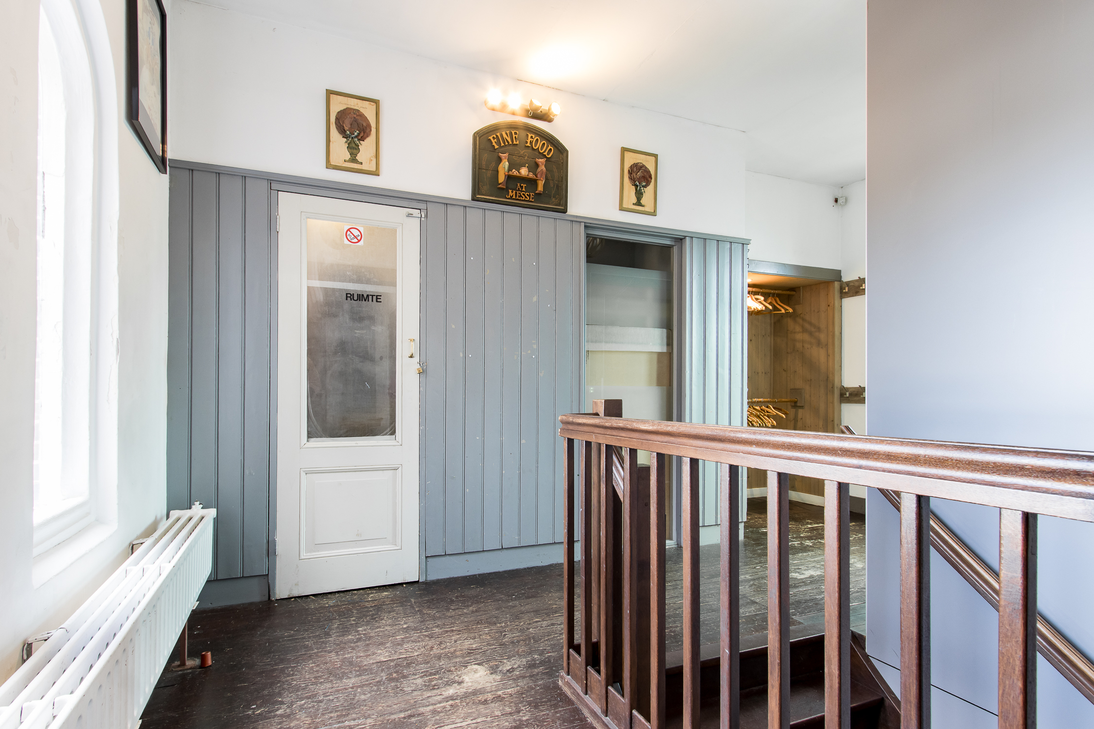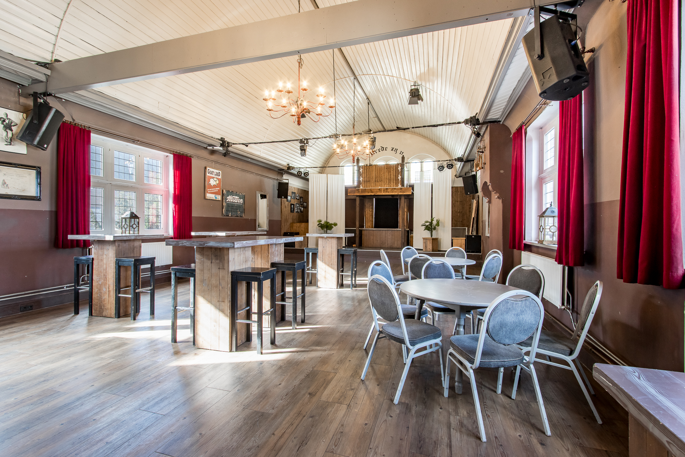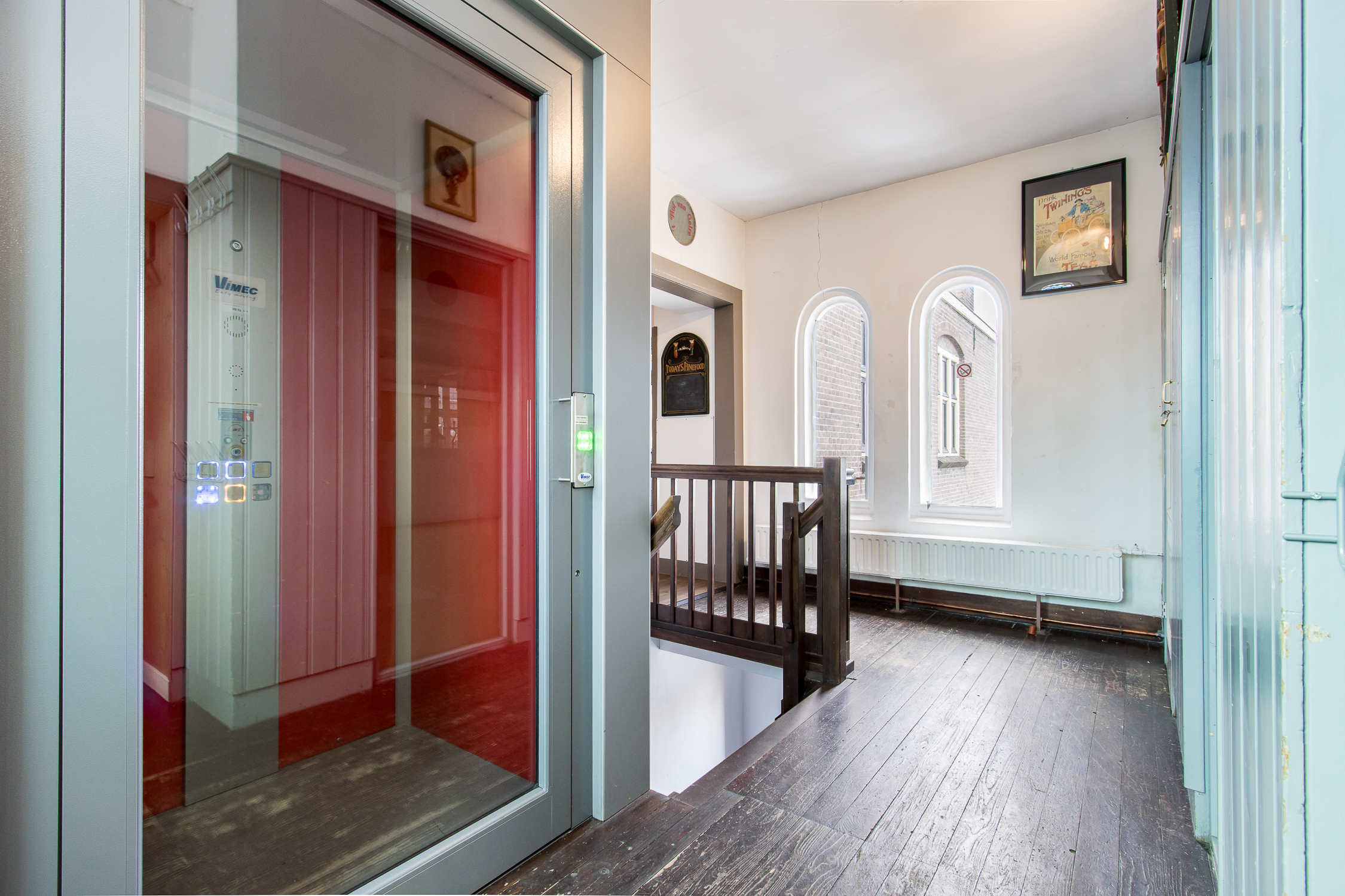 Op de eerste verdieping bevindt zich een sfeervolle horecaruimte, bereikbaar via trap en een moderne lift. Hier zorgen het gebogen plafond, de glas-in-loodramen en andere originele details voor een bijzondere ambiance – perfect voor een restaurant, (besloten) feesten of zakelijke evenementen.