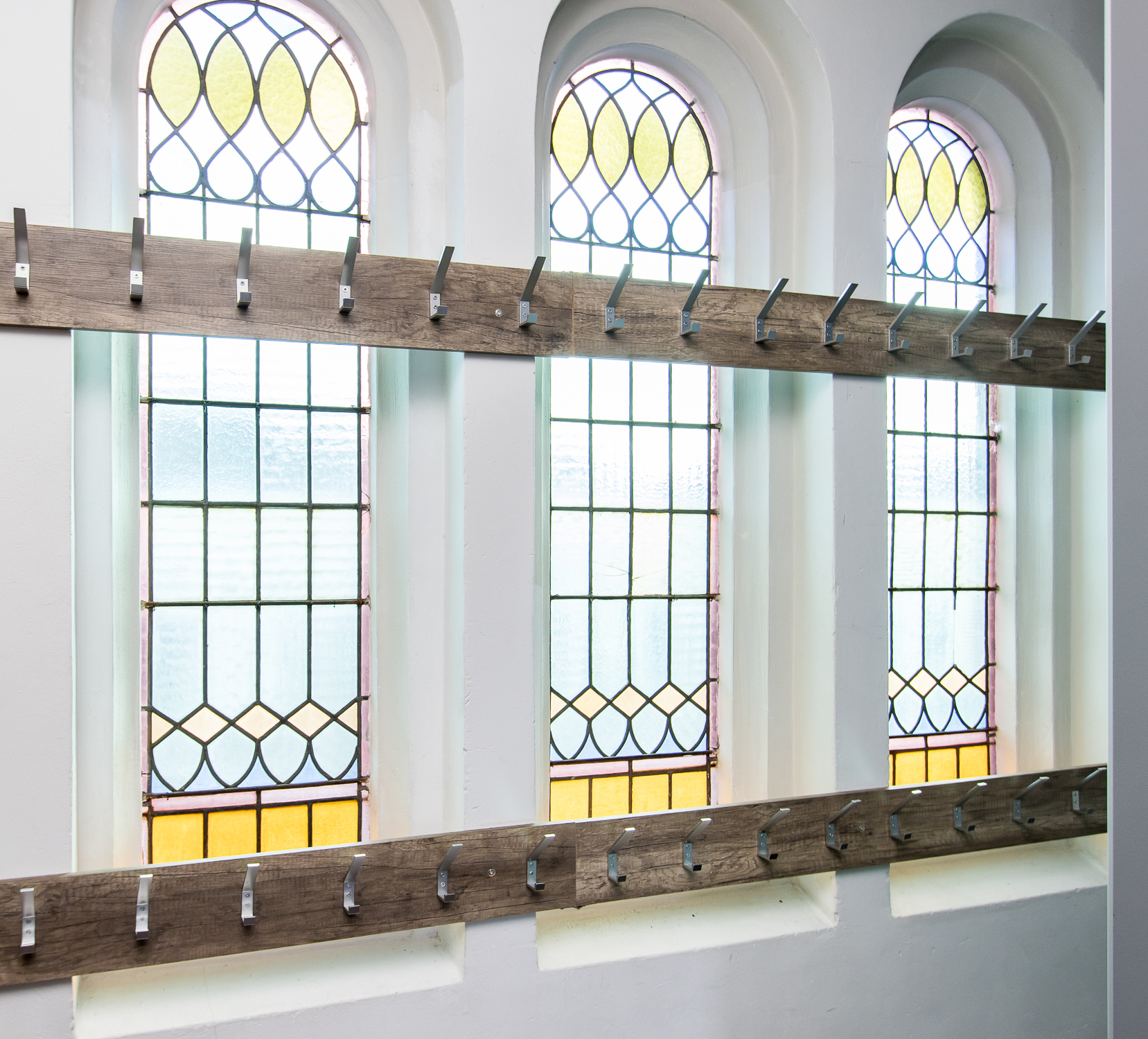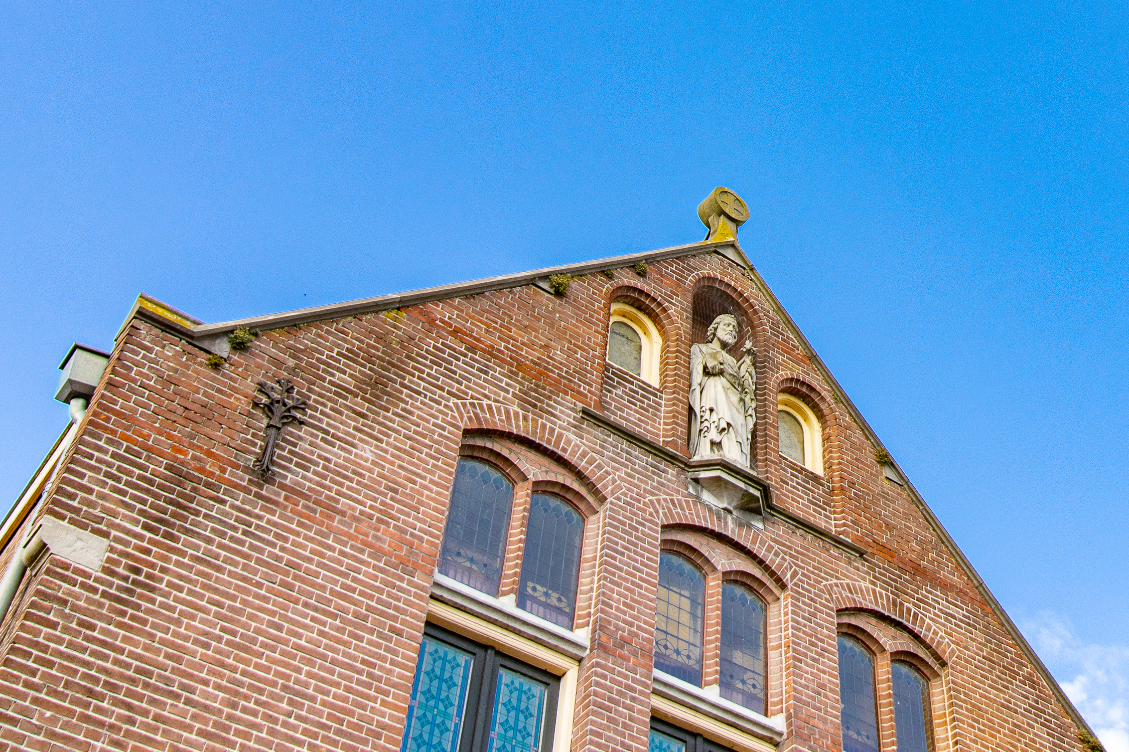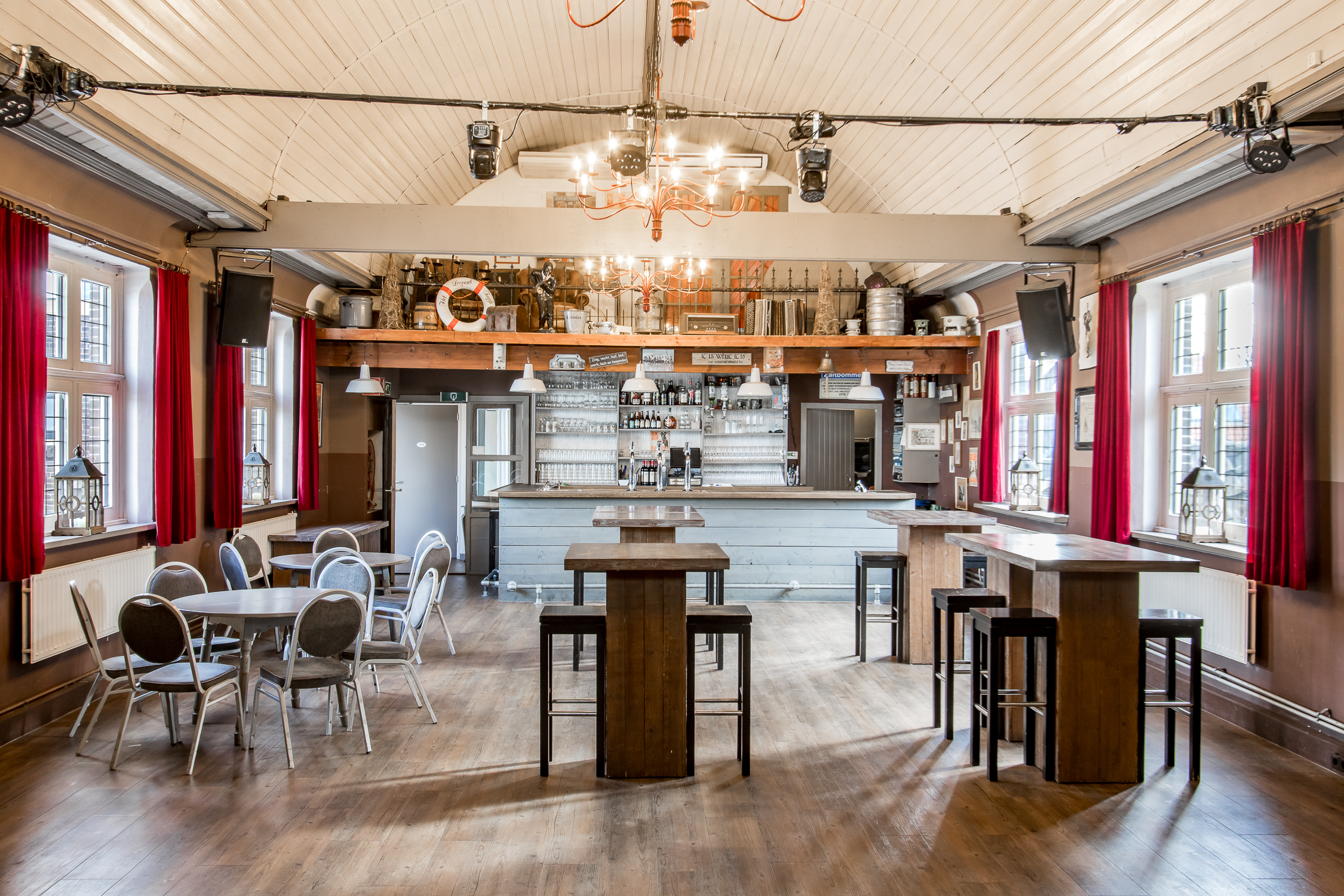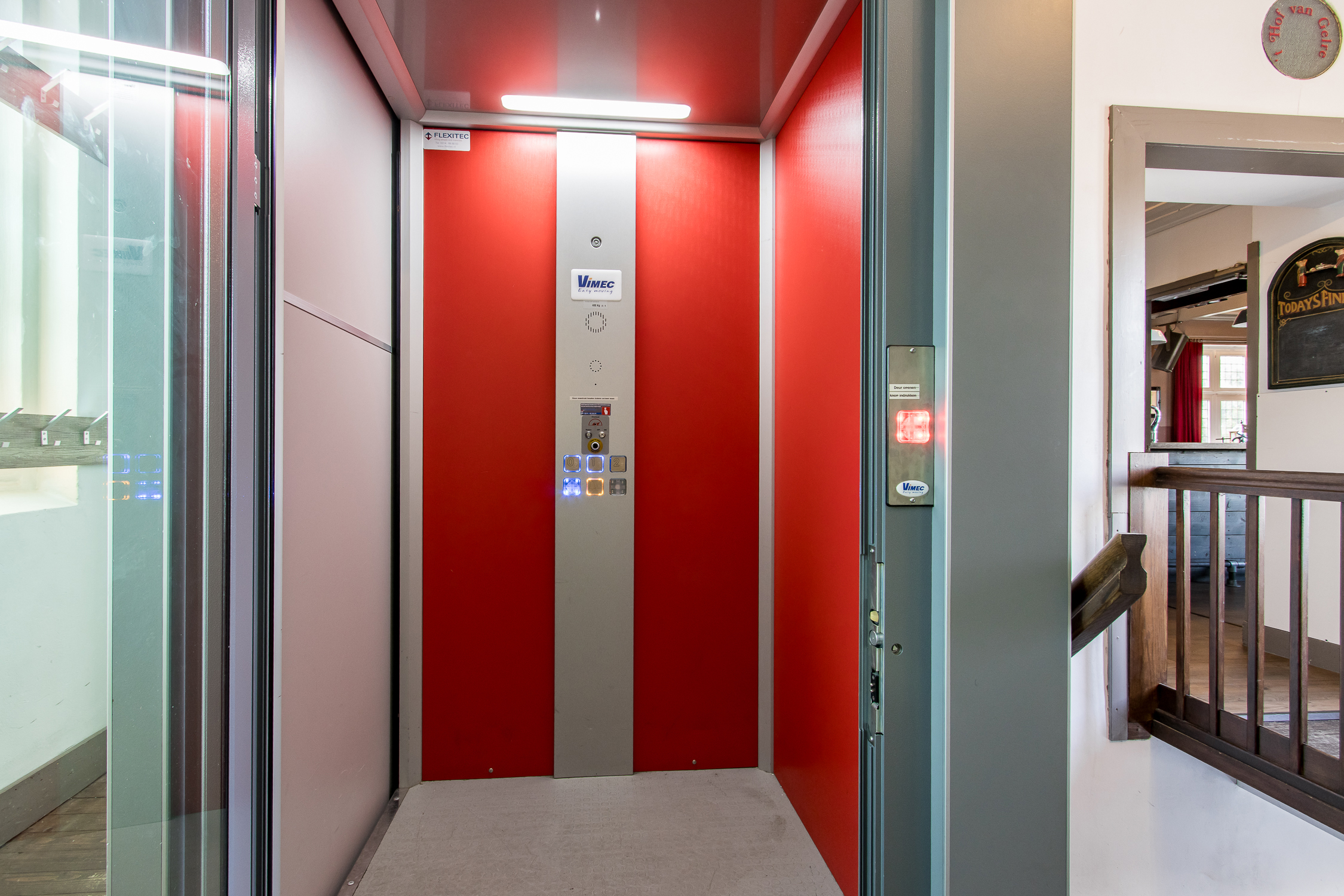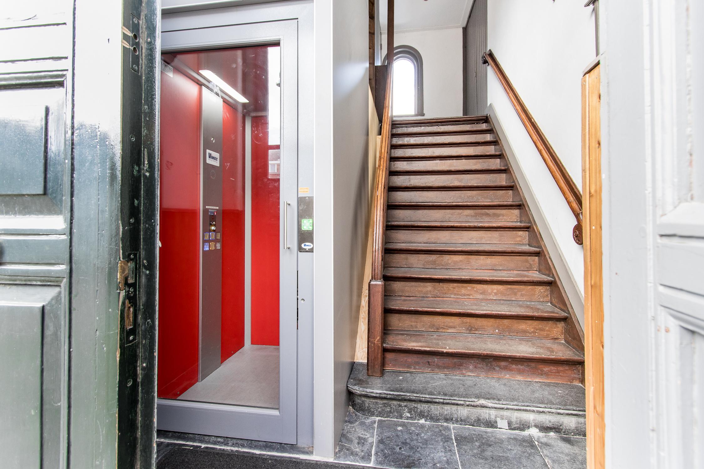 Op de eerste verdieping bevindt zich een sfeervolle horecaruimte, bereikbaar via trap en een moderne lift. Hier zorgen het gebogen plafond, de glas-in-loodramen en andere originele details voor een bijzondere ambiance – perfect voor een restaurant, (besloten) feesten of zakelijke evenementen.