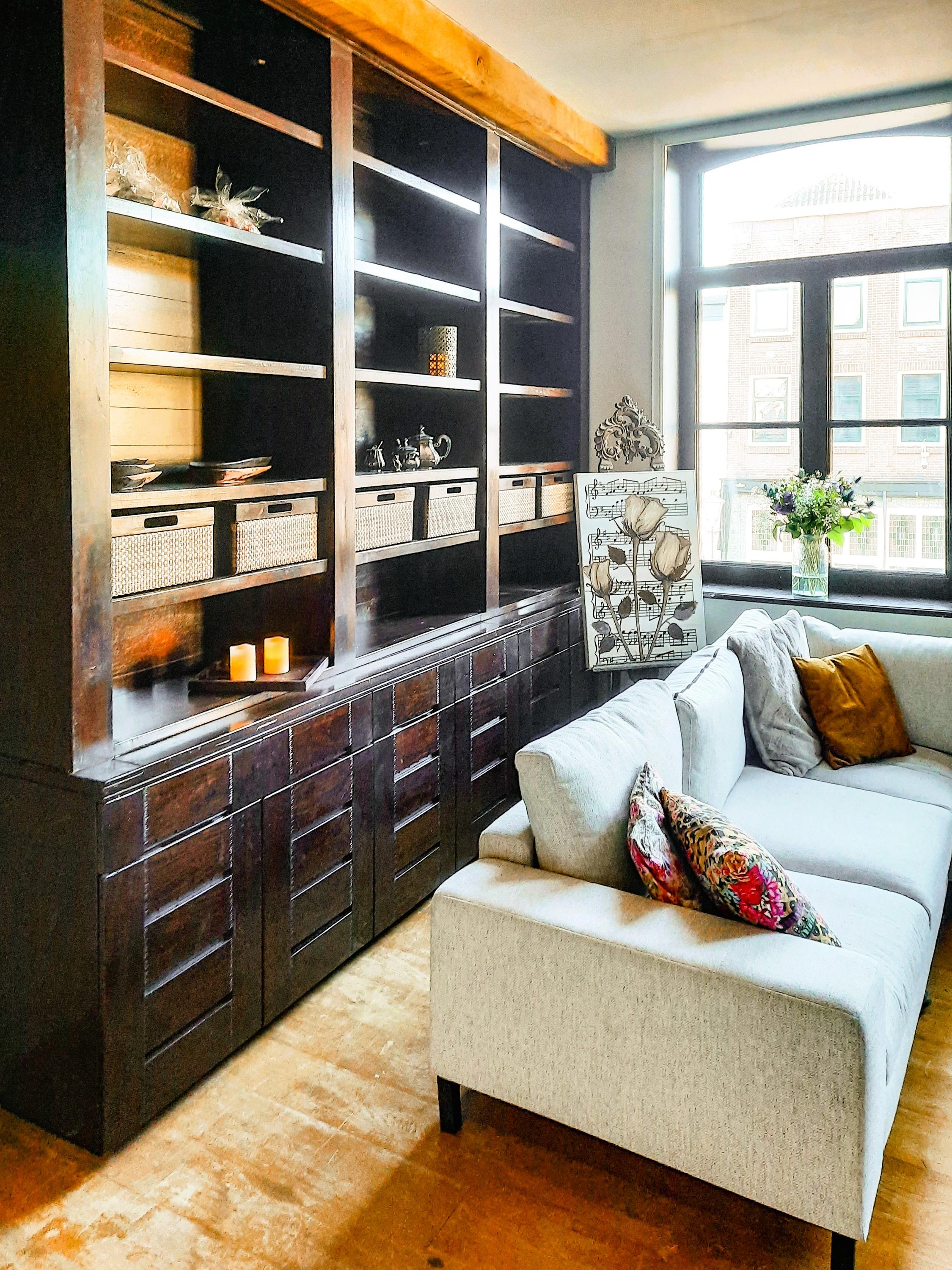 Indeling woonhuis/ eerste verdieping: via de zijingang komt u in de hal waar u met de lift op de eerste verdieping uitkomt. De art-nouveau ronde ramen verlichten de hal met de ochtendzon, schuifdeuren wijzen de weg naar de woonkamer. Grote ramen, hoge plafonds, statige boekenkast en een prachtige schouw verwarmen deze ruimte tot een sfeervol geheel met uitzicht op de oude stadspoort. Naast de woonkamer is momenteel een magazijn maar kan eenvoudig tot kantoor of bij de woonkamer getrokken worden.