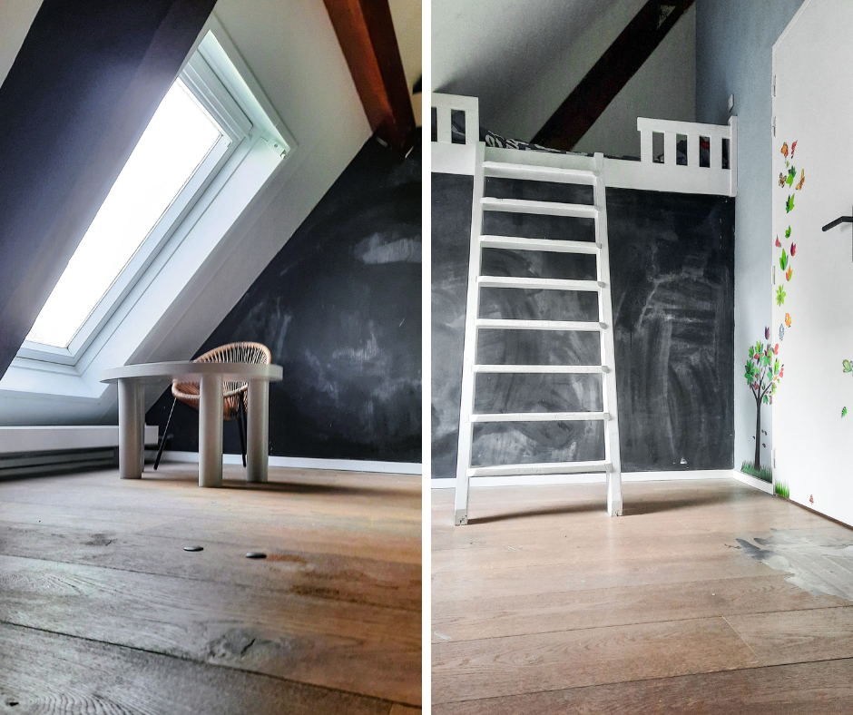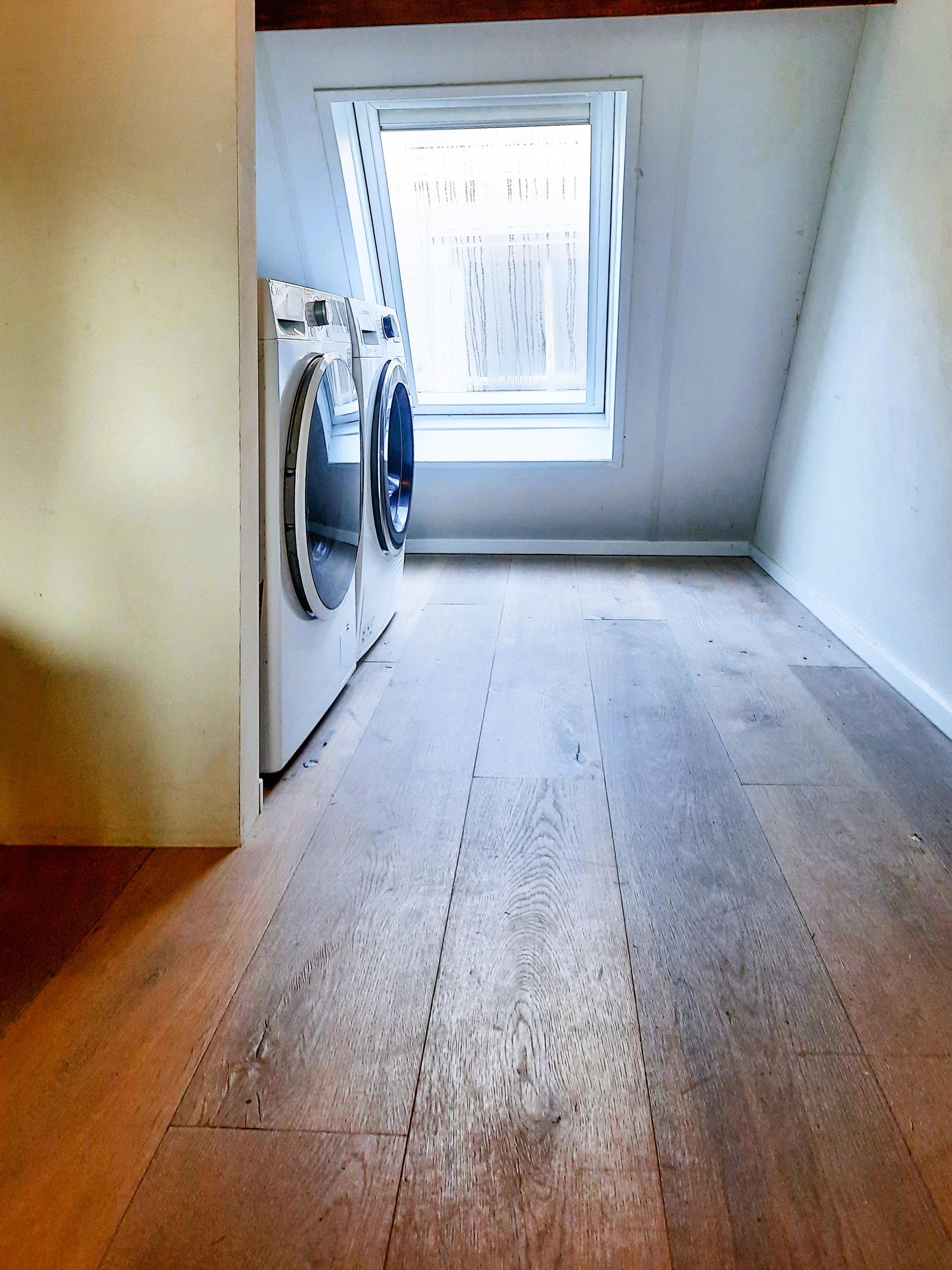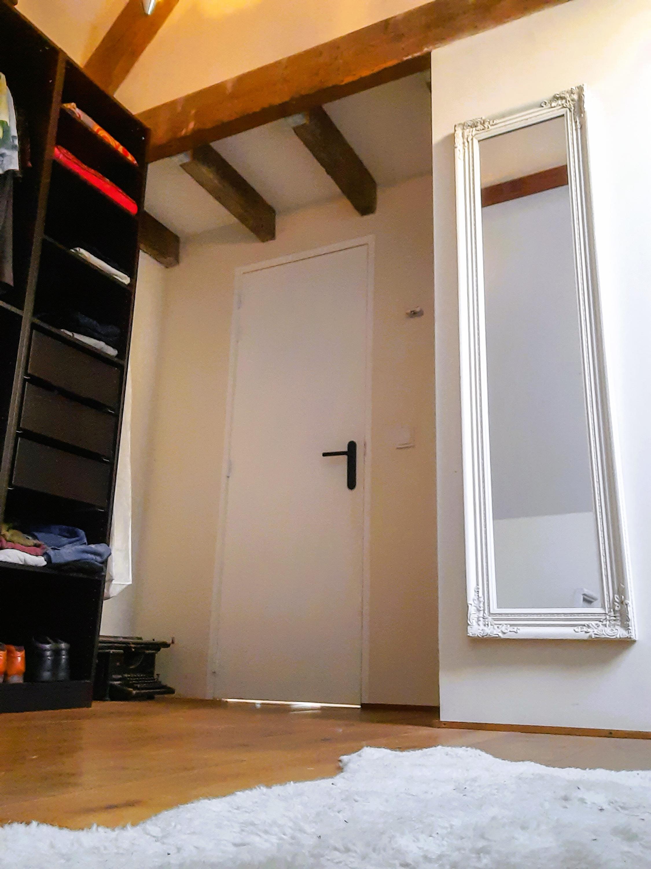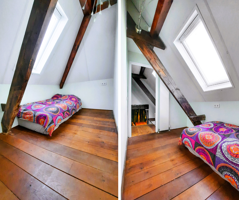 Verdieping 2,5: via de natuurlijk planken trap komt u uit op de overloop/ wasruimte, voorzien van wasmachine en droger. De onderhoudsruimte (HR ketel met luchtafvoer) zit achter de deur verscholen. Rechts bevindt zich de derde slaapkamer; een speelse ruimte met vele mogelijkheden. Ook deze kamer heeft een hoogte van 3,70 meter, biedt veel lichtinval en een fraai uitzicht op de kerktoren. Boven de hal is nog een bergzolder aanwezig.