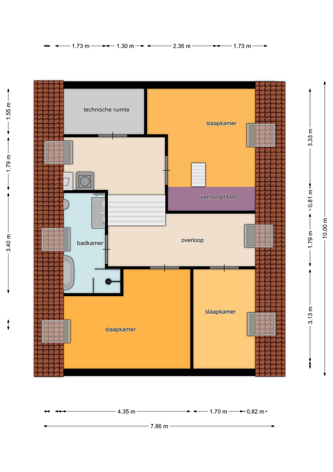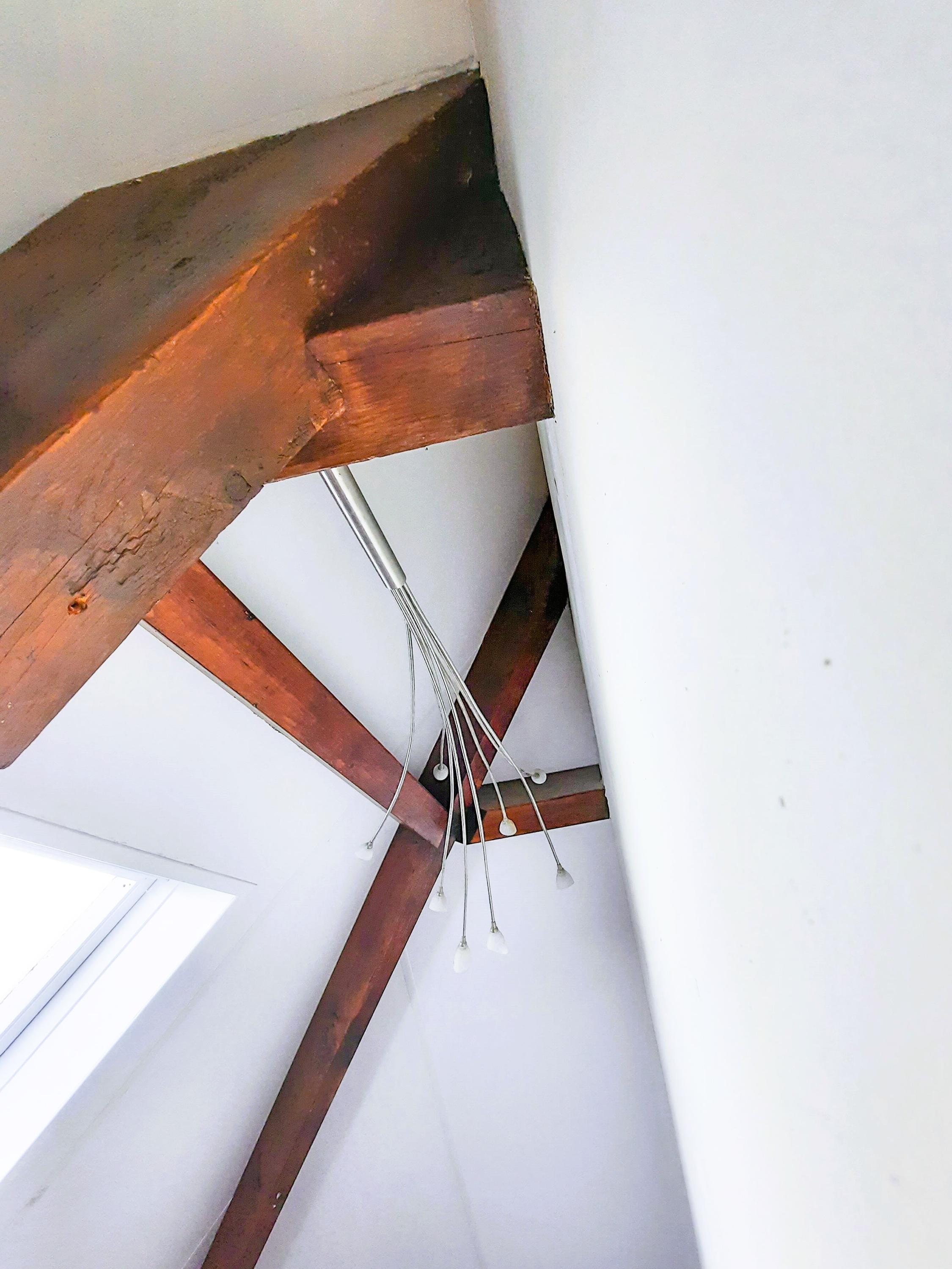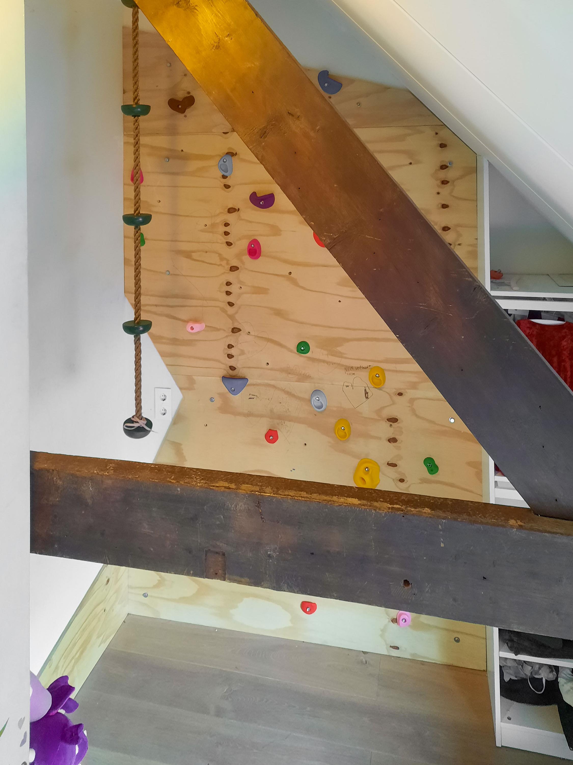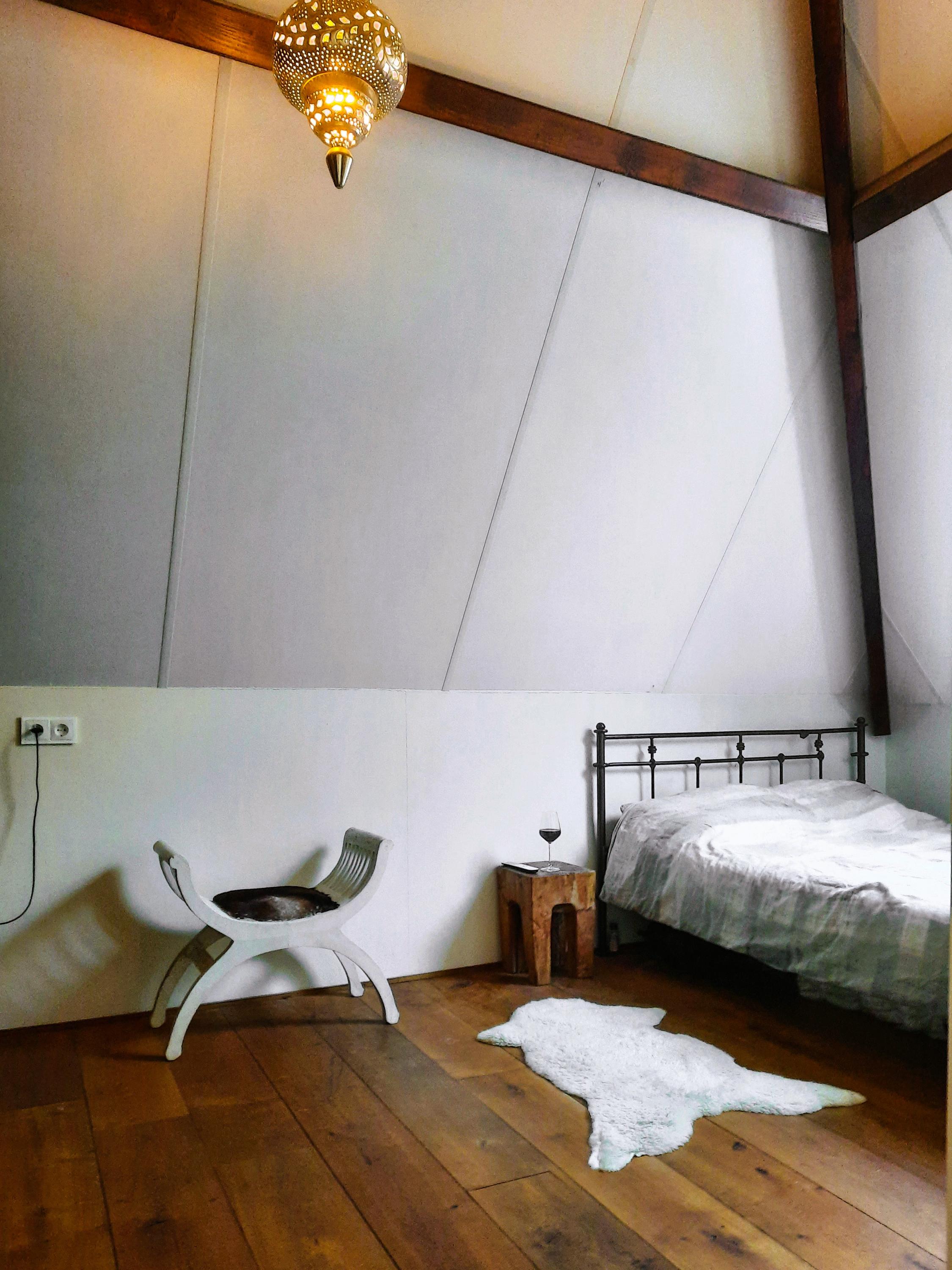 Verdieping 2,5: via de natuurlijk planken trap komt u uit op de overloop/ wasruimte, voorzien van wasmachine en droger. De onderhoudsruimte (HR ketel met luchtafvoer) zit achter de deur verscholen. Rechts bevindt zich de derde slaapkamer; een speelse ruimte met vele mogelijkheden. Ook deze kamer heeft een hoogte van 3,70 meter, biedt veel lichtinval en een fraai uitzicht op de kerktoren. Boven de hal is nog een bergzolder aanwezig.