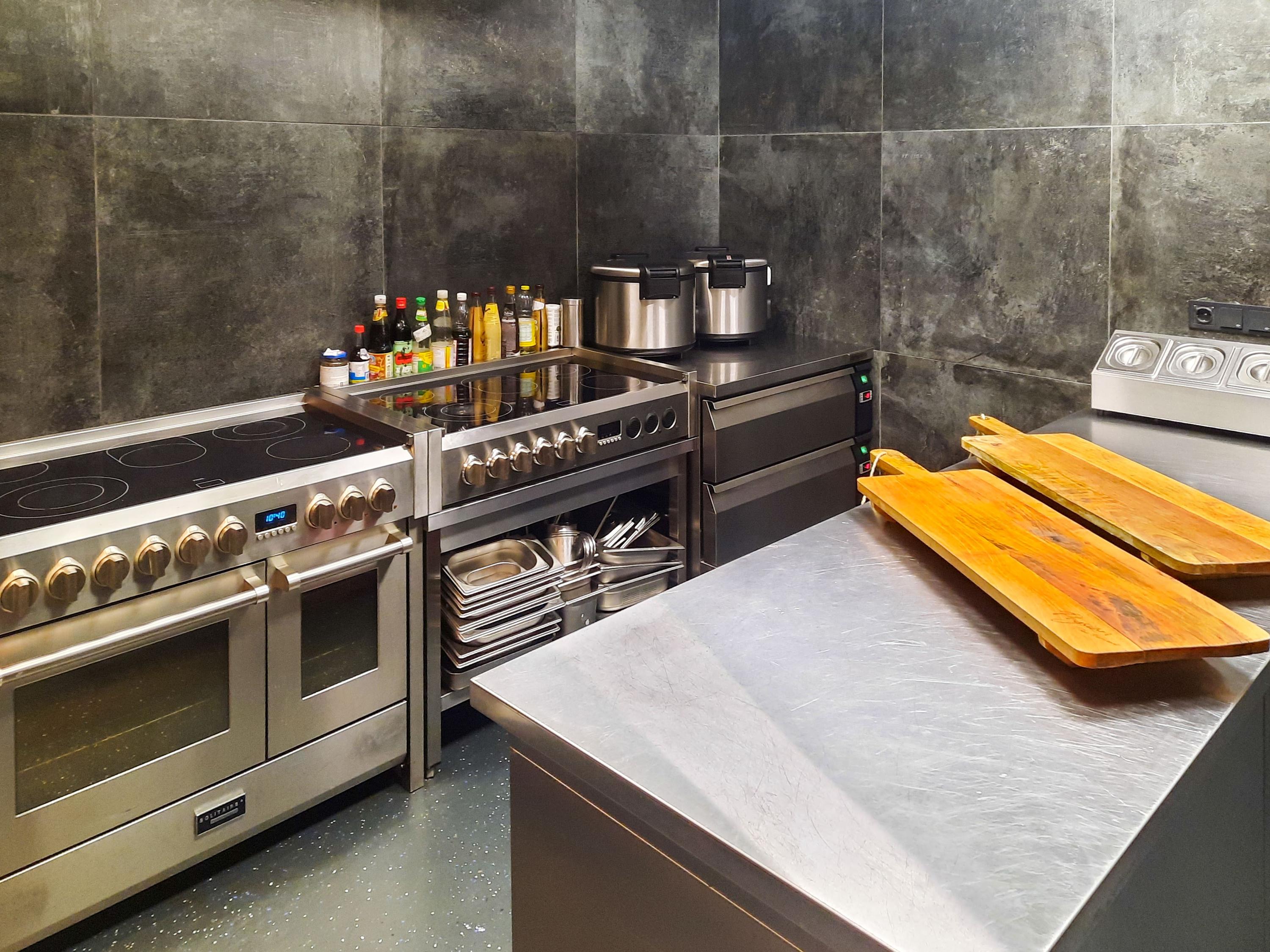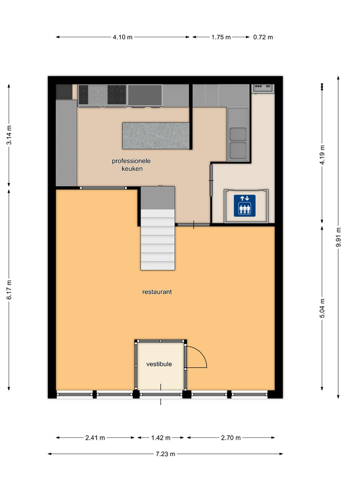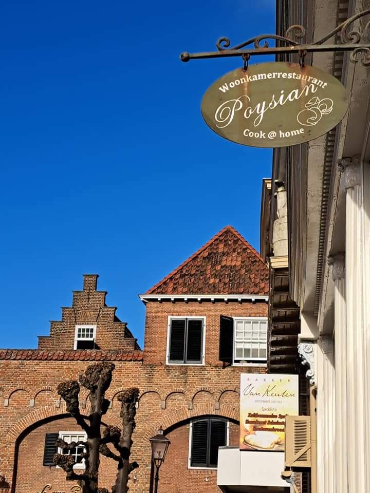Bij binnenkomst is de oude houten eiken vloer authentiek gelegd. De nostalgische schouw met gele ijseltjes geven de een klassieke uitstaling aan dit restaurant samen met de mooie brede eiken trap wordt de sfeer gecreëerd. Links van de trap is het aanzicht naar de open keuken en rechts naar de ingang van de spoelkeuken. Onder de trap is de mogelijkheid om de aanwezige middeleeuwse kelders te betreden waar zelfs de originele kalkafwerking te zien is. In de kelders is de optie om een toiletgroep te maken. In de ruime professionele keuken staan een vele nieuwe apparaten (gasloos) waaronder een warmhoudkast, koel- en vriesladekast en afzuigkap. De spoelkeuken is van alle gemakken voorzien met veel extra opbergruimte.