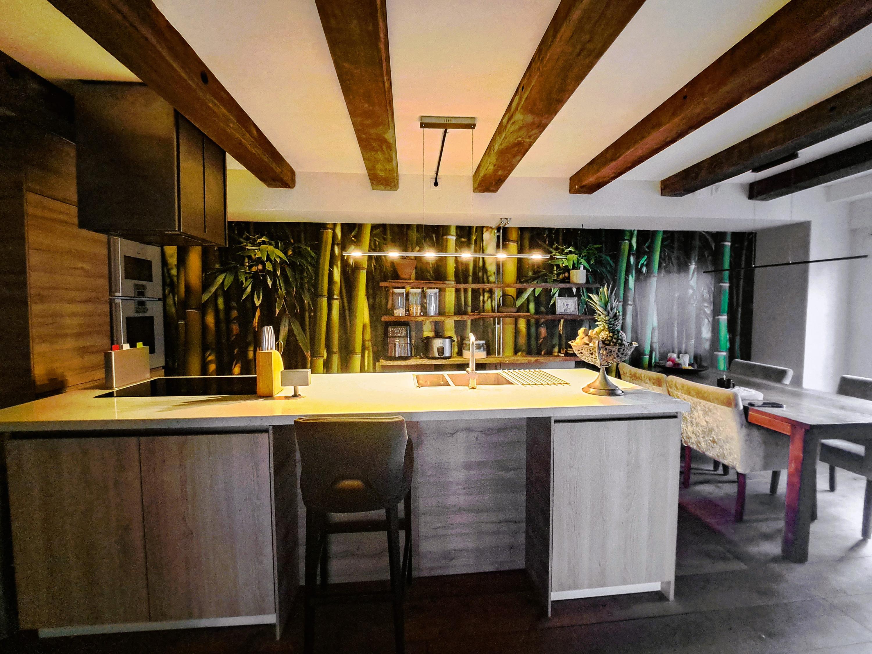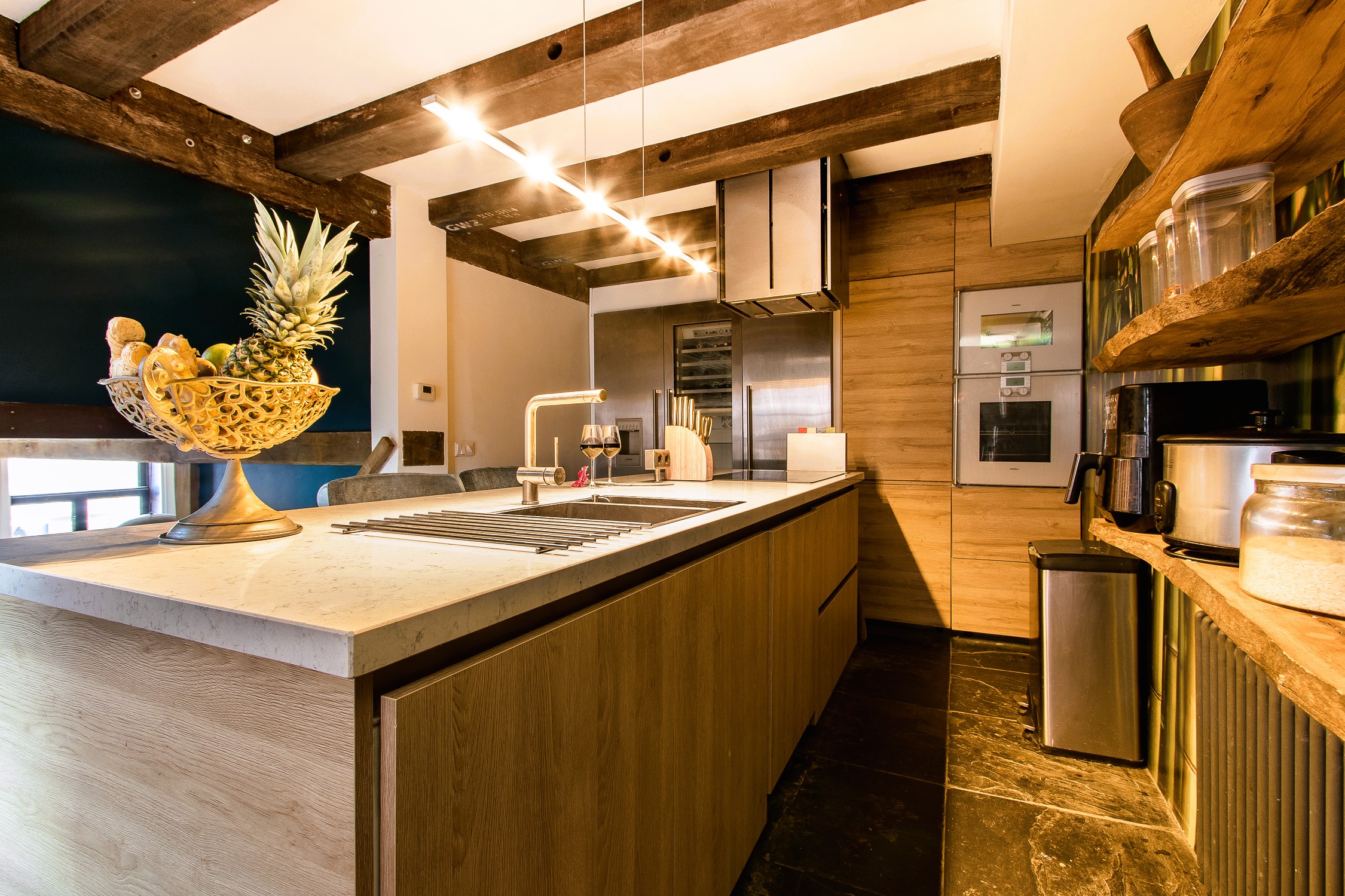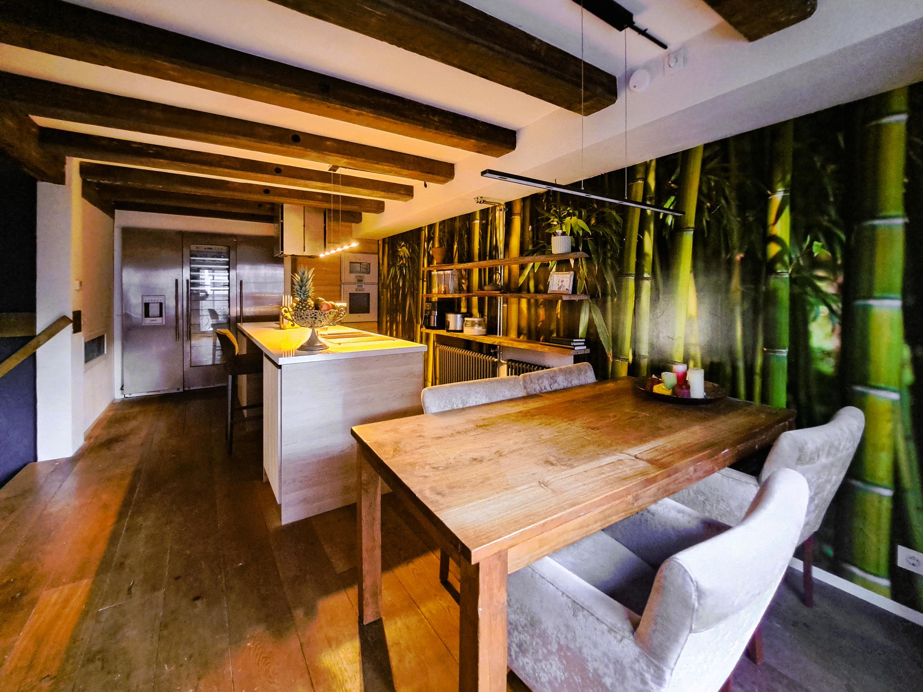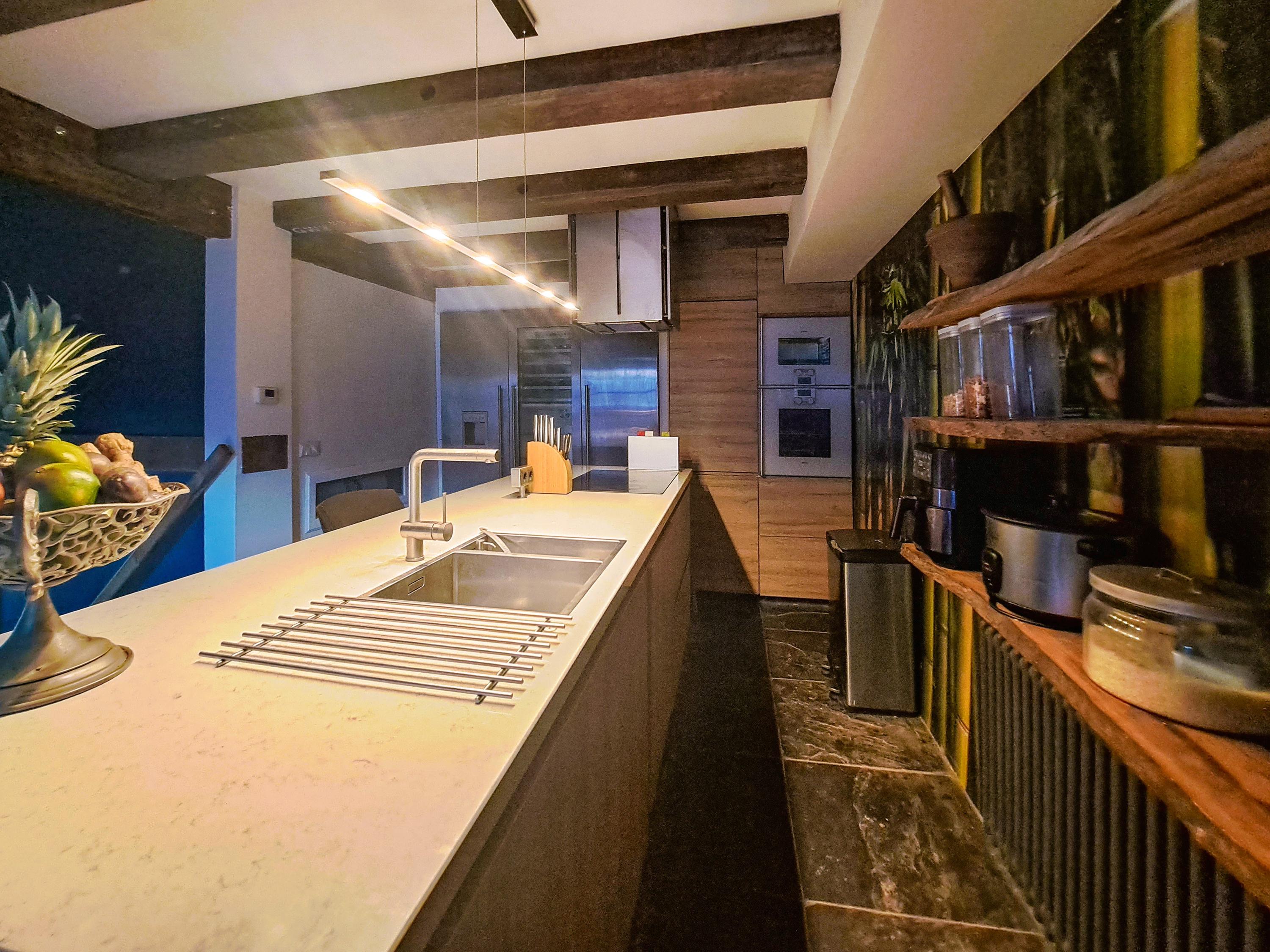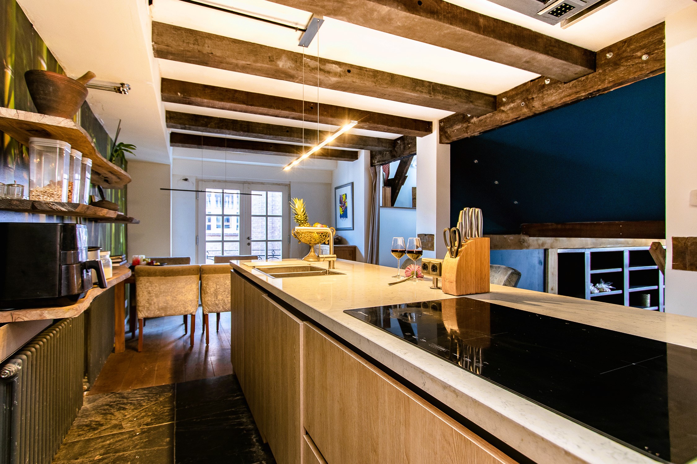 Split level: met een fraaie eiken trap gaat u naar de woonkeuken. Het kook- en spoeleiland geeft uitzicht naar de woonkamer en staat zo in verbinding met elkaar. Voorzien van Siemens-flex-systeem, Siemens vaatwasser met Gaggenau stoomoven en oven van alle gemakken voorzien. De openslaande deuren genieten van de ochtendzon met uitzicht op de kerktoren van Zaltbommel waar u vanaf de eettafel van kan genieten.