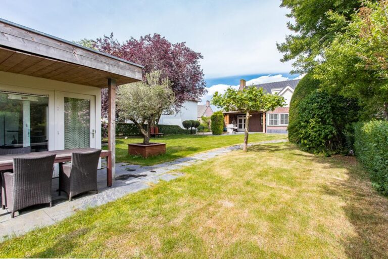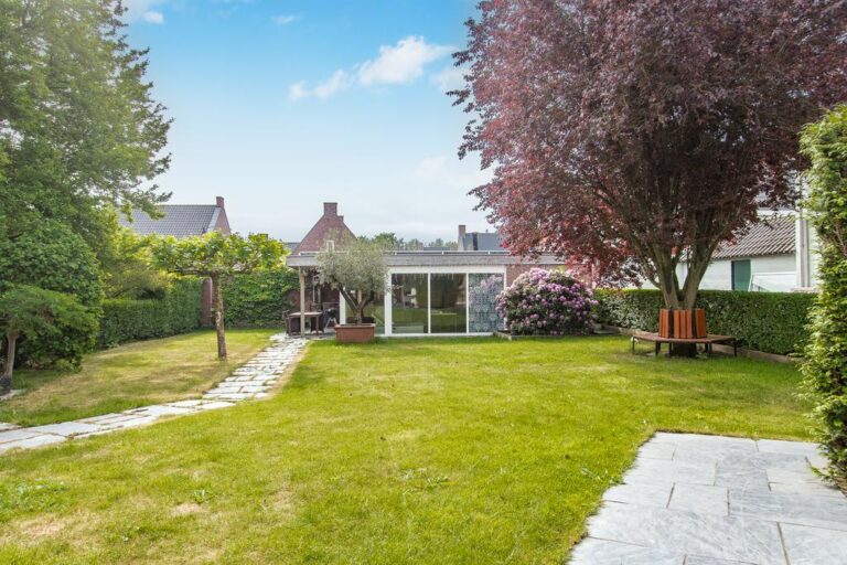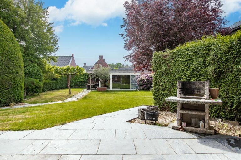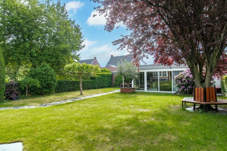 Aan de achterzijde bevindt zich de vrij gelegen achtertuin met zonnige ligging op het zuidoosten. De riante tuin is fraai aangelegd met moderne terrastegels, gazon, diverse bomen en beplantingen en is voorzien van sfeervolle overkapping. Tevens beschikt de achtertuin over een royaal buitenverblijf.