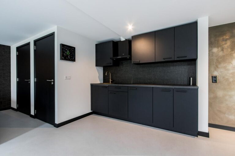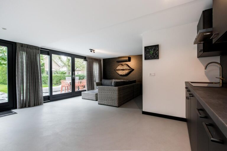 Indeling woonhuis: aan de voorzijde van de woning is de entree gesitueerd. In de hal bevindt zich de meterkast en trapopgang naar de verdieping. De hal geeft toegang tot de slaapkamer-/kantoor en woonkeuken. De royale woonkeuken van maar liefst ca. 40 m² is voorzien van een luxe uitgevoerde keuken met eikenhouten frontjes, granieten aanrechtblad en diverse inbouwapparatuur. De woonkeuken geeft toegang tot de kelder, toiletruimte en ruime woonkamer van ca. 30 m². De slaapkamer kan eveneens in gebruik worden genomen als kantoorruimte of speelkamer. Hier bevindt zich een personenlift.