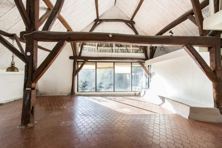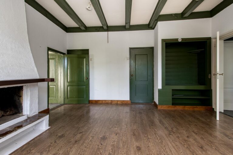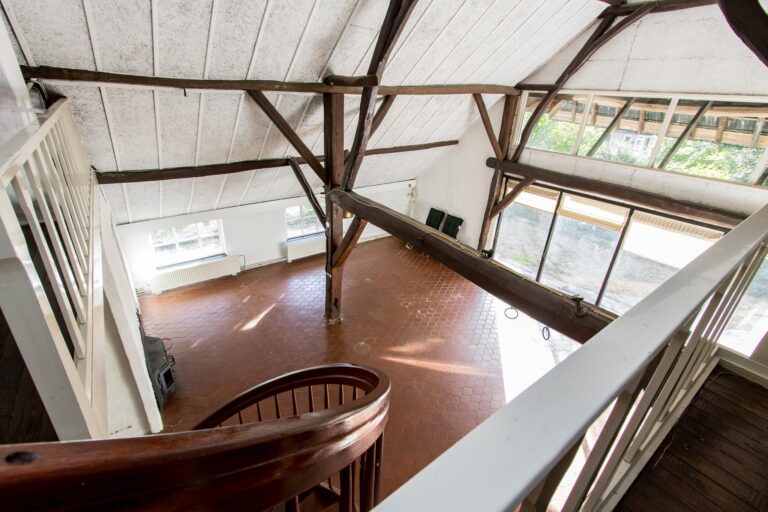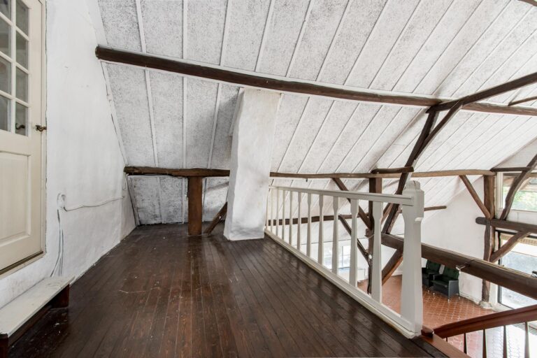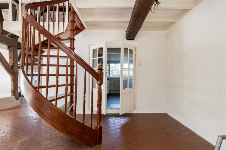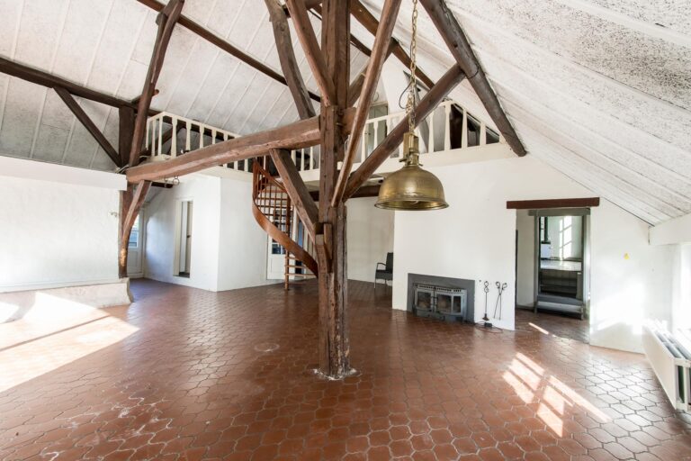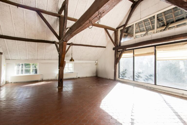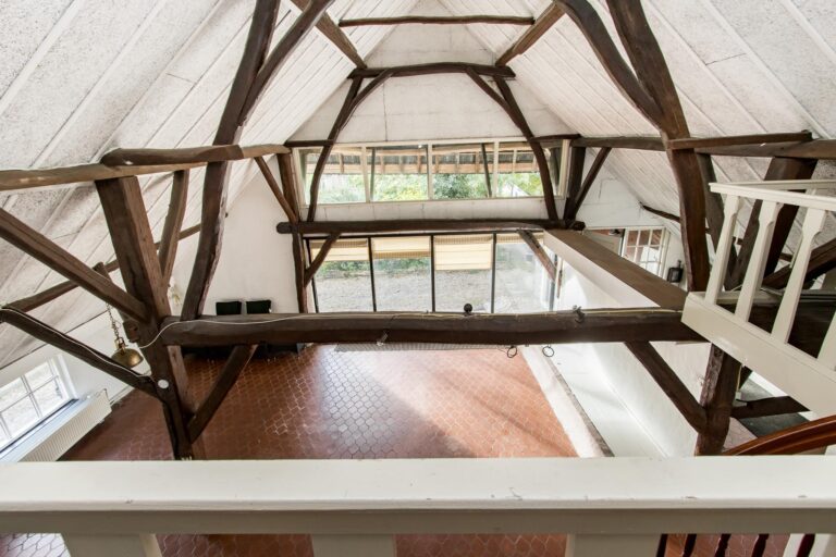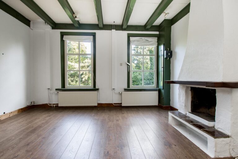Binnen stap je een wereld van ruimte en karakter in. De enorme woonkamer van ca. 70 m² ademt sfeer door de hoge nok en de authentieke spanten die in het zicht zijn gelaten. De open haard maakt het helemaal af: hier kun je je avonden in alle rust doorbrengen. Vanuit de woonkamer stap je zo de zijtuin in via de openslaande tuindeuren.