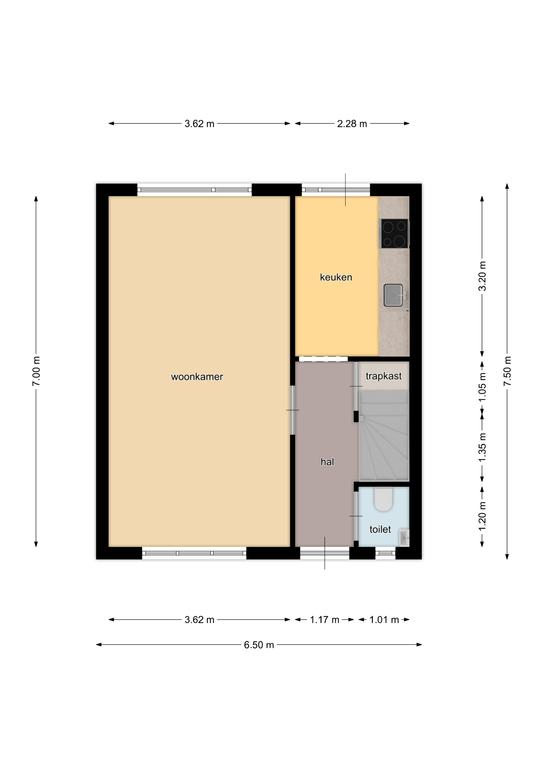 Indeling woonhuis: aan de voorzijde is de entree gesitueerd. In de hal bevindt zich de toiletruimte, meterkast, trapopgang naar verdieping en vaste kast. Vanuit hier heeft u toegang tot de ruime doorzonwoonkamer en dichte keuken v.v. een landelijke keukenunit met diverse inbouwapparatuur zoals; elektrische kookplaat met afzuigkap, oven, magnetron, koelkast en vaatwasser.