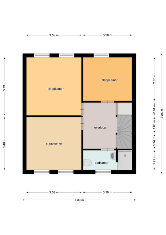 Eerste verdieping: overloop toegang gevend tot 3 ruime slaapkamers en badkamer v.v. douche, wandcloset en wastafel.