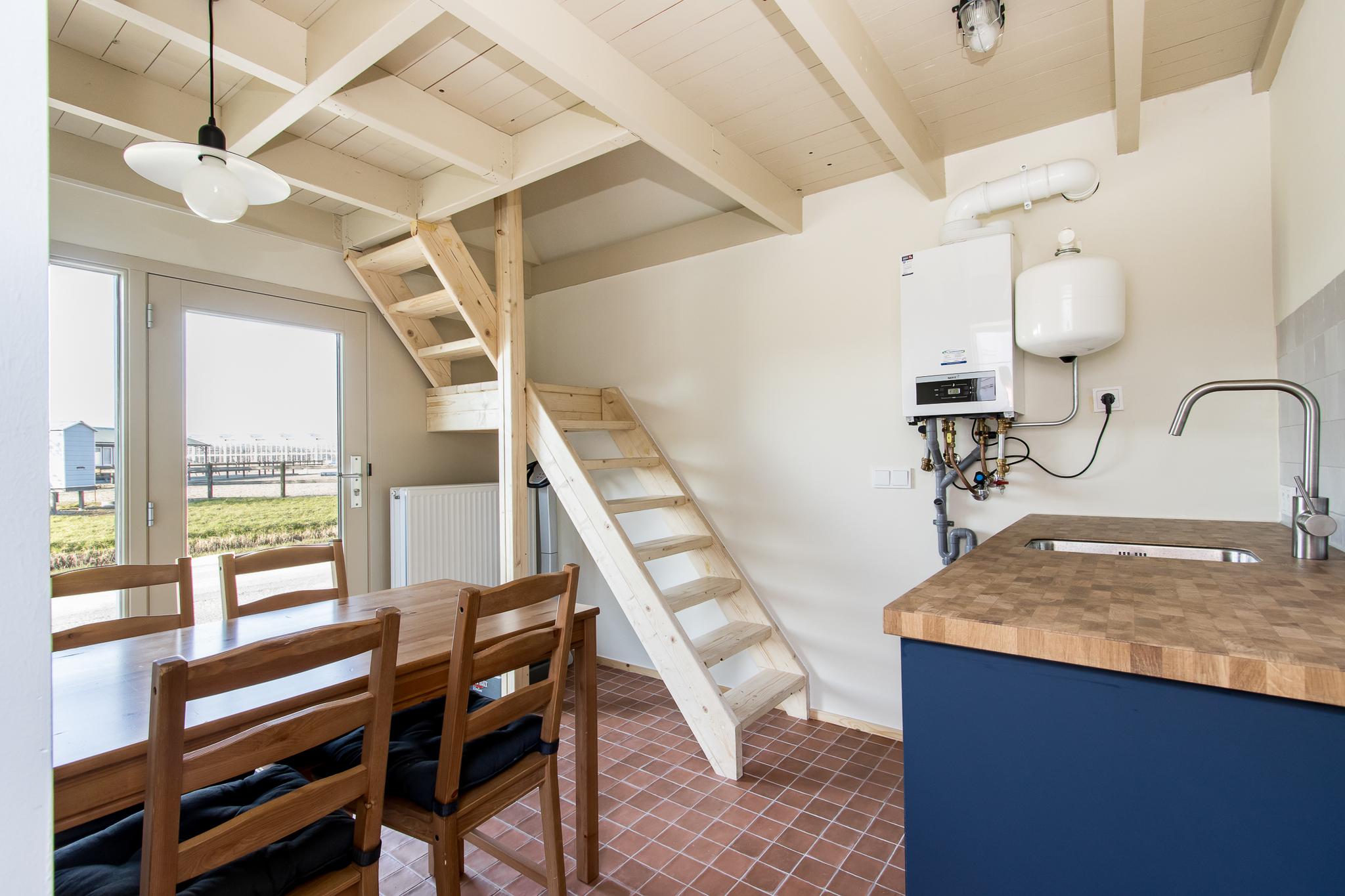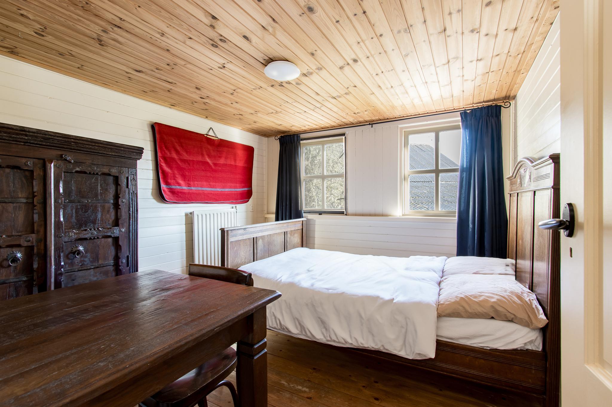 Indeling bijgebouw 1: het knusse bijgebouw bevindt zich aan de rechterzijde van de woning en is voorzien van open ruimte met klein keukenblok en zitkamer met pelletkachel. Aan de achterzijde is er een badkamer met douche, toilet en wastafel. Op de verdieping zijn er twee slaapruimtes gecreëerd. Buiten maakt de sfeervolle overkapping het plaatje compleet.