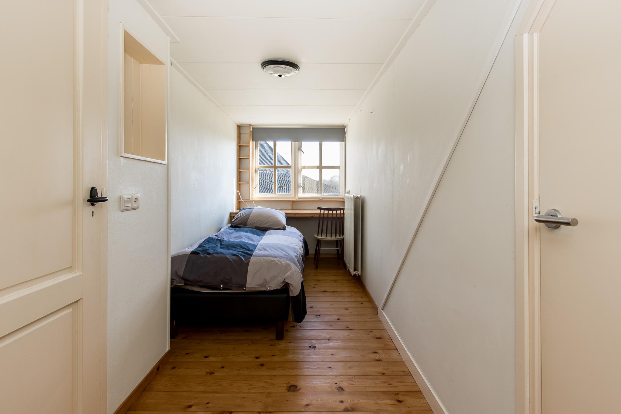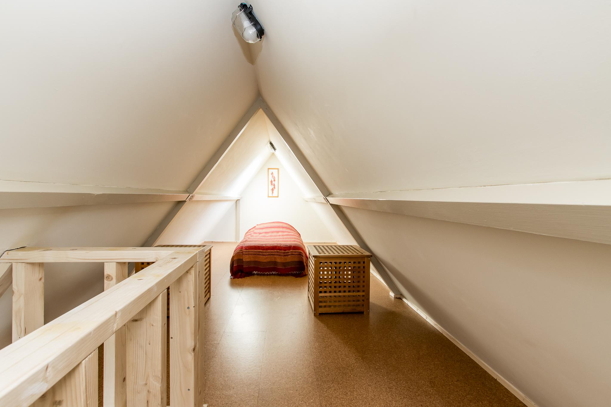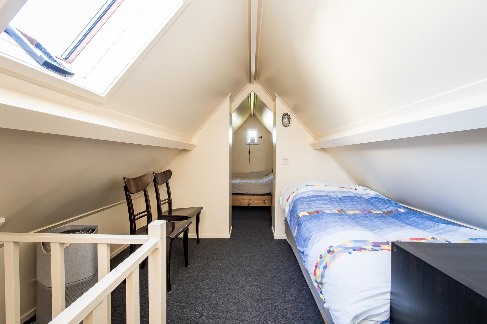 Eerste verdieping: de overloop leidt naar drie slaapkamers, een aantal vaste kastruimte en toiletruimte met wastafel. De vierde slaapkamer is toegankelijk via één van de andere slaapkamers. Door het weghalen van het wandje tussen de derde en vierde slaapkamer ontstaat er één grote (slaap)kamer.