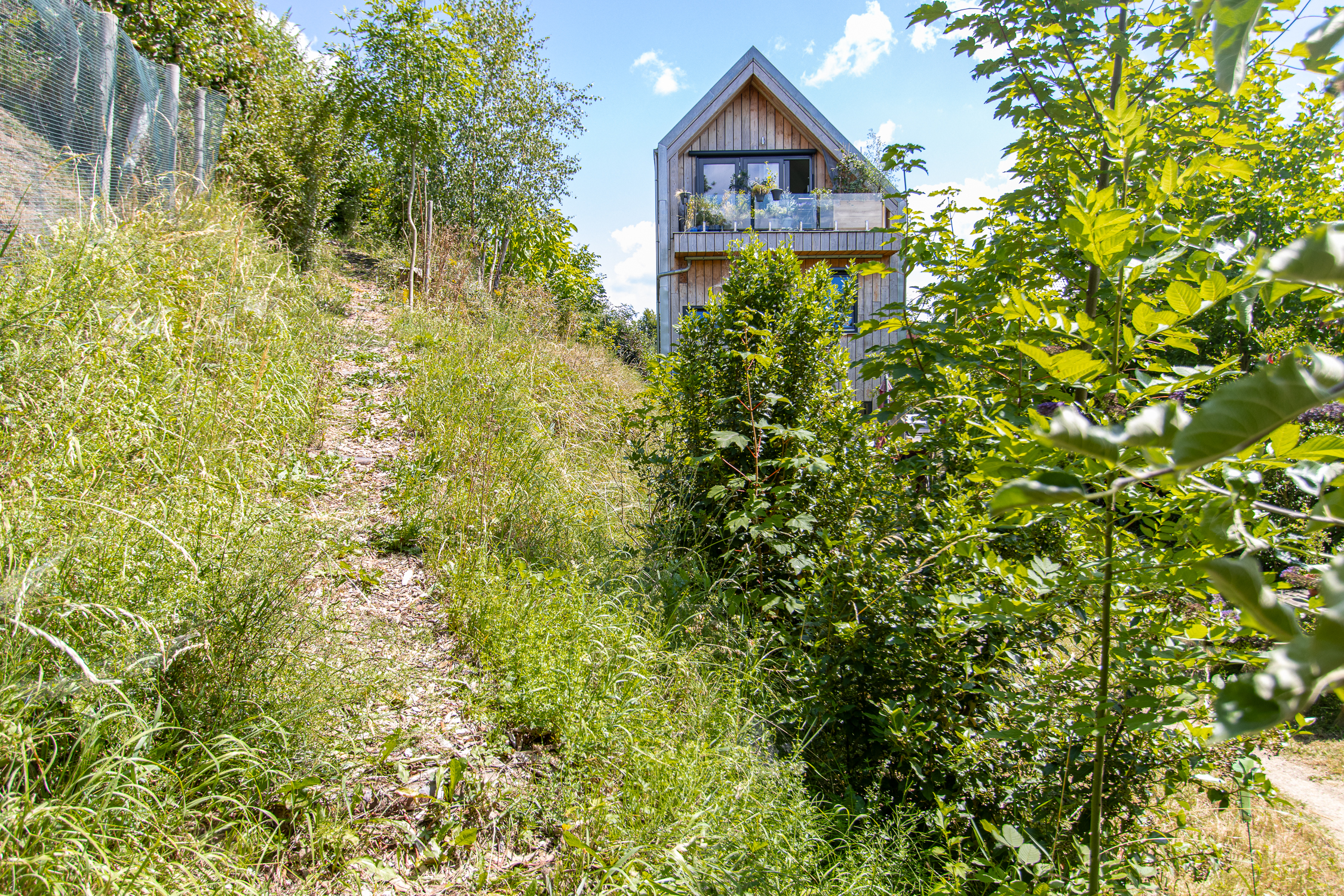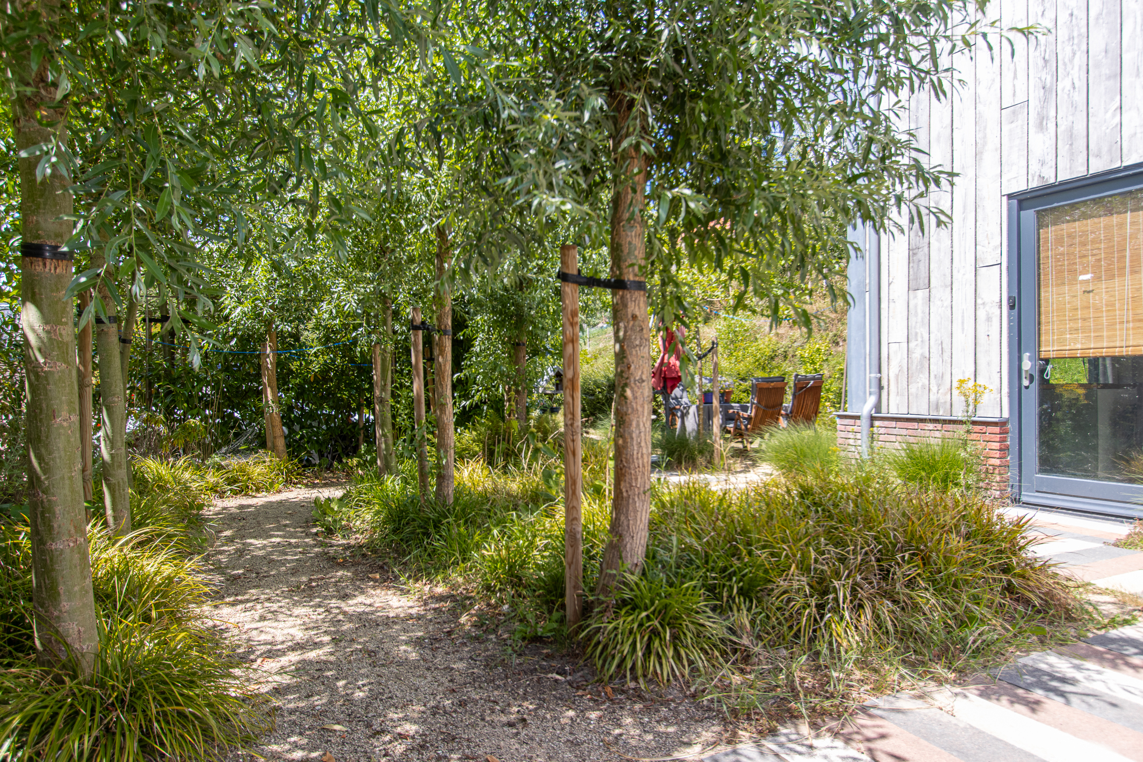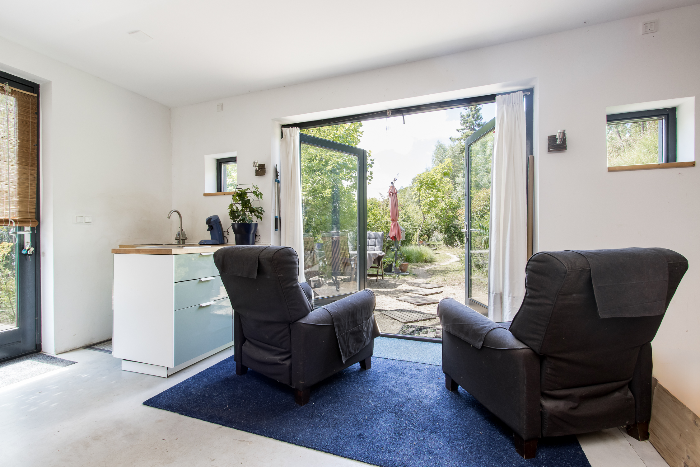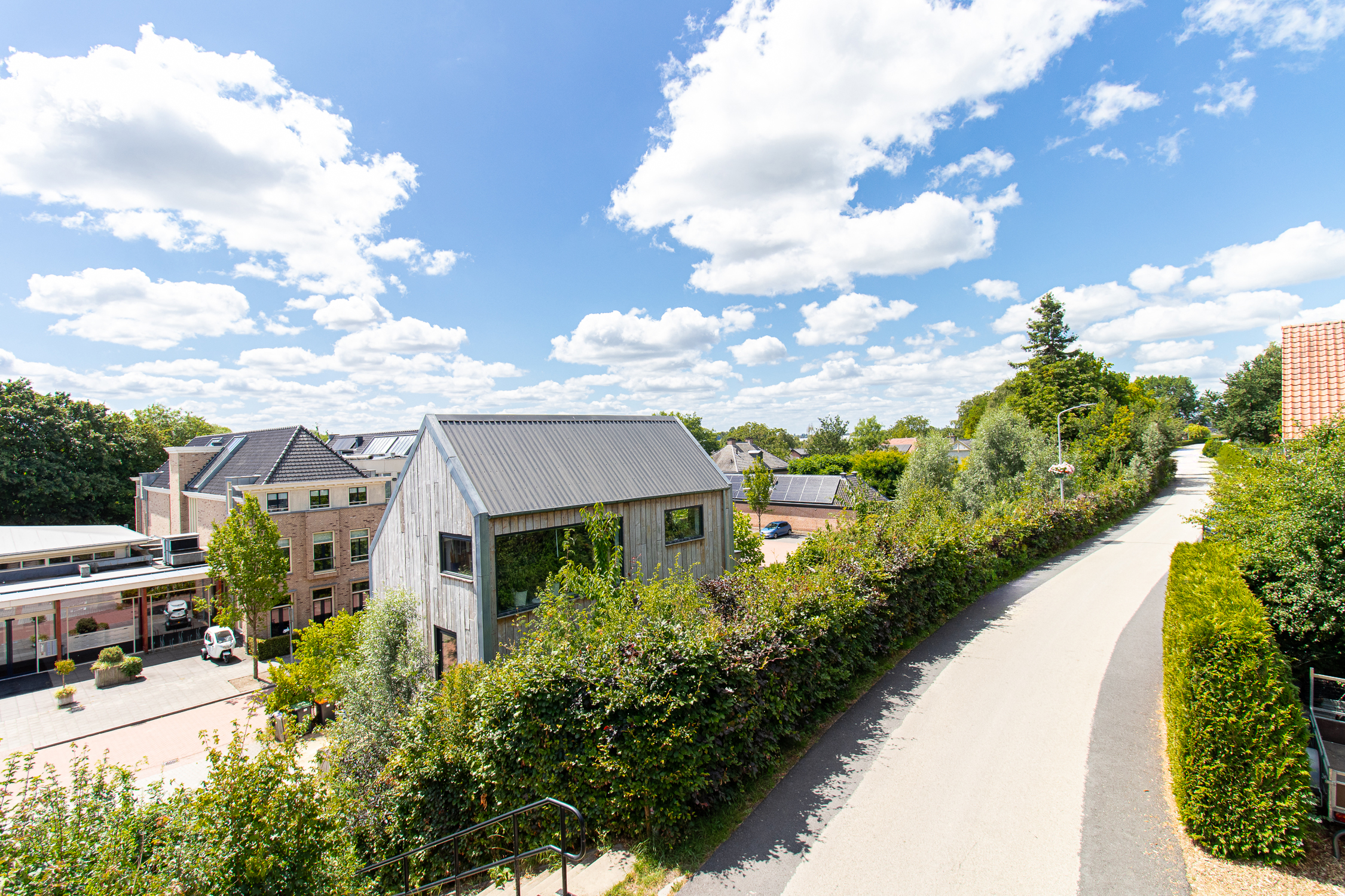 duurzaam Douglas hout. Het volledig geïsoleerde pand is o.a voorzien van een warmtepomp en zonnepanelen.