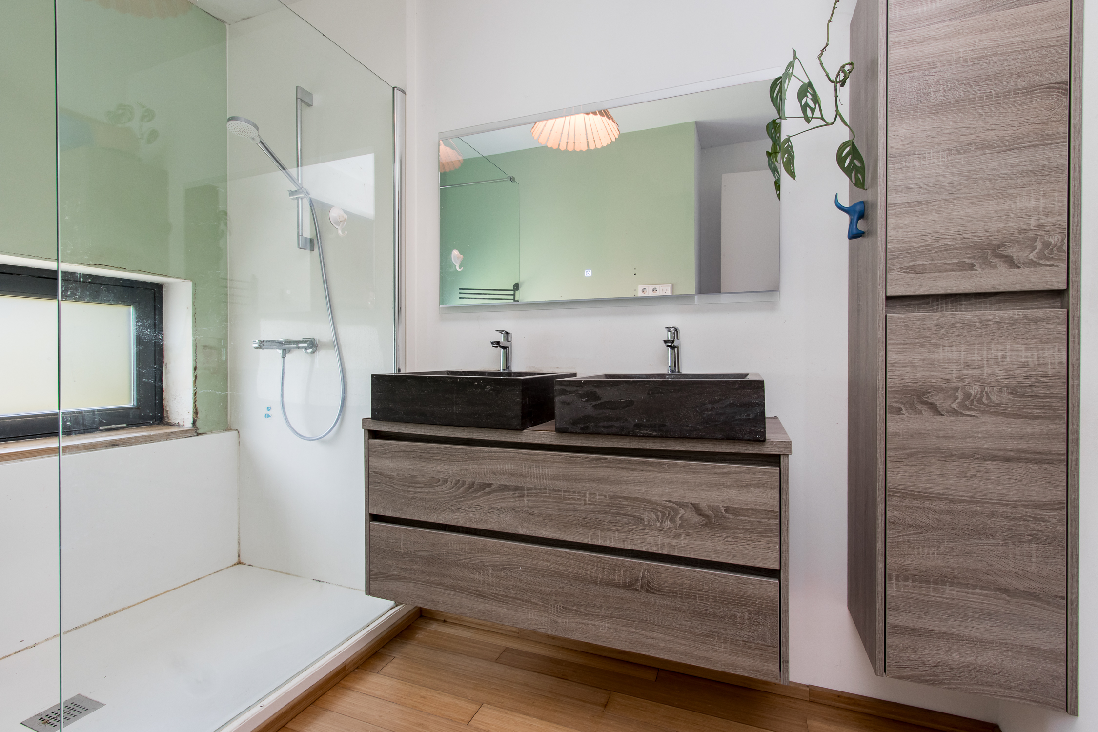 Op de eerste verdieping bevinden zich momenteel 2 slaapkamers waarbij de grote slaapkamer teruggebracht kan worden naar de van origine 2 aparte kamers zodat in totaal 3 slaapkamers beschikbaar zijn. Elke ruimte heeft een eigen deur, raam, verwarmingsbediening en verlichting. De badkamer is voorzien van een ruime inloopdouche met antislip vloer, en wastafelmeubel met dubbele wasbak.