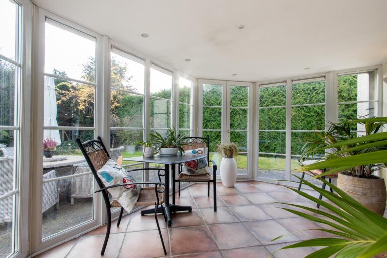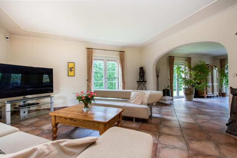 De royale woonkamer met serre, salon en living zorgen dankzij de overvloedige aanwezigheid van openslaande deuren voor veel licht en creëren een naadloze connectie tussen binnen en buiten. De serre geeft direct toegang tot het terras en biedt een fraai uitzicht op de weelderige achtertuin. De woonkamer staat in half open verbinding met de keuken voorzien van een indrukwekkend fornuis, fraai betegelde schouw en ruime keukenkasten met inbouwapparatuur.