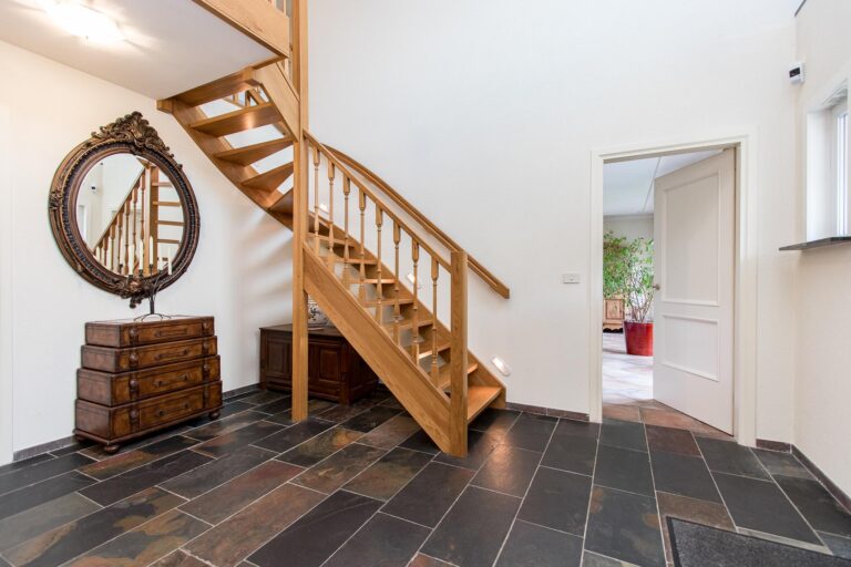 Begane grond: de imposante entree met dubbele voordeuren geeft toegang tot de royale ontvangsthal met toiletruimte, meterkast en personenlift. De prachtige compositie van het glas-in-lood venster in de entree zorgt voor een fraaie lichtinval. De open houten trap slingert elegant omhoog tot aan de ruime balustrade van de vide en de overloop, waardoor een indrukwekkende overgang ontstaat tussen de verschillende niveaus van het huis. De trap aan de dichte zijde is subtiel verlicht. Vanuit de hal zijn de woonkamer en keuken bereikbaar.