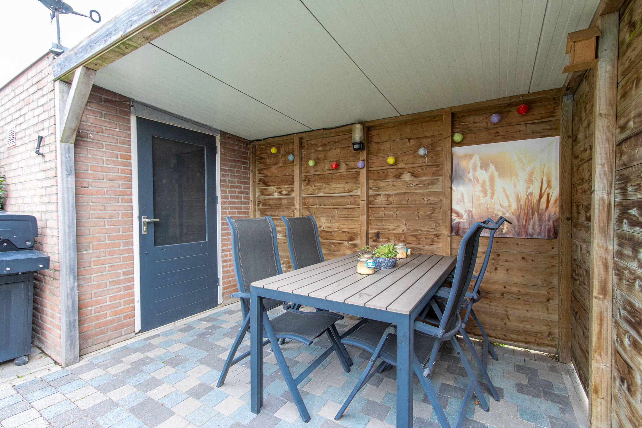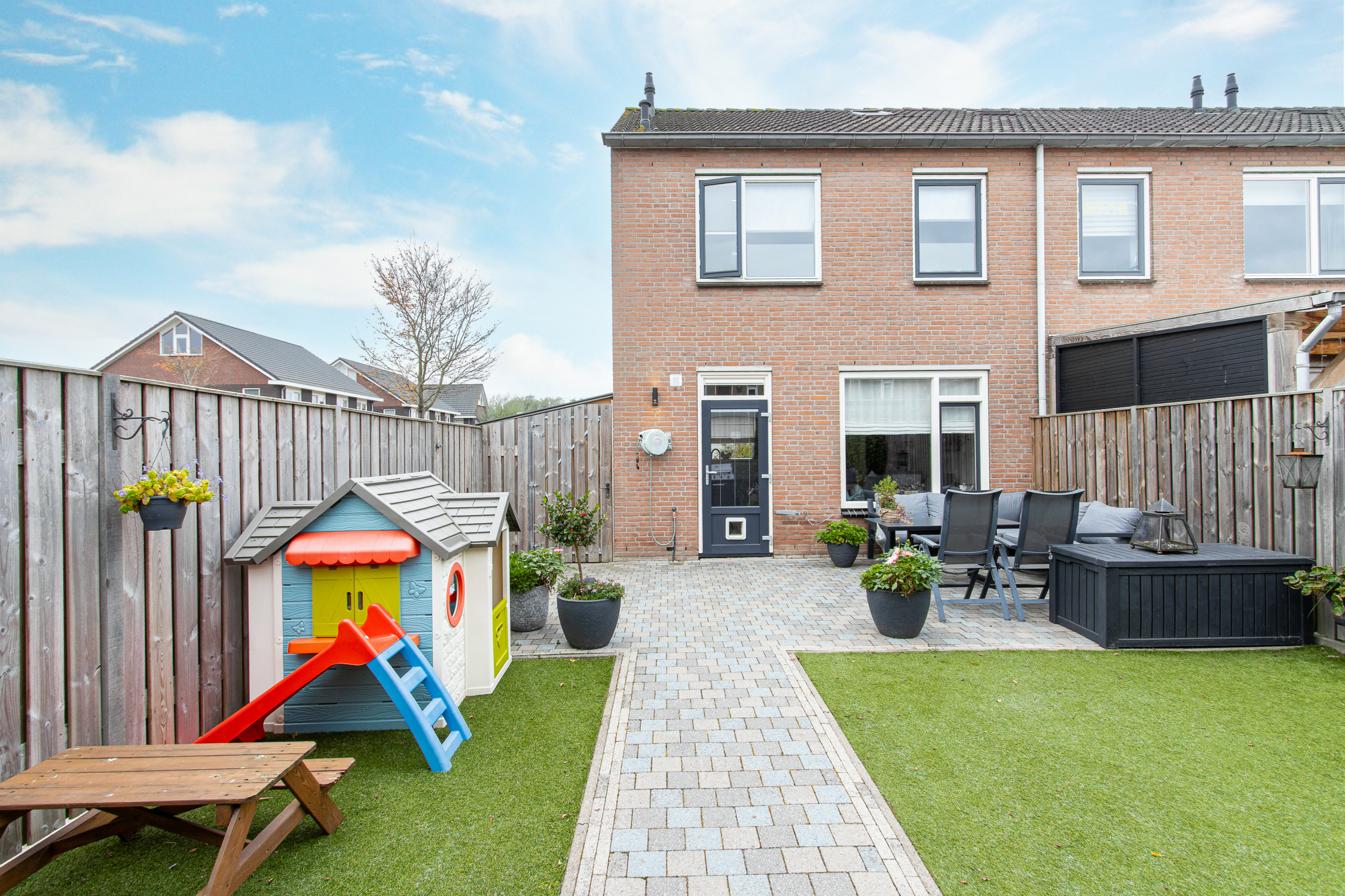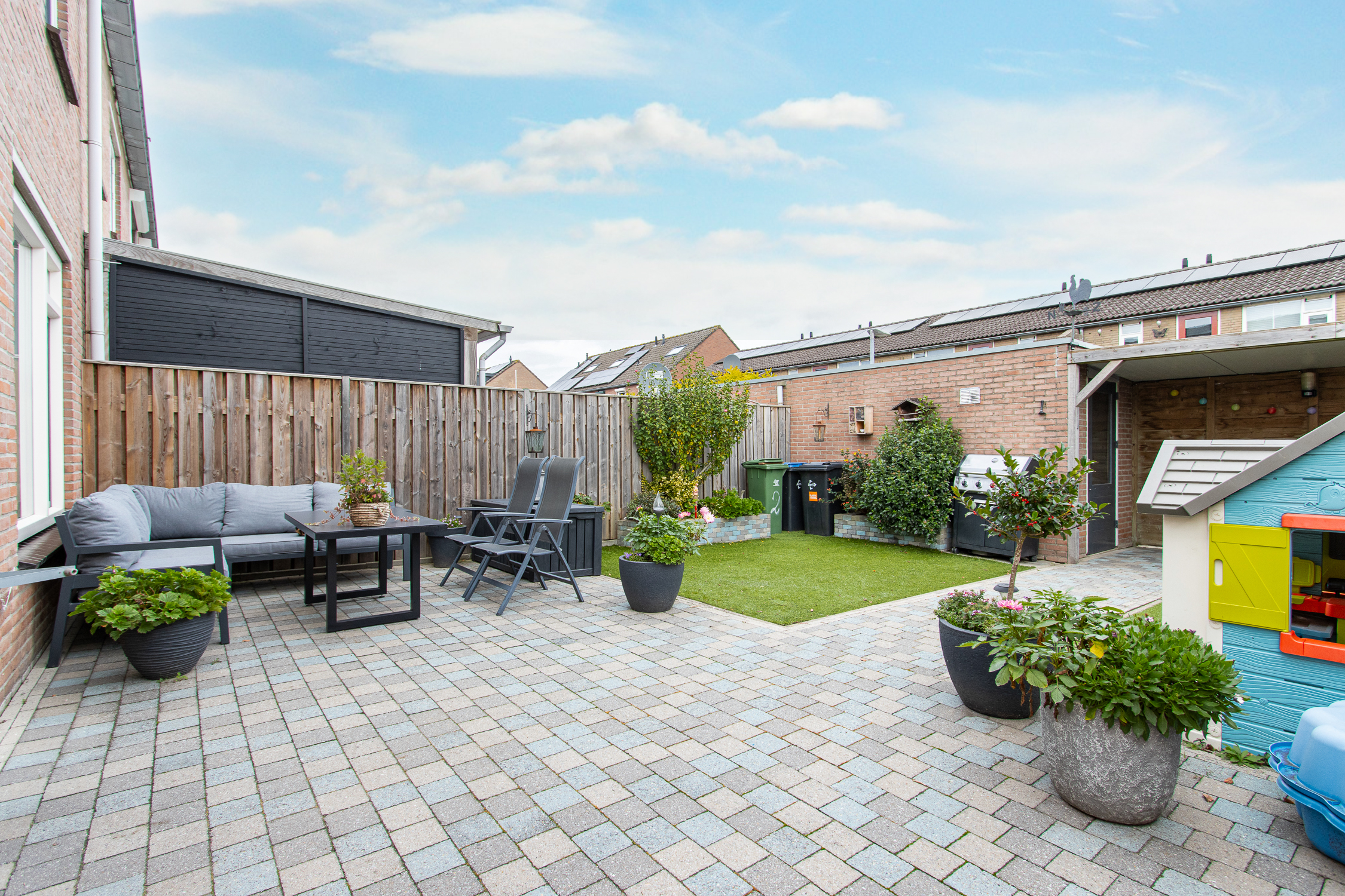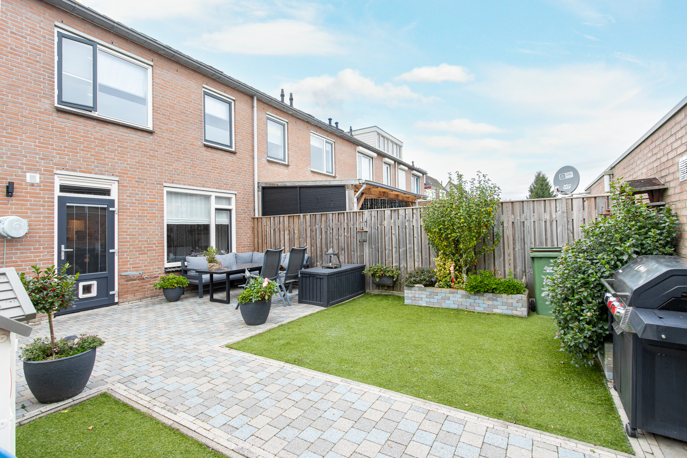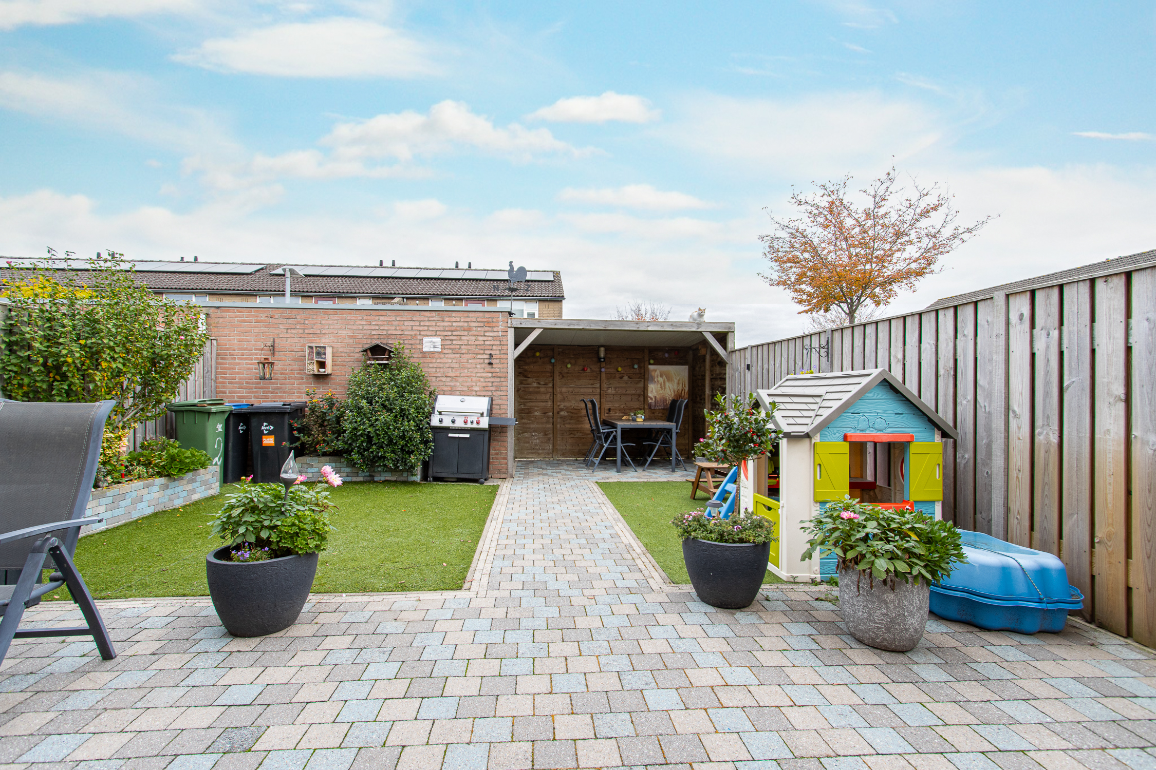 De woning beschikt over een verzorgde voor- en achtertuin. De achtertuin ligt op het noordoosten en is onderhoudsvriendelijk ingericht met sierbestrating, kunstgras, plantenborders, een houten schutting en een stenen berging met sfeervolle overkapping. Via de achterom is de tuin goed bereikbaar. Naast de woning bevindt zich bovendien een zeer ruime berging van circa 14 m² — ideaal voor fietsen, gereedschap of hobbyspullen.