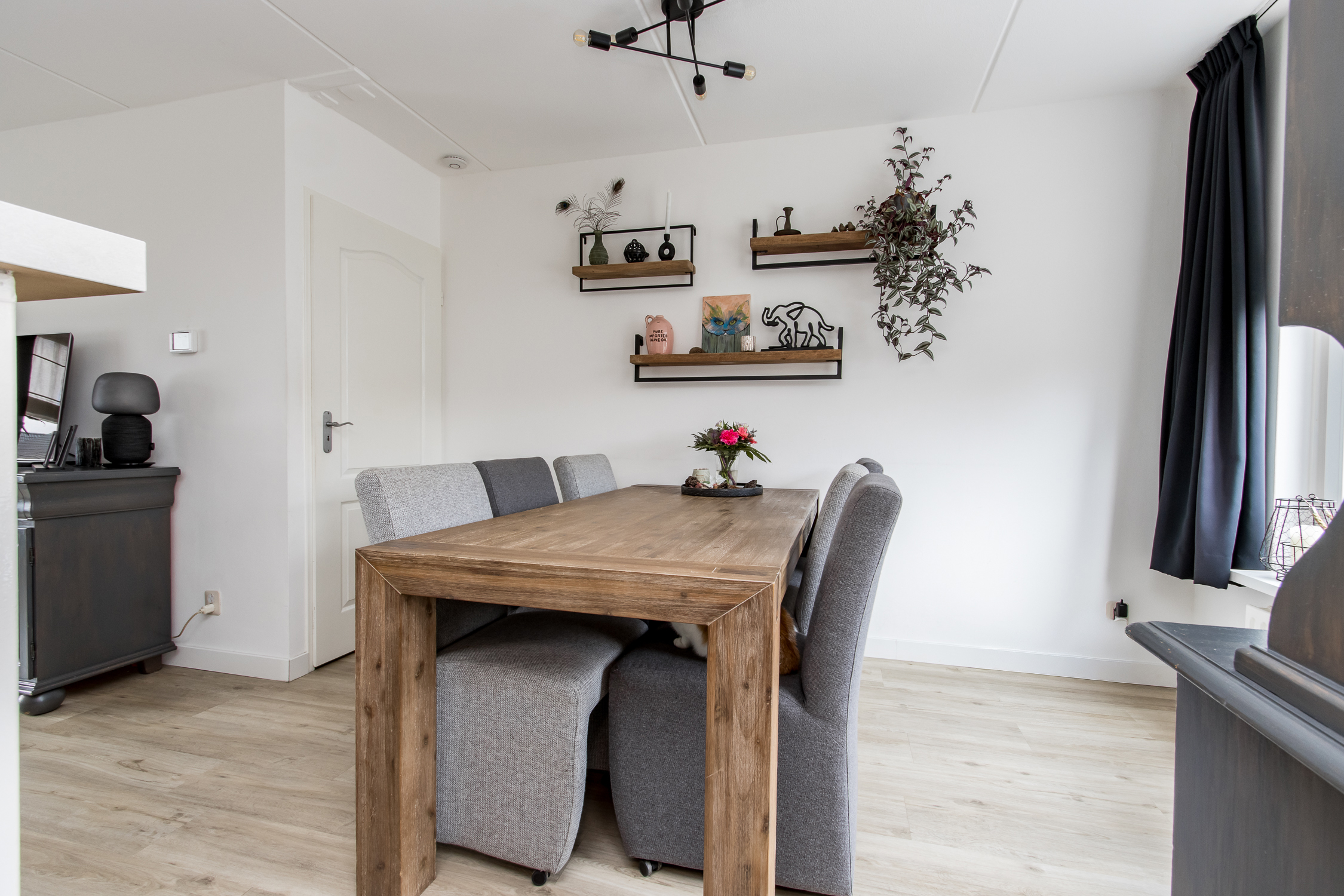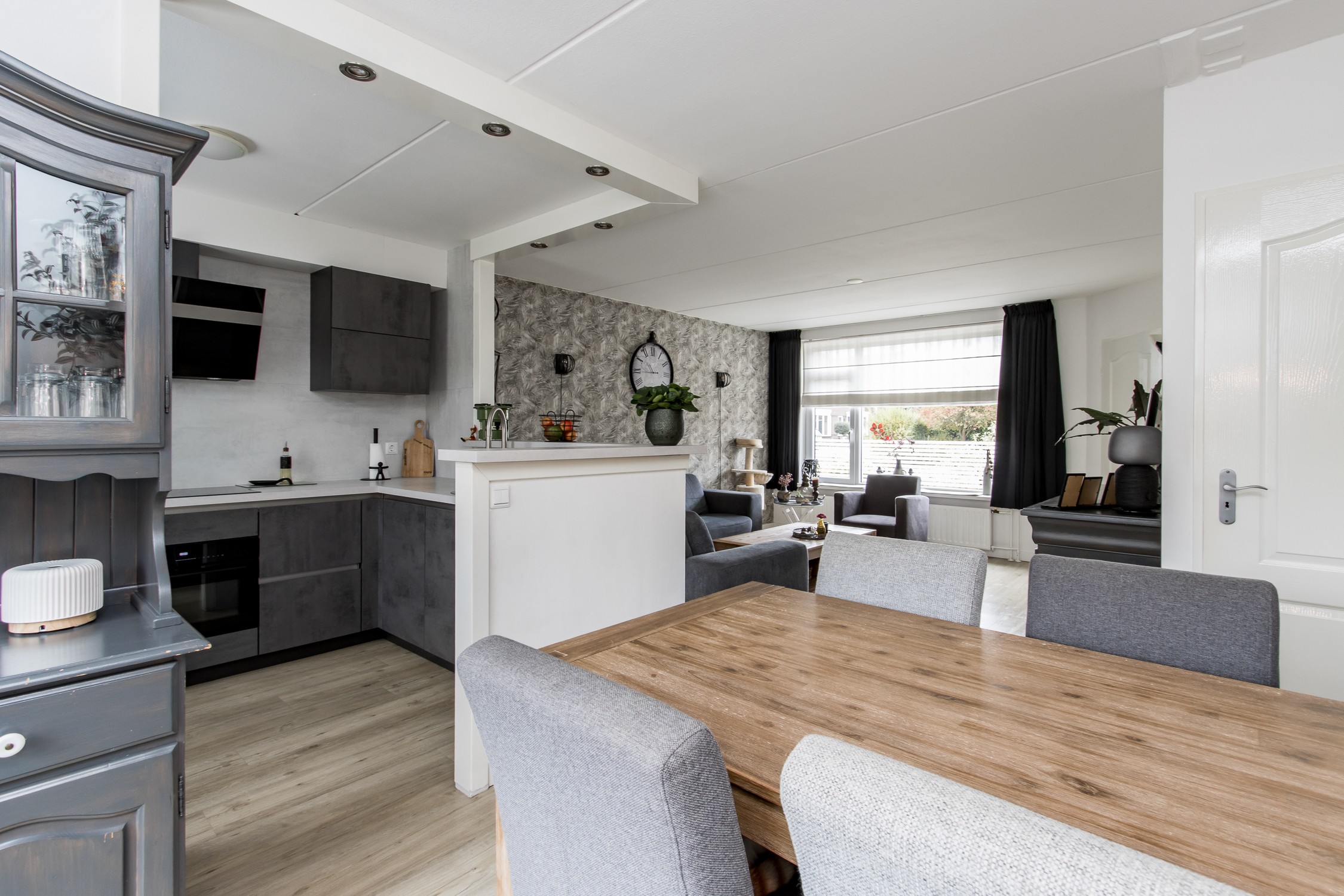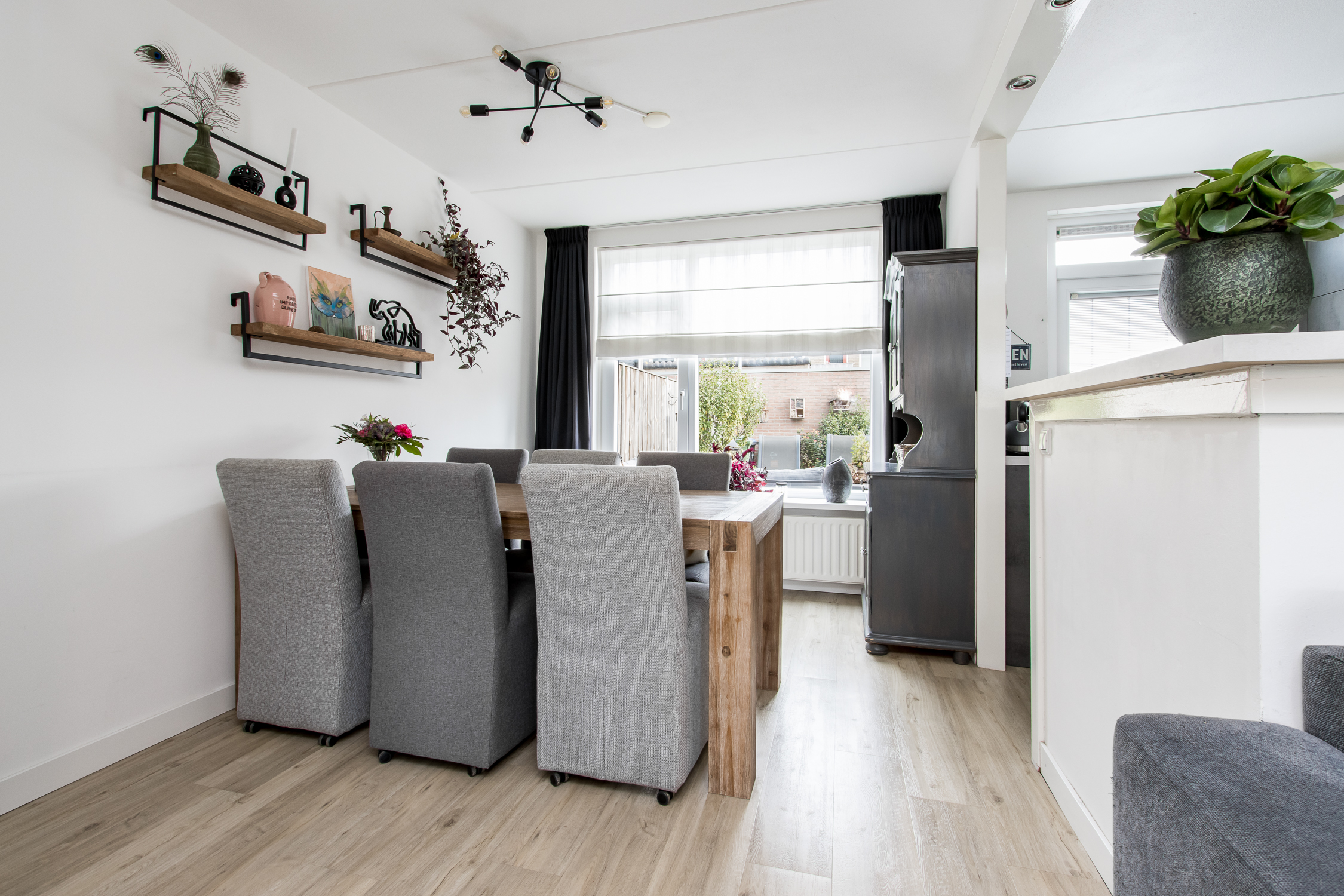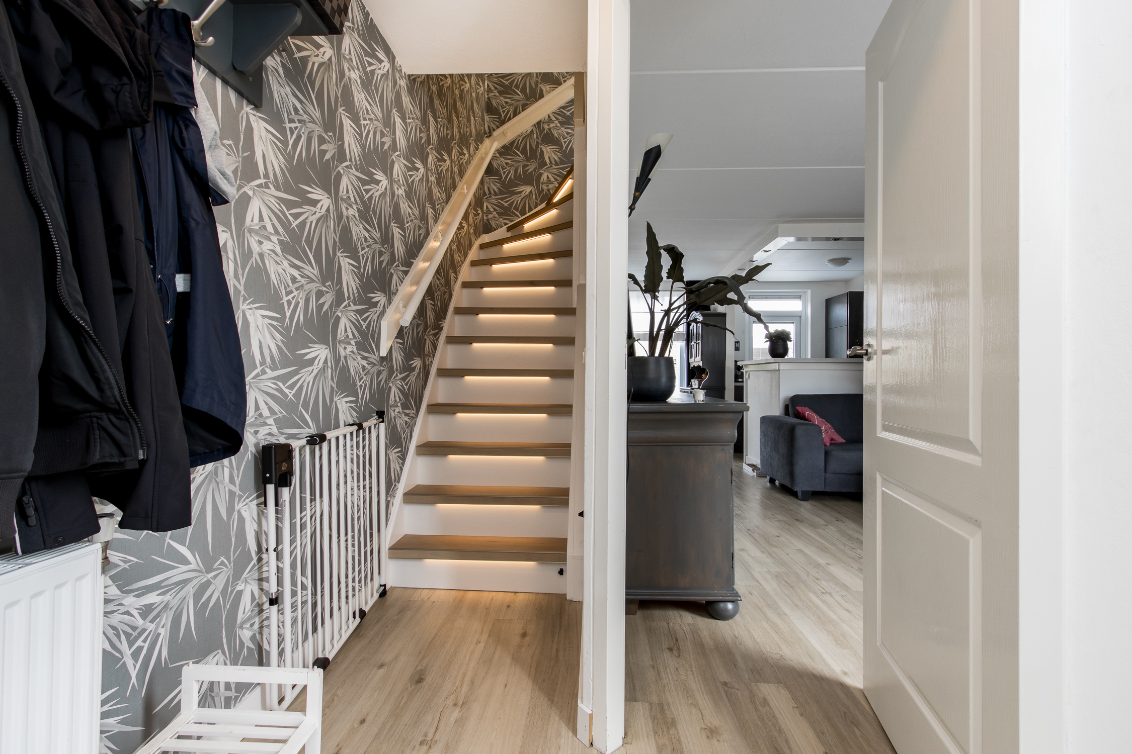 Indeling woning: de entree bevindt zich aan de linkerzijde van de woning en geeft toegang tot de hal met meterkast, toiletruimte en trapopgang naar de eerste verdieping. Vanuit de hal stap je de sfeervolle woonkamer met open keuken binnen. Dankzij de grote ramen is het hier heerlijk licht. De keuken is uitgevoerd in een moderne hoekopstelling en voorzien van diverse inbouwapparatuur. Verder is er een praktische trapkast aanwezig voor extra bergruimte.