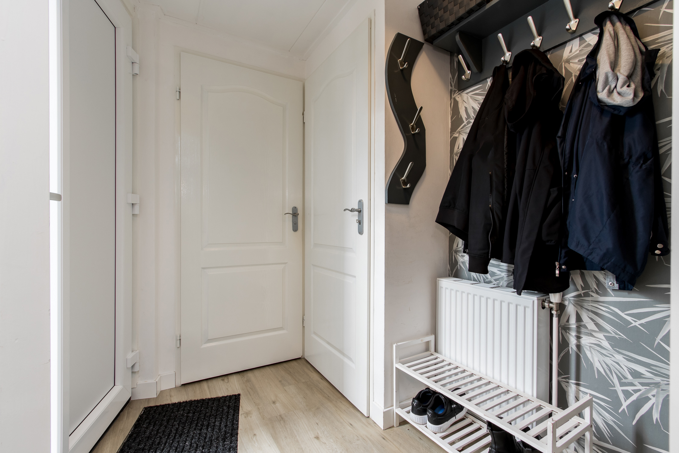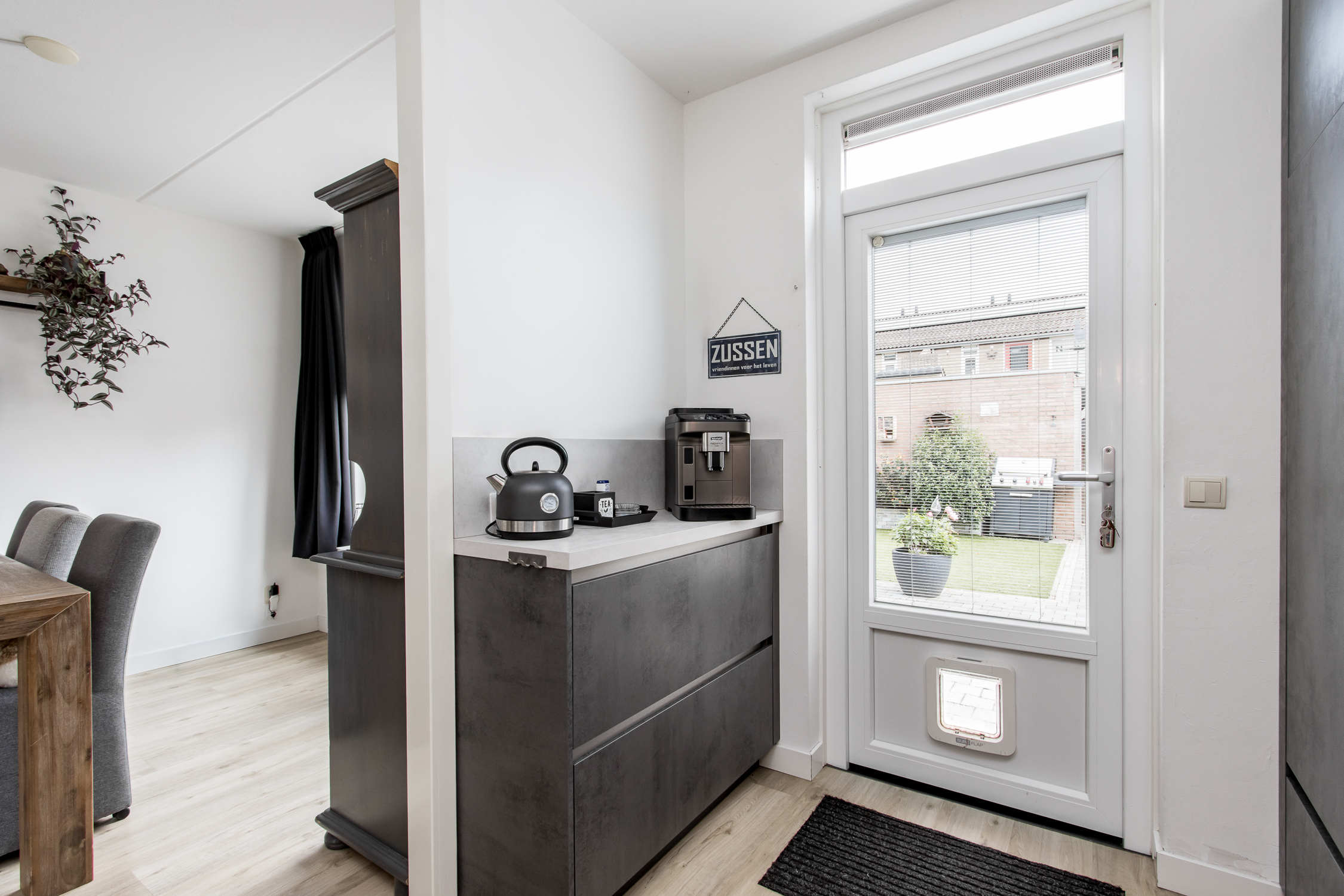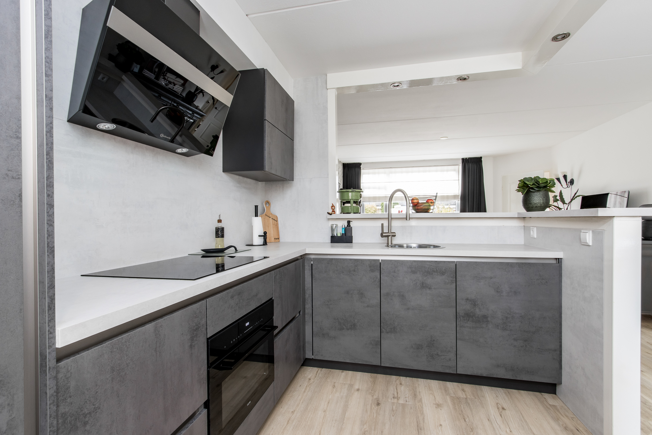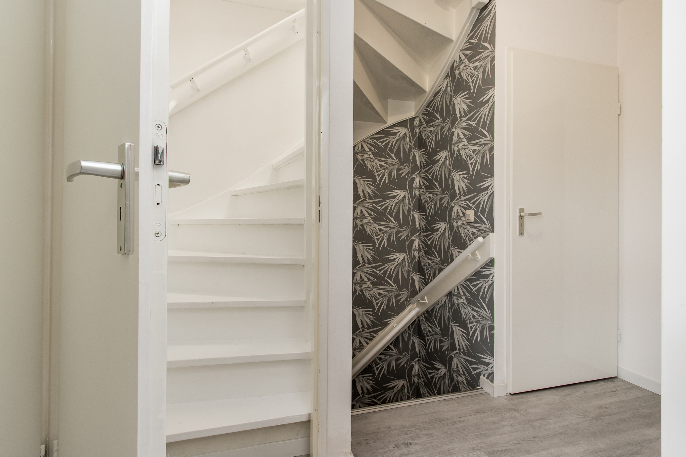 Indeling woning: de entree bevindt zich aan de linkerzijde van de woning en geeft toegang tot de hal met meterkast, toiletruimte en trapopgang naar de eerste verdieping. Vanuit de hal stap je de sfeervolle woonkamer met open keuken binnen. Dankzij de grote ramen is het hier heerlijk licht. De keuken is uitgevoerd in een moderne hoekopstelling en voorzien van diverse inbouwapparatuur. Verder is er een praktische trapkast aanwezig voor extra bergruimte.