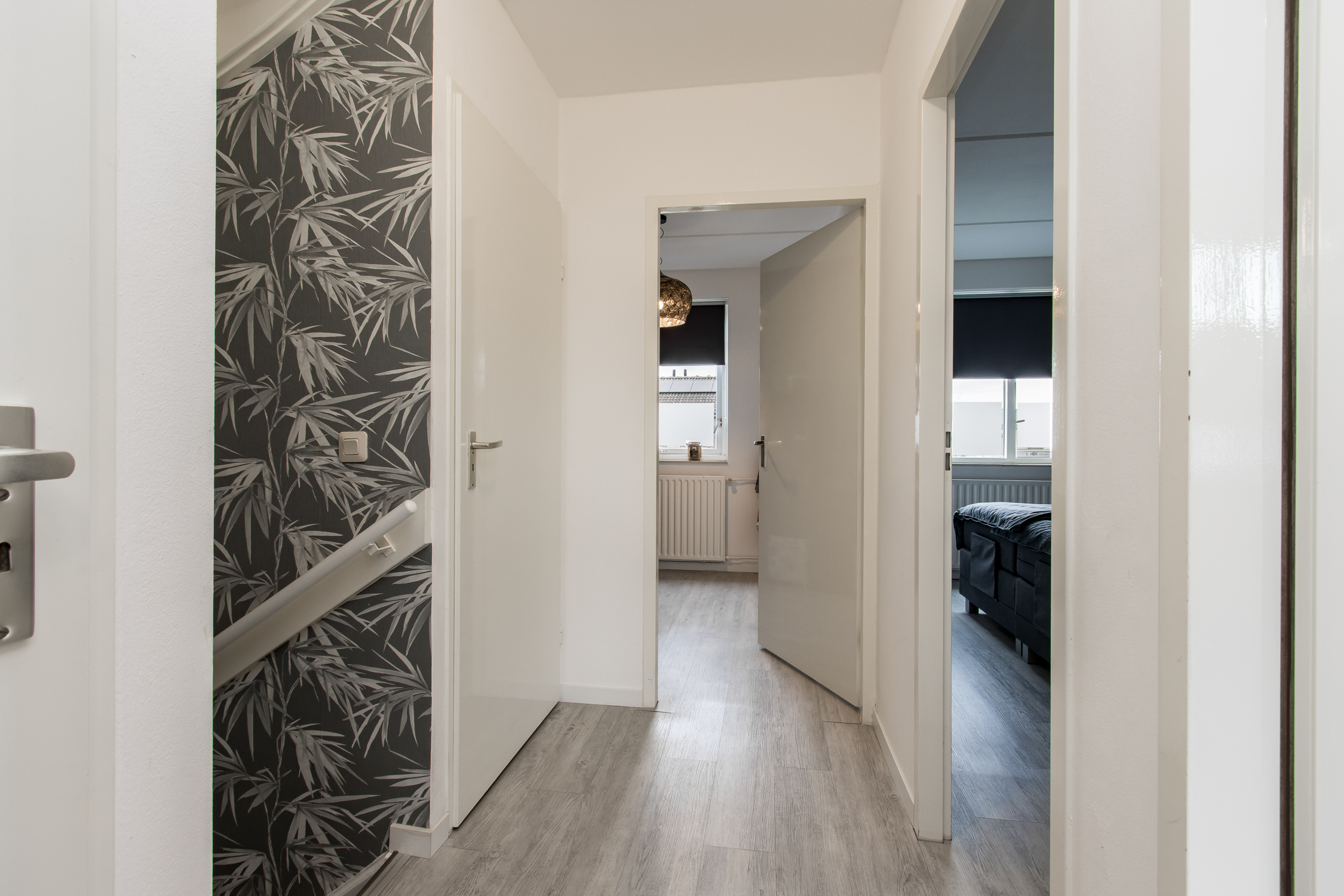 Eerste verdieping: de overloop biedt toegang tot drie slaapkamers en een vaste kast. De moderne badkamer is compleet met wastafelmeubel, wandcloset en douche.