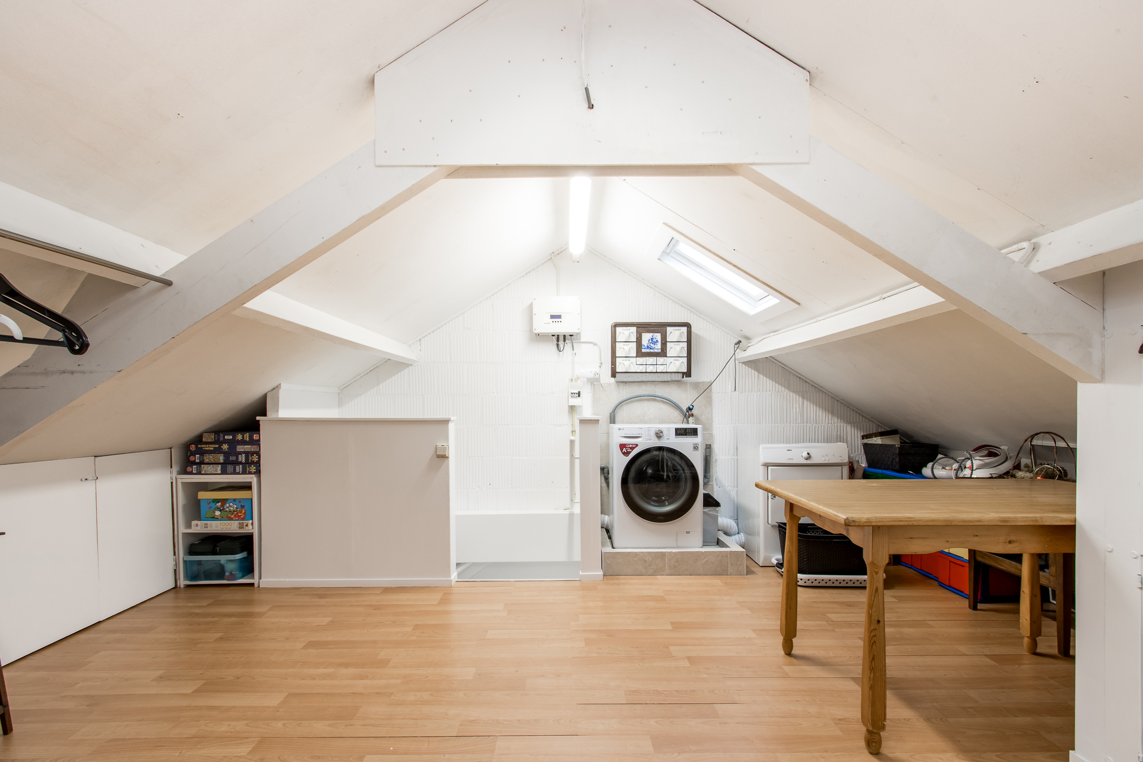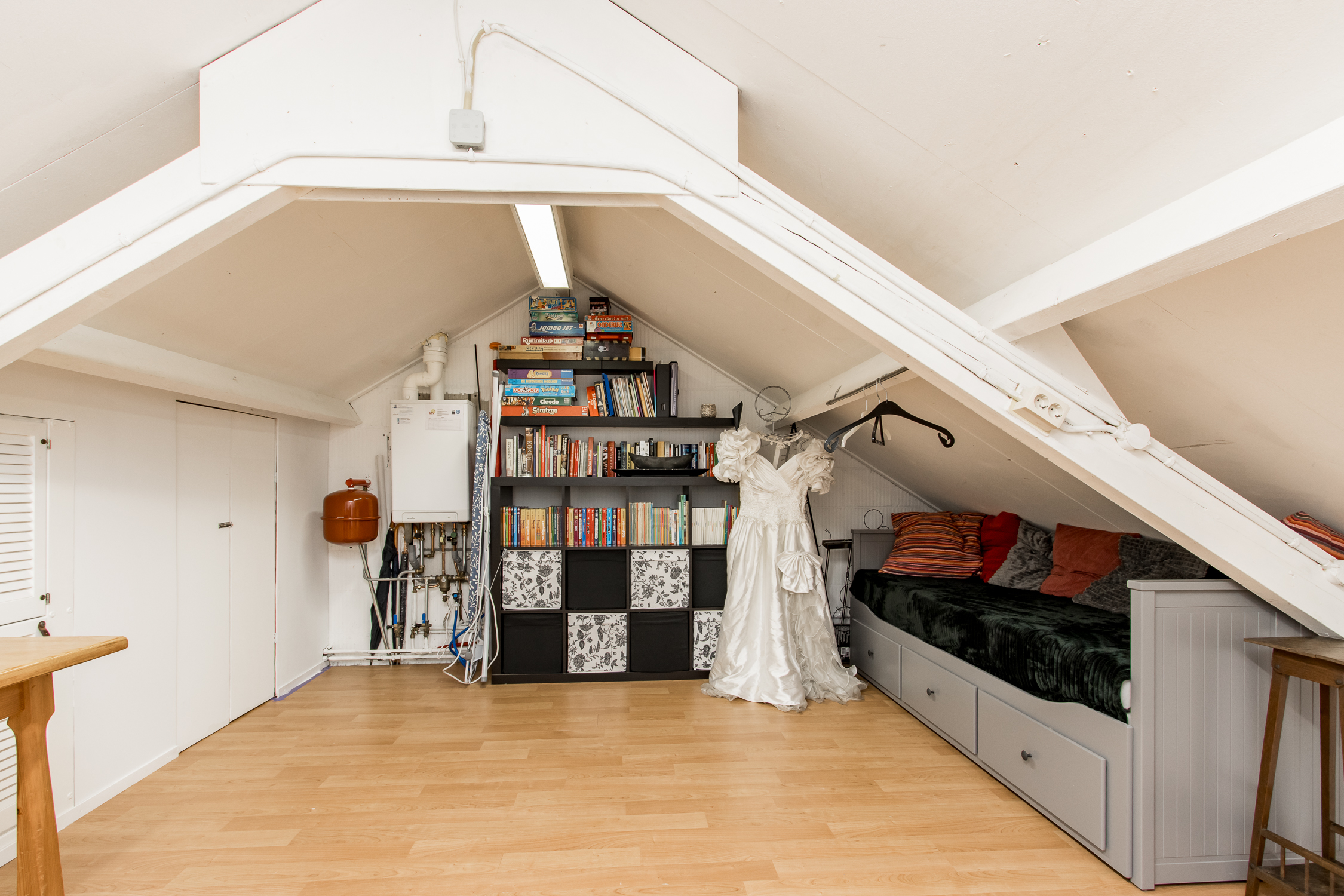 Tweede verdieping: via een vaste trap bereik je de open zolderruimte. Hier bevinden zich de witgoedaansluitingen, de cv-installatie en knieschotten die zorgen voor volop bergruimte. De ruimte leent zich uitstekend als extra slaap-, werk- of hobbykamer.