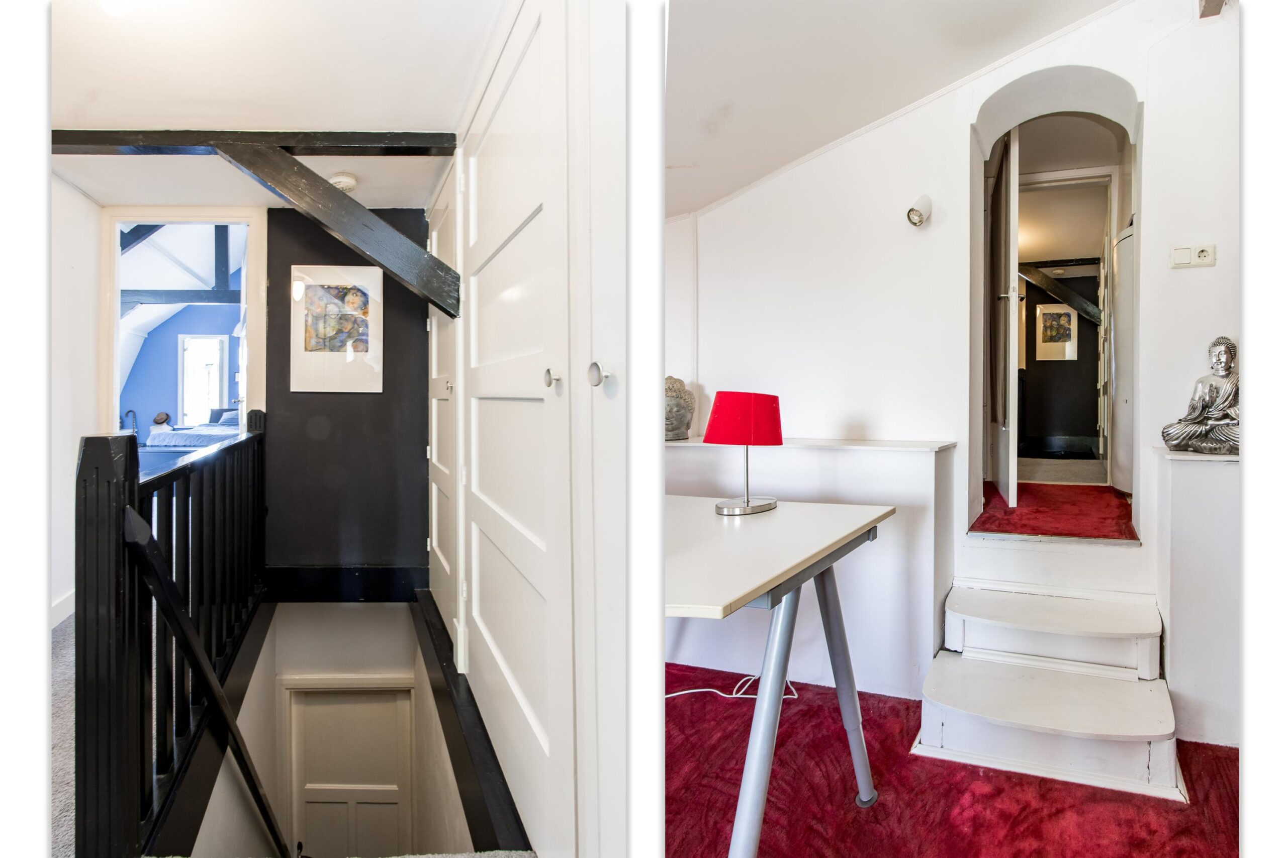 Eerste verdieping: op de eerste verdieping geeft de overloop toegang tot twee sfeervolle slaapkamers, waarvan één is voorzien van een gezellig zoldertje. De opengewerkte nok met zichtbare houten balken zorgt voor een ruimtelijk en karaktervol effect. De overloop is voorzien van een tweede toilet en handige opbergkasten. Via een tussenhal bereik je de hoger gelegen derde slaapkamer, die toegang biedt tot een zonnig dakterras.