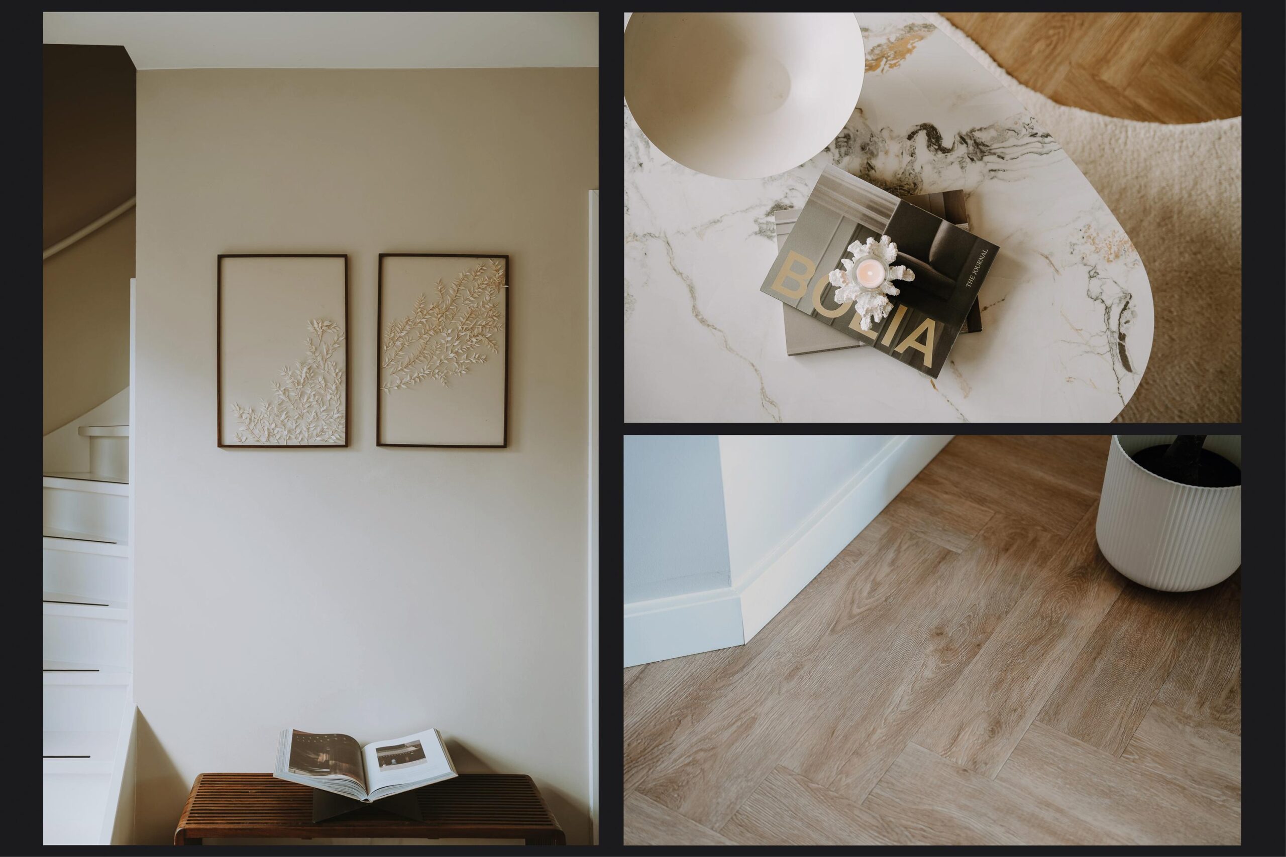 Binnen word je direct verrast door de lichte en sfeervolle living met erker en de prachtige visgraatvloer, die de ruimte een stijlvolle uitstraling geeft. De open keuken is het hart van het huis – een fijne plek om te koken en te genieten.