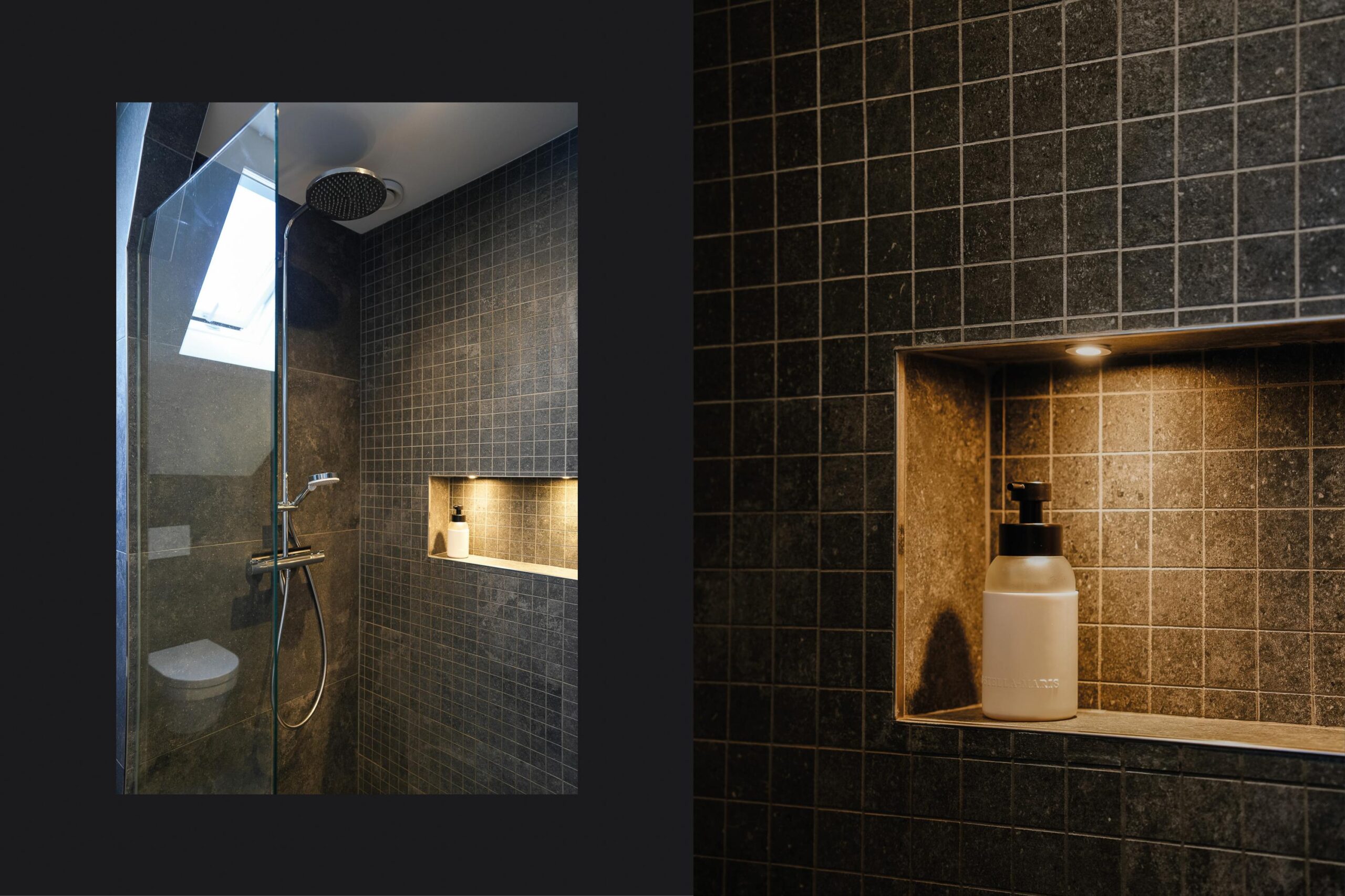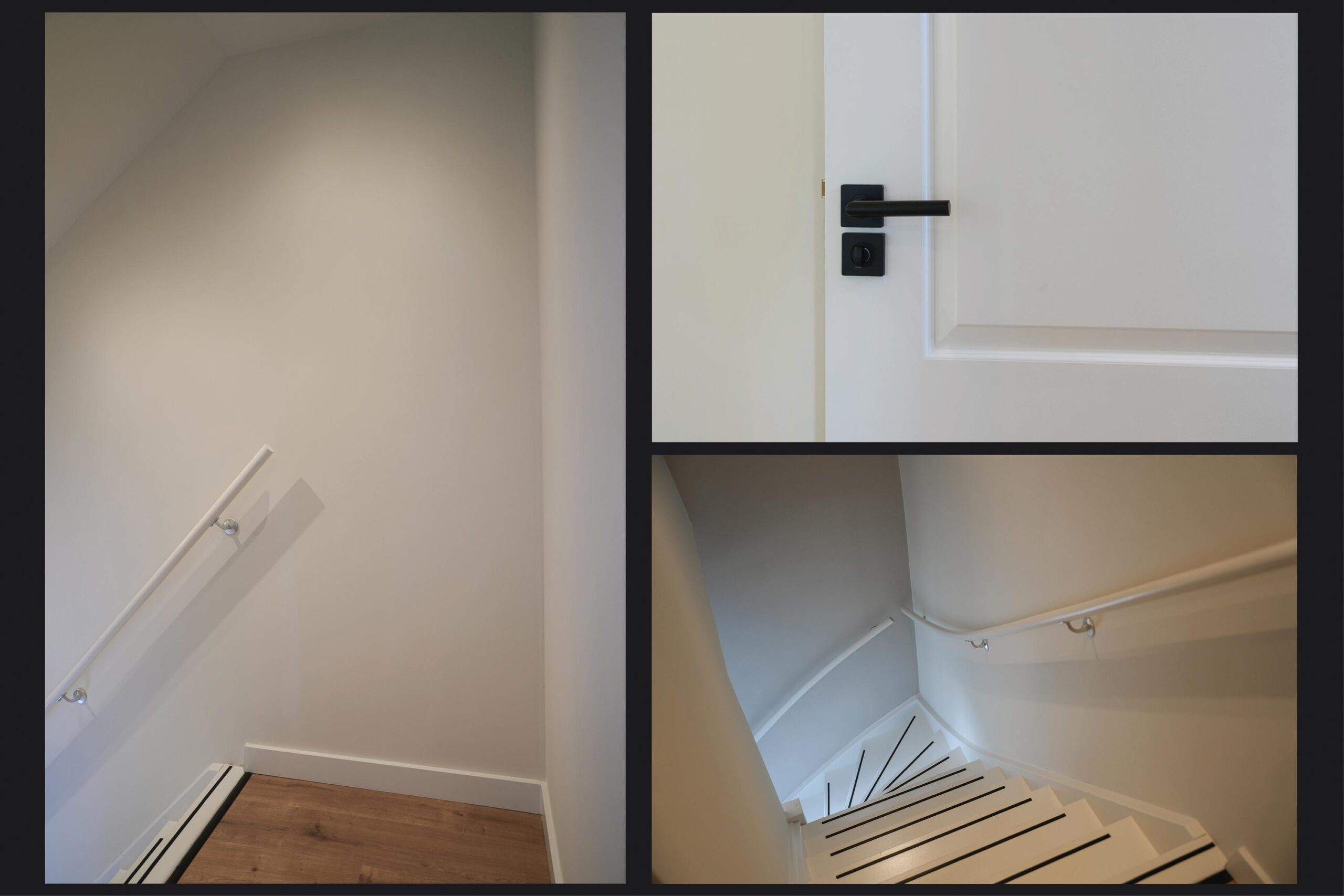 Eerste verdieping: de overloop biedt toegang tot twee ruime slaapkamers en de moderne badkamer. De slaapkamer aan de achterzijde is extra sfeervol dankzij het dakkapel, de houten spanten en de mooie lichtinval. De badkamer is compleet uitgerust met een stijlvol badkamermeubel met waskom, een ruime inloopdouche, wandcloset en vloerverwarming voor extra comfort.