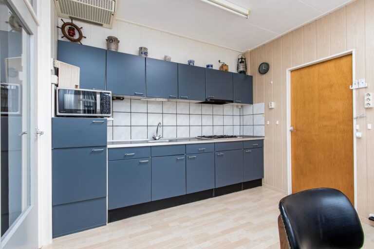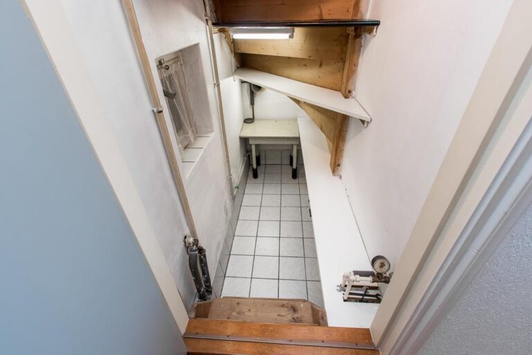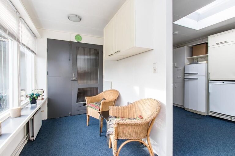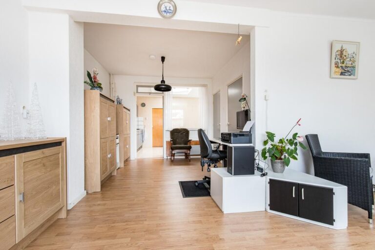 Er zijn nog meer mogelijkheden namelijk aan de binnenzijde door de (niet-dragende) muur tussen de bijkeuken en het portaal weg te halen. Met mogelijk een aanpassing daarbij van een raamkozijn en deur zou deze ruimte gebruikt kunnen worden als kantoor-/praktijkruimte of wellicht een atelier.