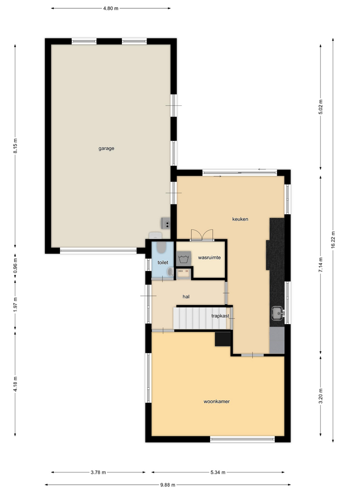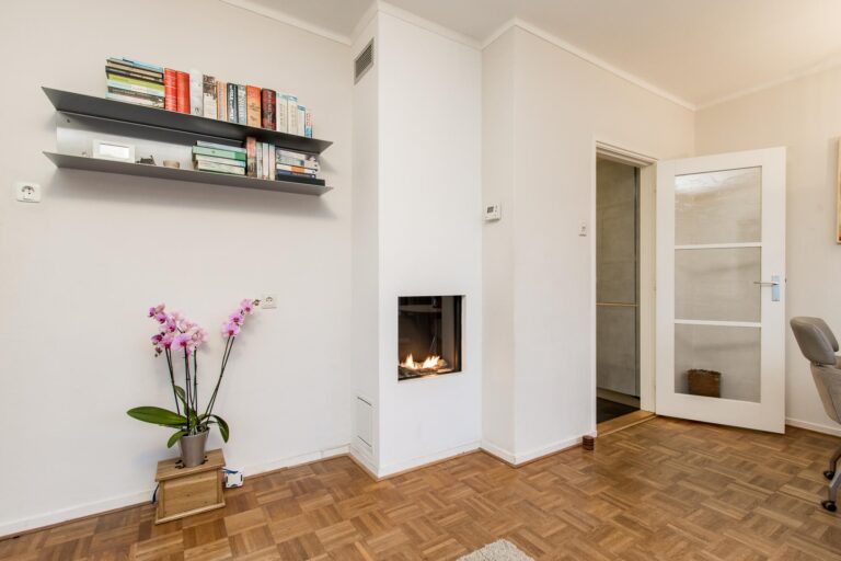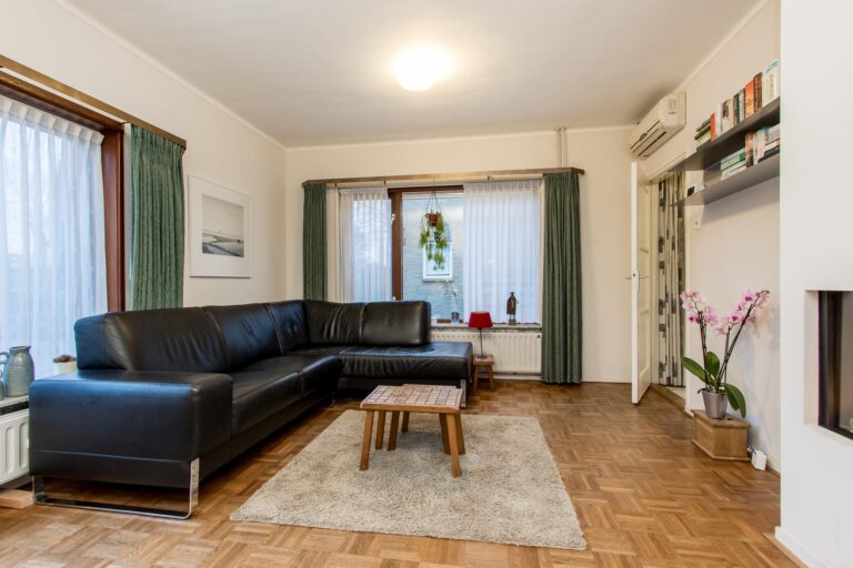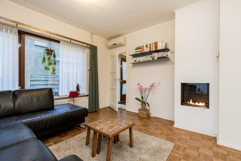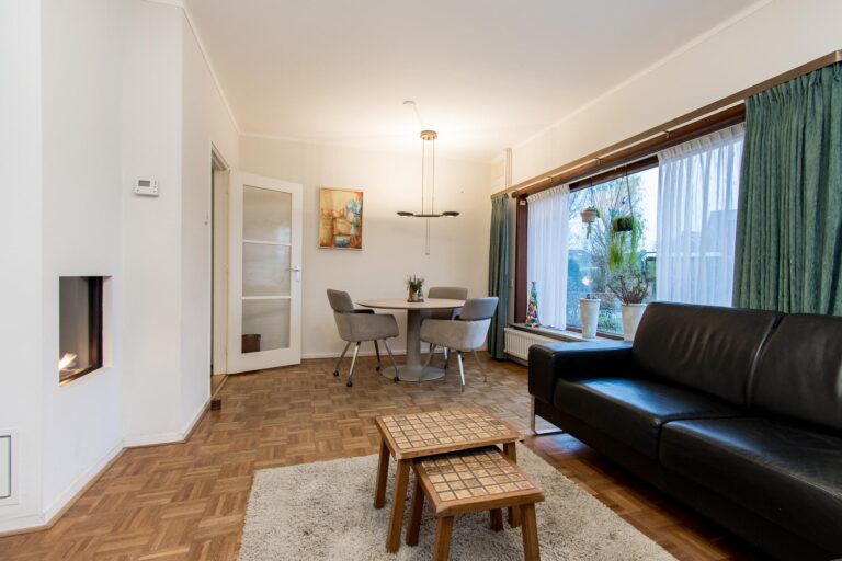 Indeling woonhuis: de entree bevindt zich aan de linkerzijde en geeft toegang tot de hal met garderobe, toilet en meterkast. Vanuit de hal stapt u de woonkamer of de dichte keuken binnen. De woonkamer is aan de voorzijde gesitueerd en is voorzien van fraaie parketvloer, sfeervolle gaskachel en grote raampartijen. Aan de achterzijde bevindt zich de keuken voorzien van rechte keukenunit met diverse inbouwapparatuur, zoals een inductie kookplaat, afzuigkap, oven en vaatwasser. De keuken is voorzien van bijkeuken met witgoedaansluiting en ruimte voor een grote koel-/ vriescombinatie, praktische trapkast en schuifpui naar de achtertuin. Vanuit de keuken is de garage bereikbaar.