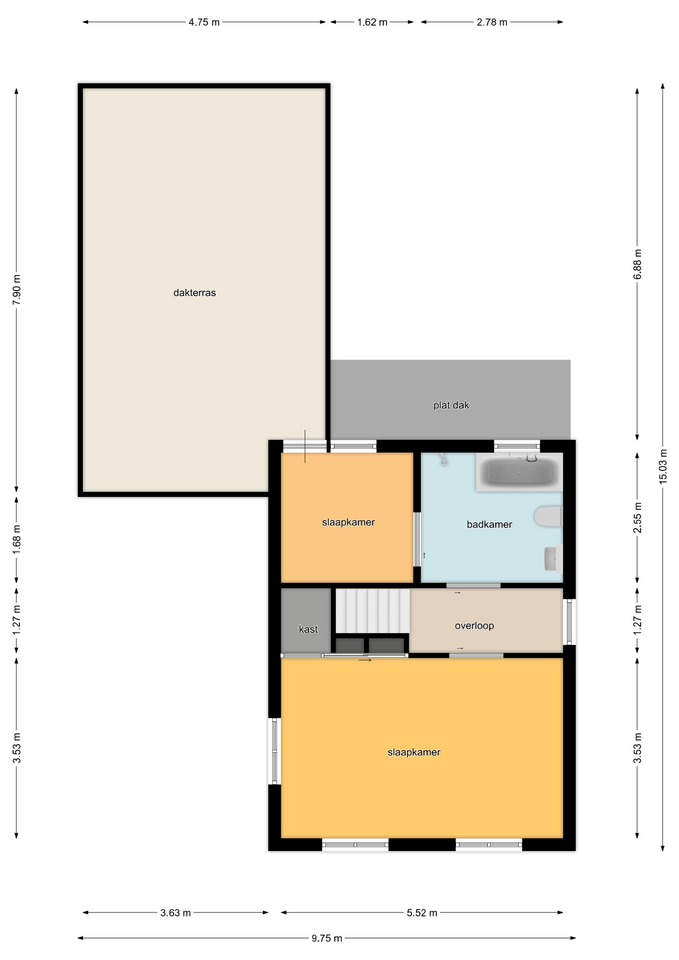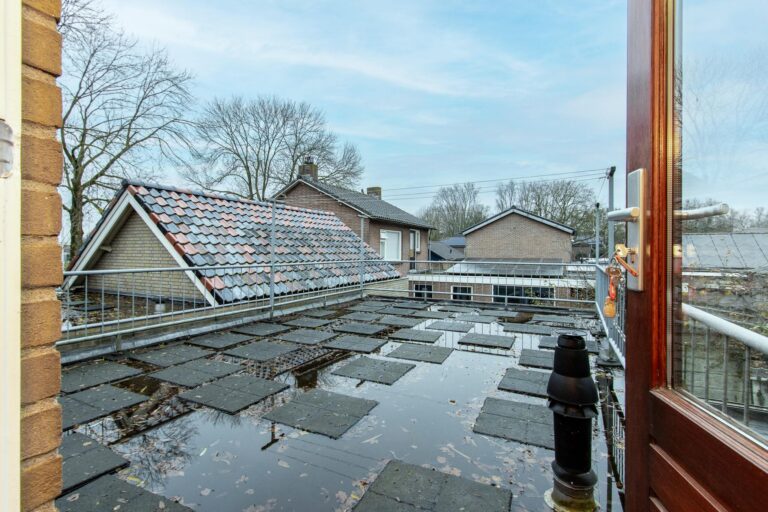 Eerste verdieping: de overloop geeft aan de voorzijde toegang tot een ruime slaapkamer met vaste kastruimte en aan de andere zijde tot de badkamer met ligbad, douche, wandcloset en bandkamermeubel. Vanuit de badkamer is de 2e slaapkamer bereikbaar met loopdeur naar het royale dakterras van ca. 36 m².