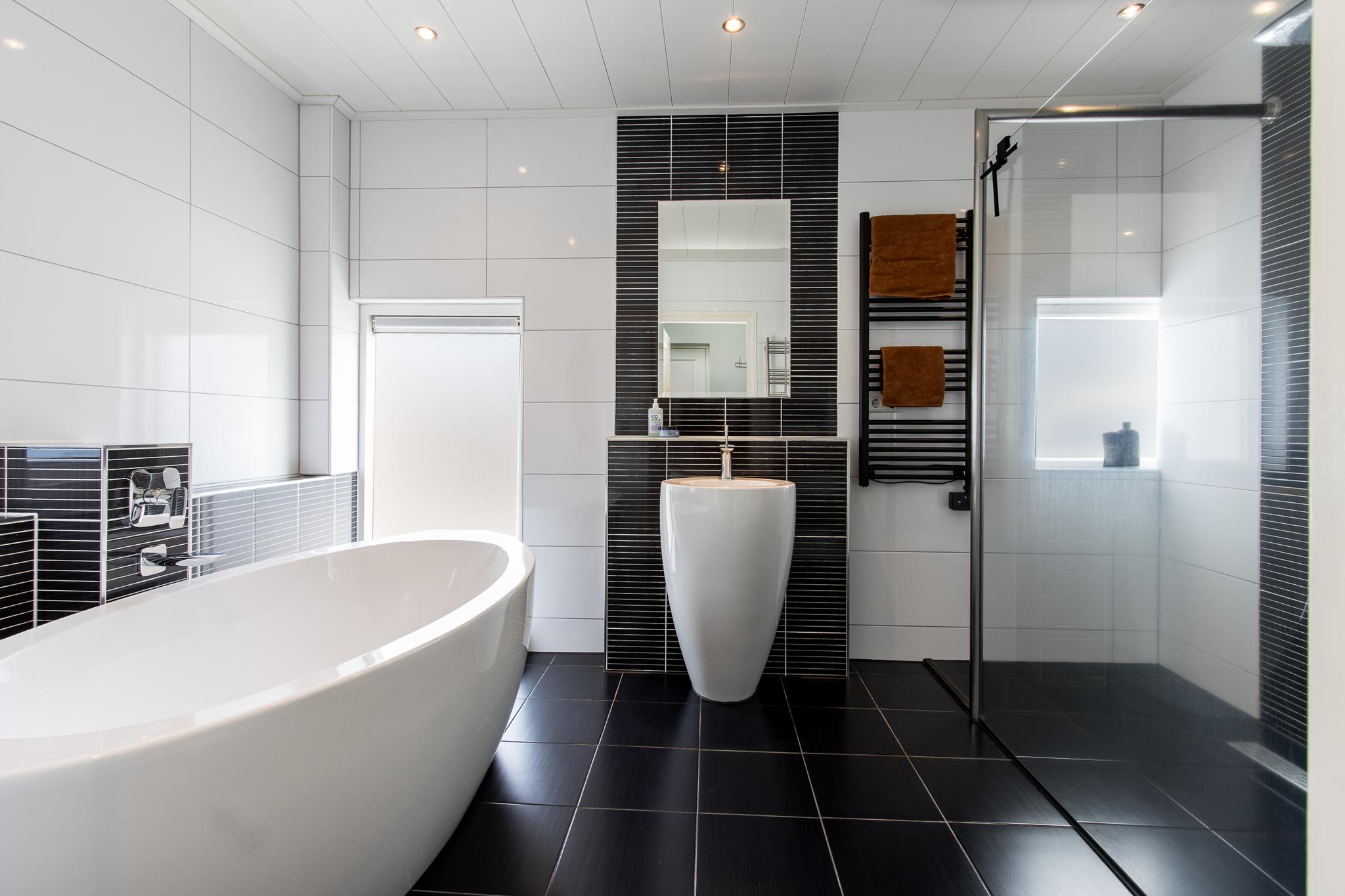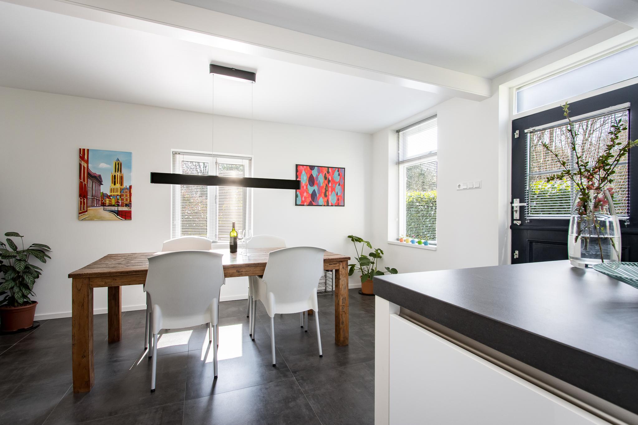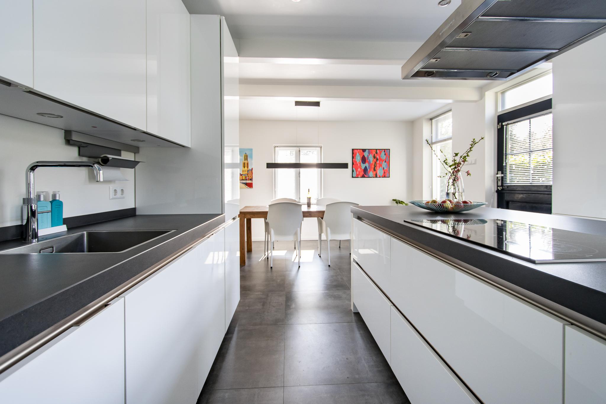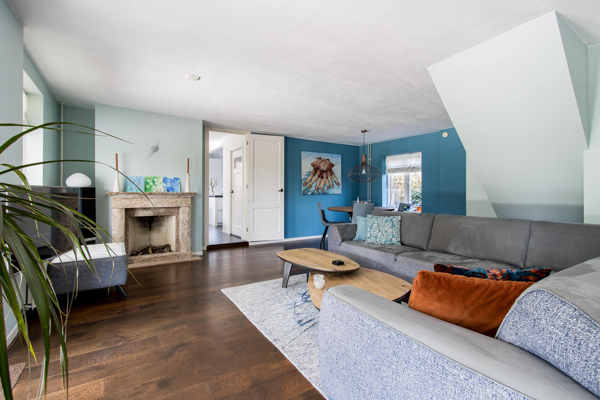 De eigentijdse badkamer is stijlvol ingericht en uitgerust met een inloopdouche, een strak vormgegeven bad en een wastafel. Via de hal stapt u de ruime en lichte woonkamer binnen, waar openslaande deuren niet alleen toegang geven tot het zonnige terras, maar ook een prachtig weids uitzicht over de tuin bieden. De open haard voegt extra sfeer en warmte toe. Aangrenzend bevindt zich de royale woonkeuken, die is voorzien van een moderne keukenunit met kookeiland. Ook deze ruimte heeft een eigen entree, wat zorgt voor extra gemak en toegankelijkheid.