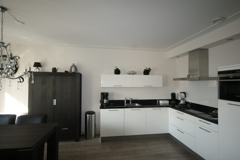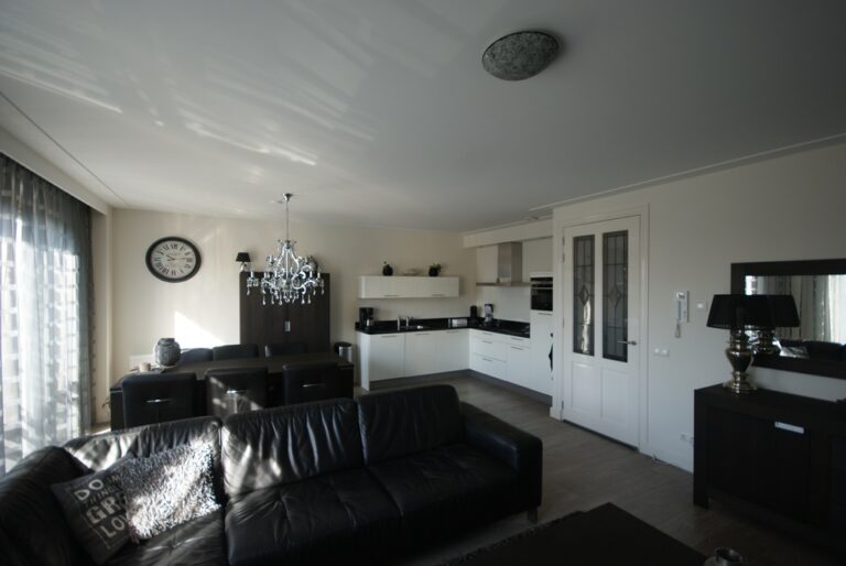 Woonkamer met open keuken (30 m2), moderne keukenunit met inbouwapparatuur.