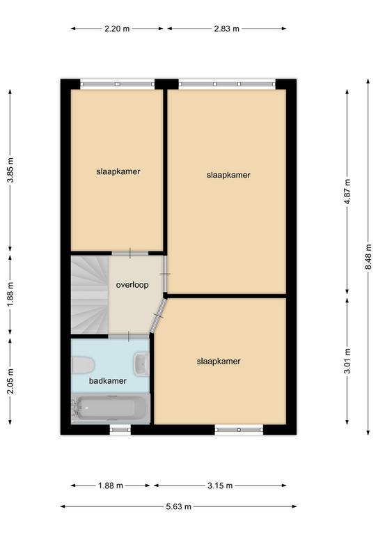 Eerste verdieping: overloop toegang gevend tot 3 slaapkamers en badkamer voorzien van ligbad-/douche combinatie, wastafel en toilet. De 2 slaapkamers aan de achterzijde zijn voorzien van een dakkapel.