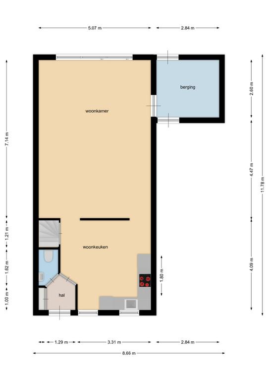 Indeling woonhuis: aan de voorzijde van de woning is de entree gesitueerd. In de hal bevindt zich de meterkast en toiletruimte. De hal geeft toegang tot de woonkeuken met moderne L-keuken voorzien van diverse inbouwapparatuur, waaronder een keramische kookplaat, afzuigkap, koelkast, vrieskast, vaatwasser en oven. De woonkeuken heeft een halfopen verbinding met de ruime woonkamer. De woonkamer is aan de achterzijde uitgebouwd waardoor er heerlijk veel leefruimte is. Mede door de brede schuifpui en het zij-raam is er veel lichtinval aanwezig. Aansluitend de woonkamer bevindt zich de praktische berging v.v. witgoedaansluiting welke fungeert als achterom.