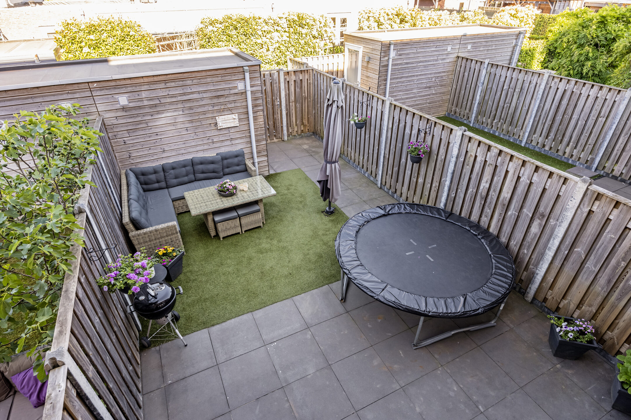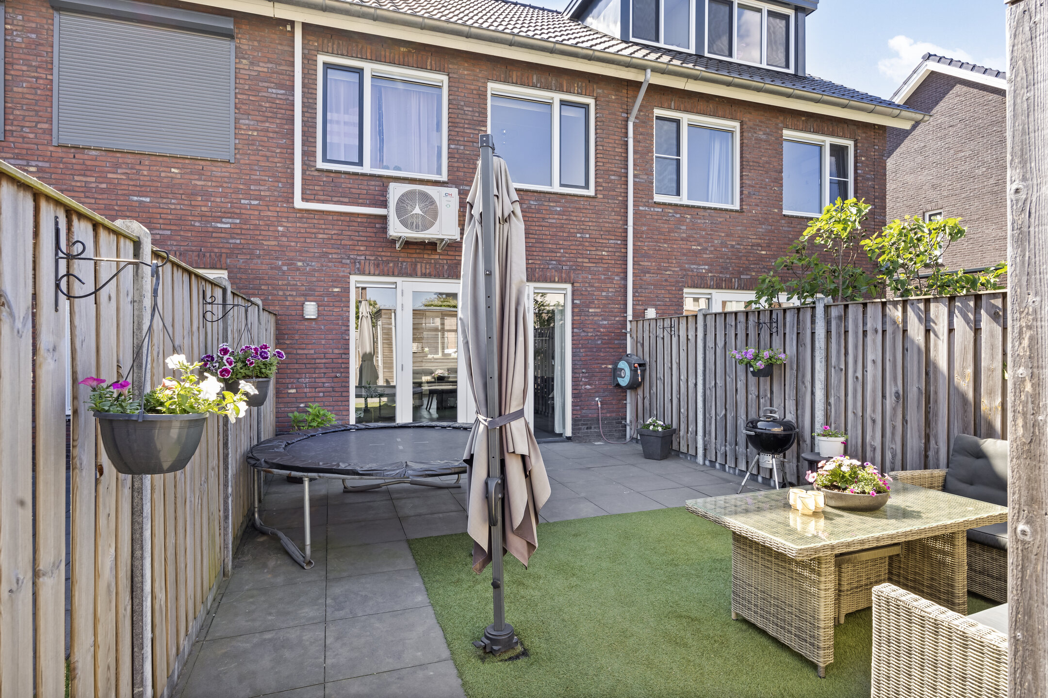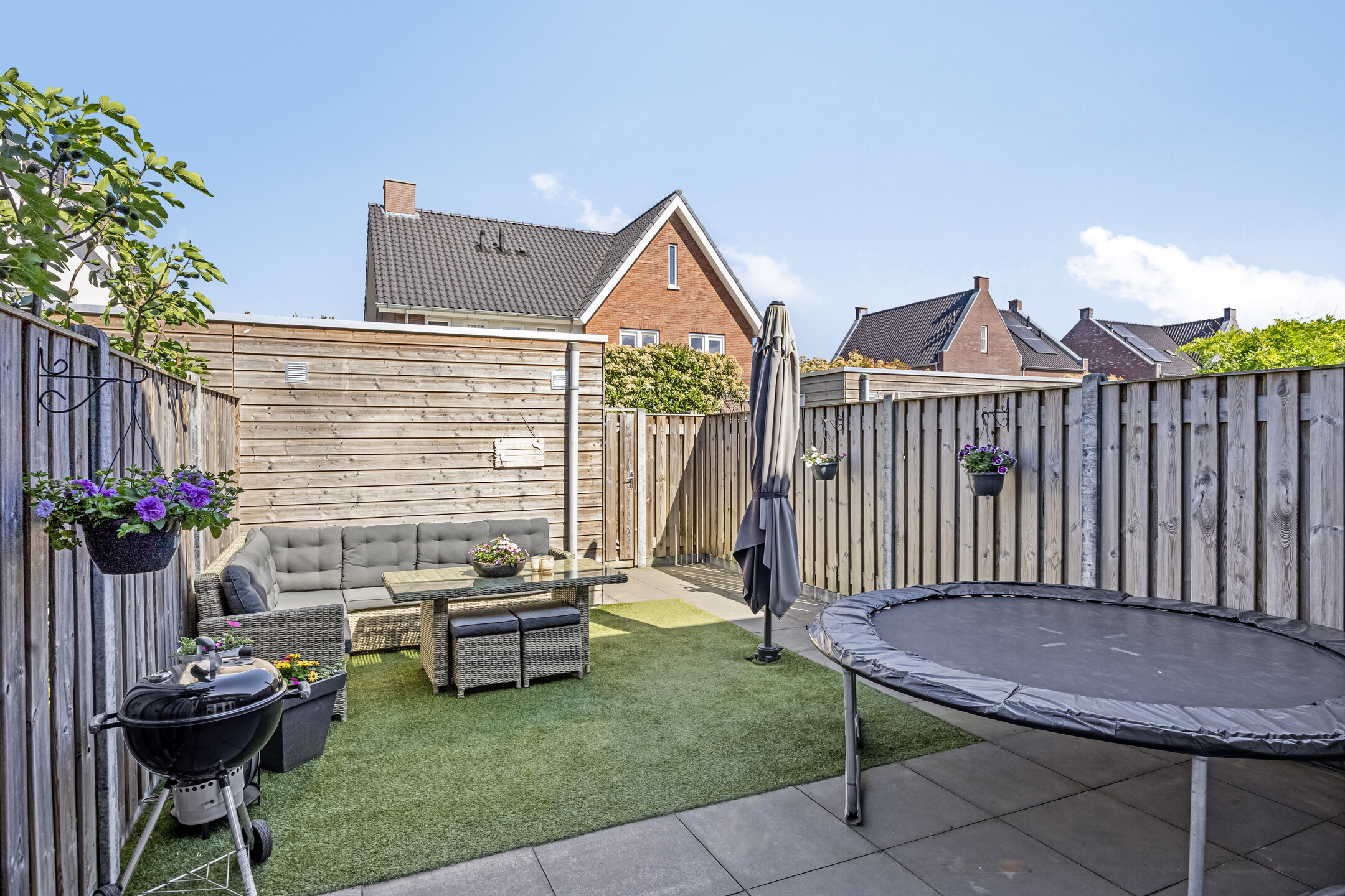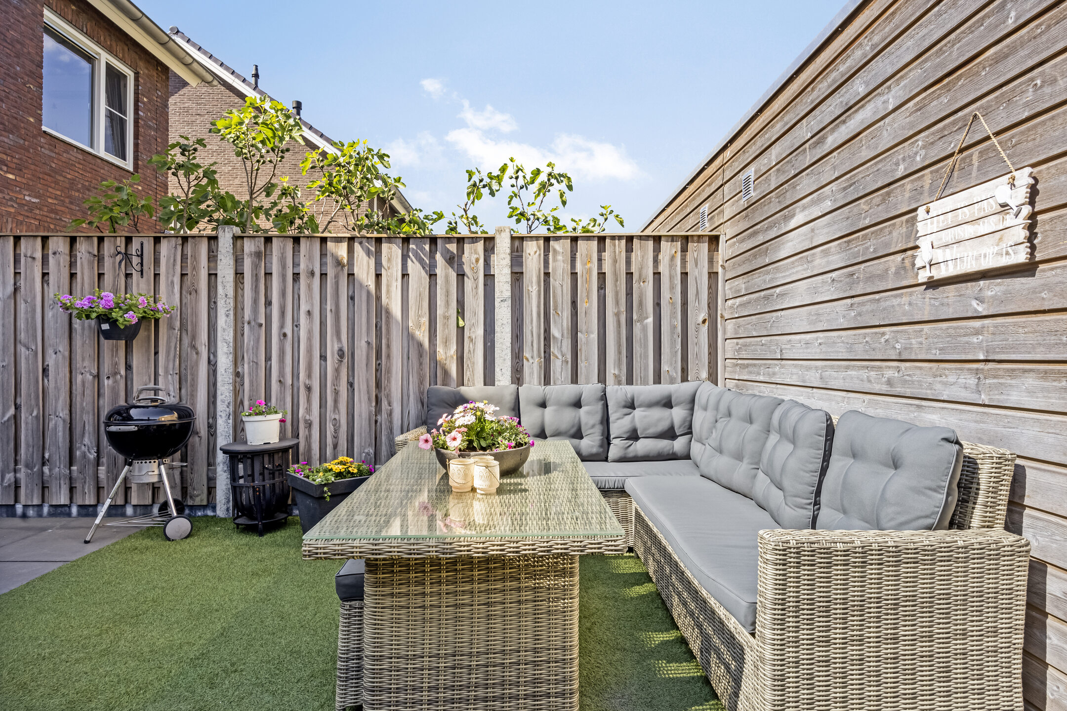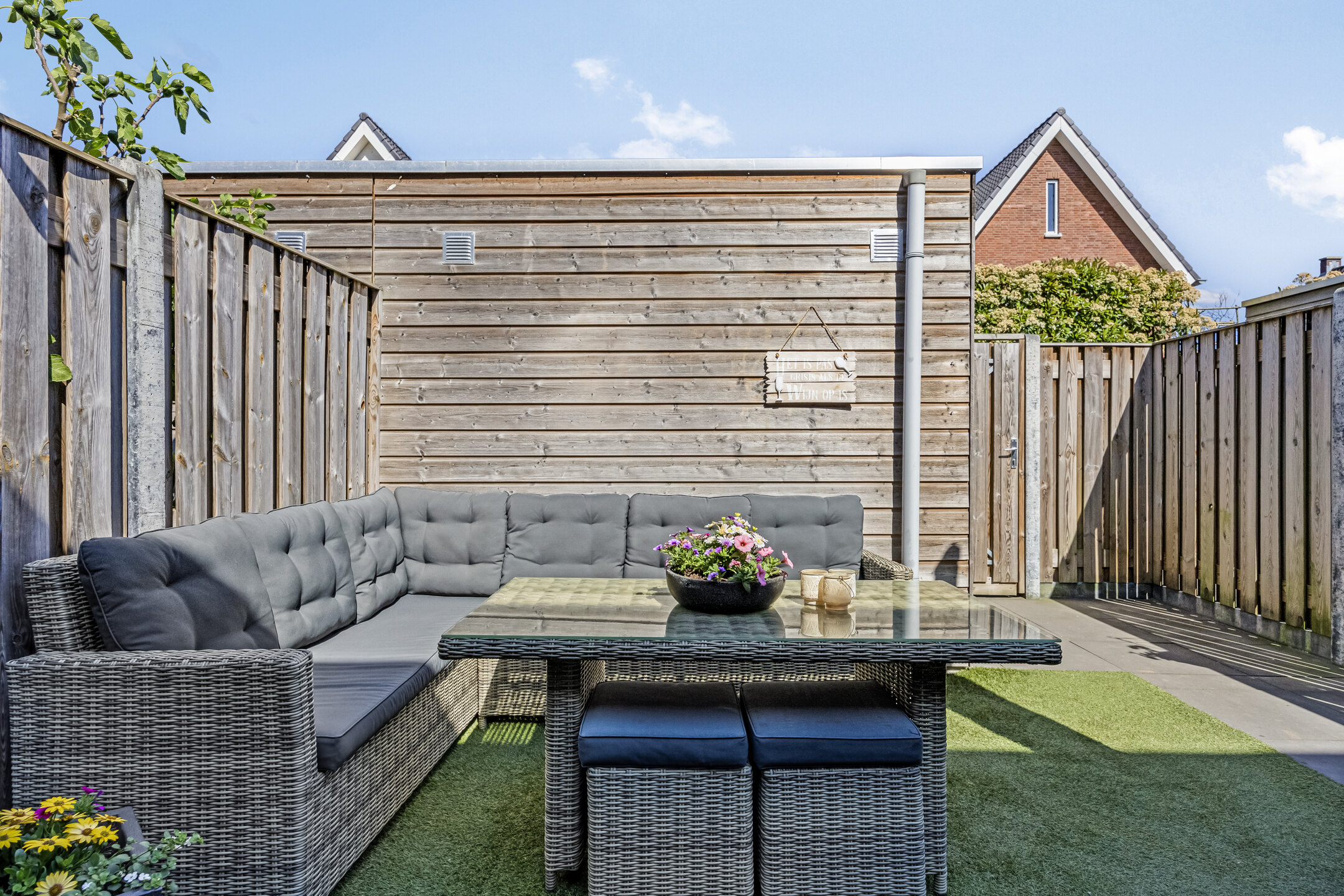 De zonnige achtertuin is een heerlijke plek om te ontspannen. Hij is onderhoudsvriendelijk ingericht met moderne terrastegels en kunstgras. Door de oostelijke ligging geniet je hier van de ochtend- en middagzon. Via de openslaande tuindeuren loop je zo vanuit de woonkamer de tuin in. Achterom bereikbaar én voorzien van een houten berging – praktisch én netjes!