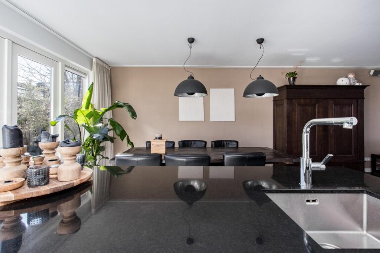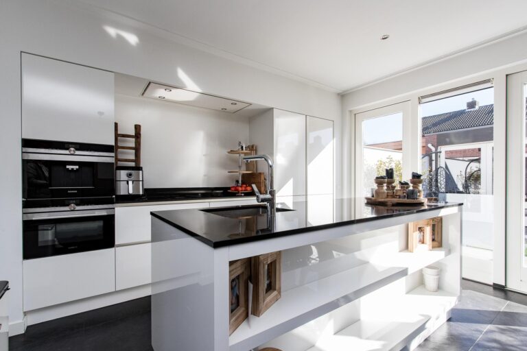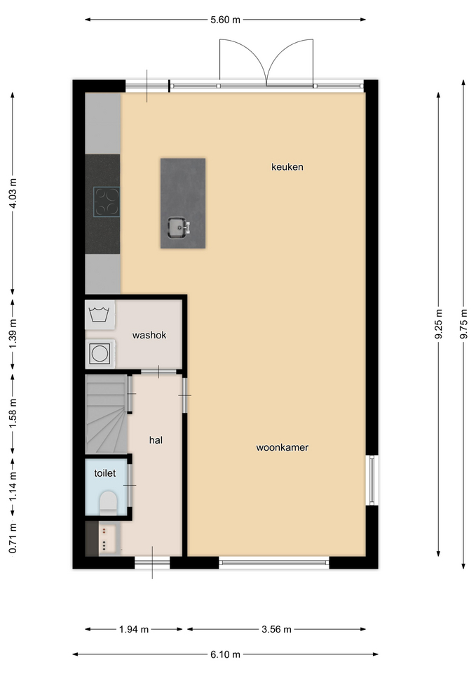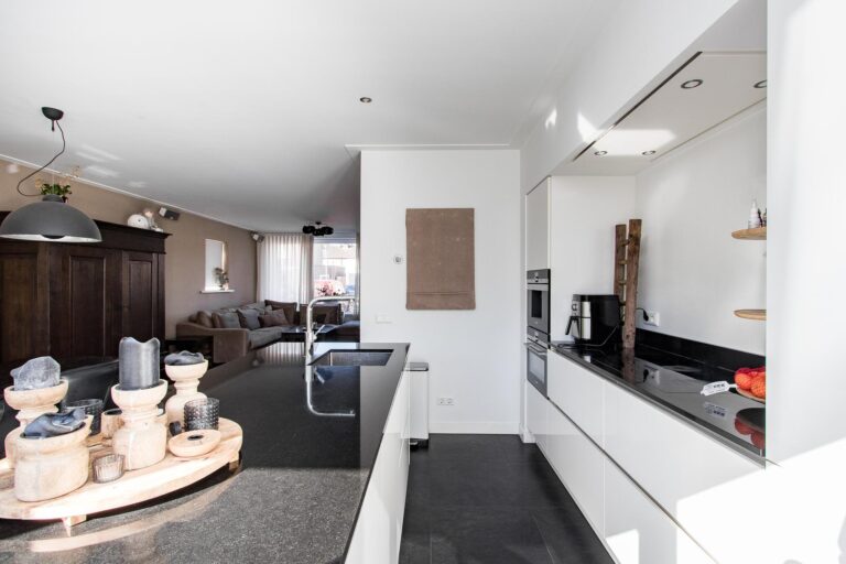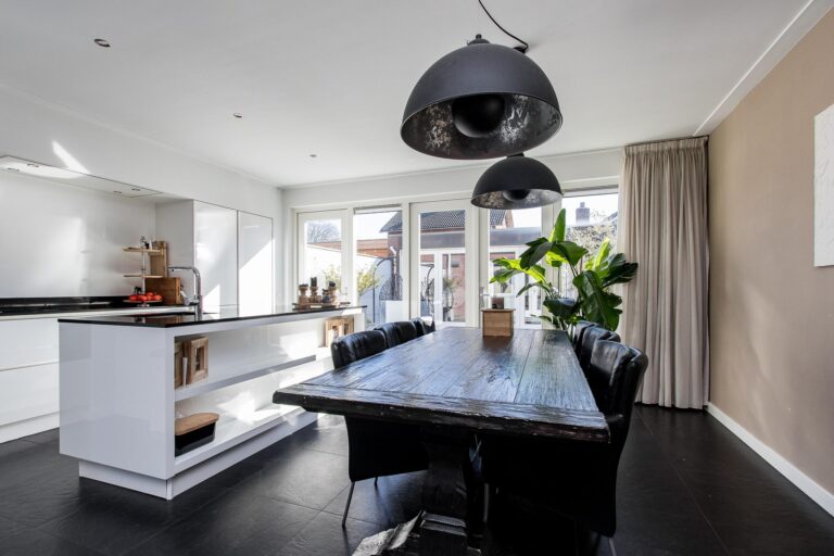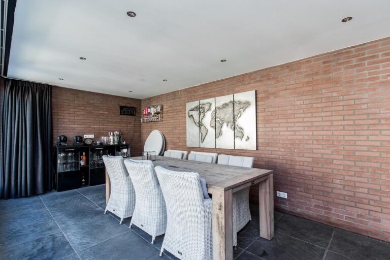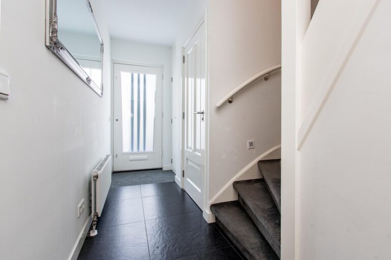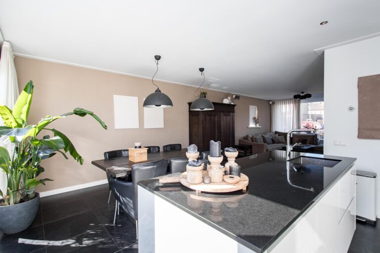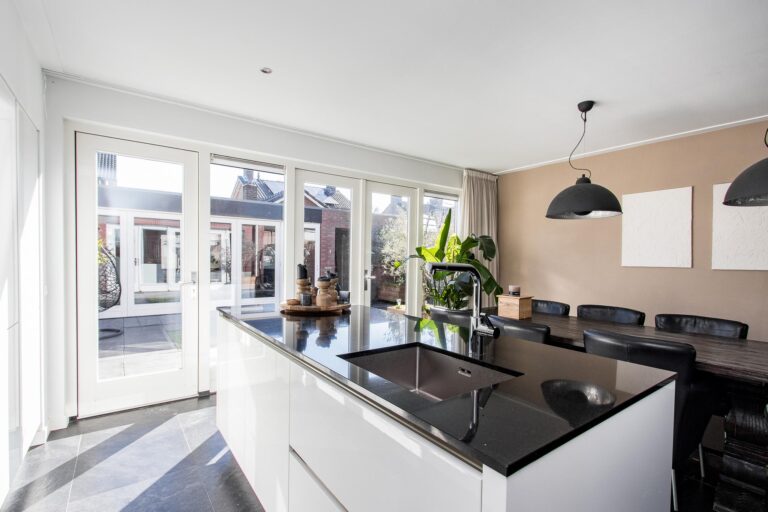Indeling woonhuis: aan de voorzijde van de woning is de entree gesitueerd. In de hal bevindt zich de meterkast, moderne toiletruimte met wandcloset, trapopgang naar de verdieping, trapkast en wasruimte met witgoedaansluiting. De hal geeft toegang tot de ruime woonkamer met open keuken. De luxueuze keuken is aan de achterzijde van de woning gesitueerd en beschikt over een spoeleiland en diverse inbouwapparatuur waaronder een combioven, koffiezetapparaat, koelkast, vrieskast, vaatwasser, inductie kookplaat en afzuiging. De keuken is voorzien van veel bergruimte. De openslaande deuren geven toegang tot de sfeervolle achtertuin met achterom, stenen berging en fraaie veranda met harmonicadeuren.