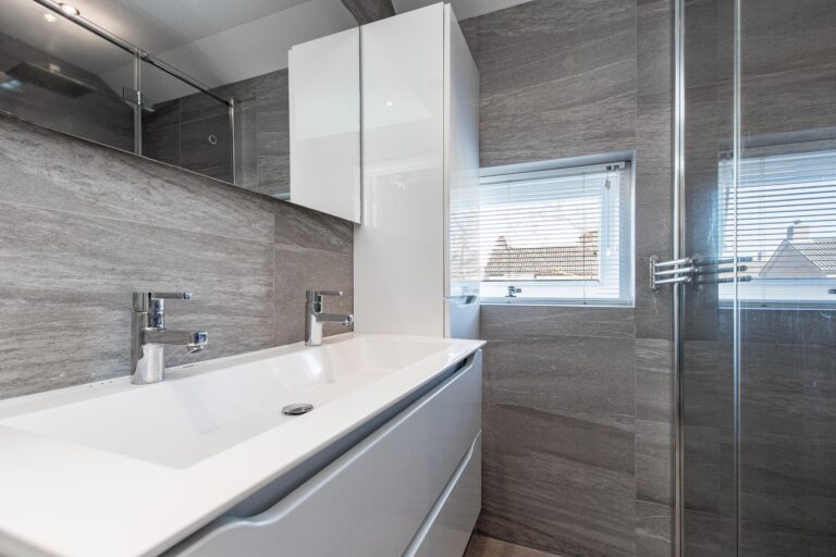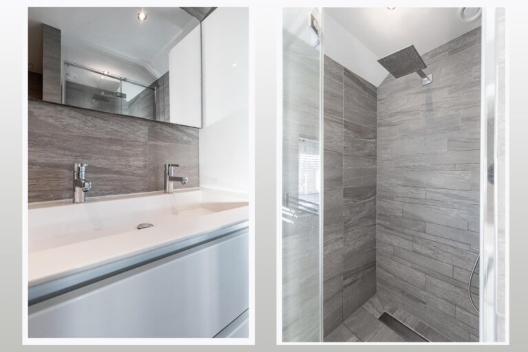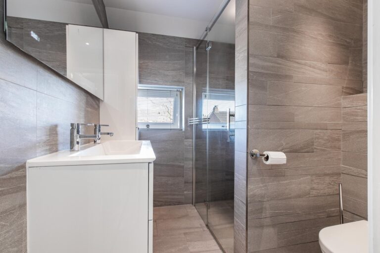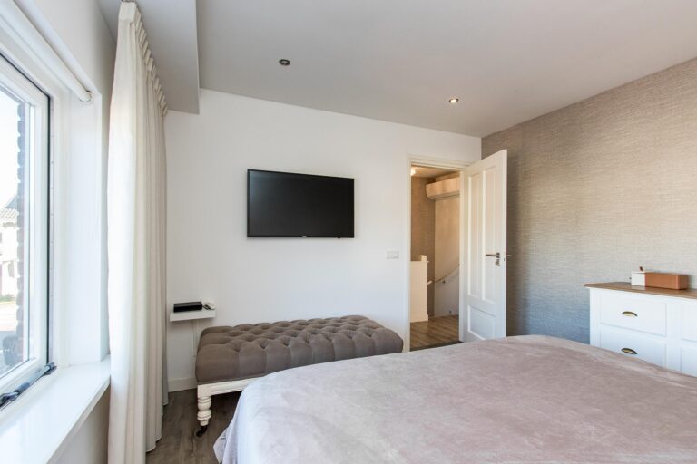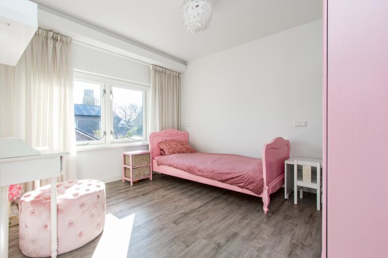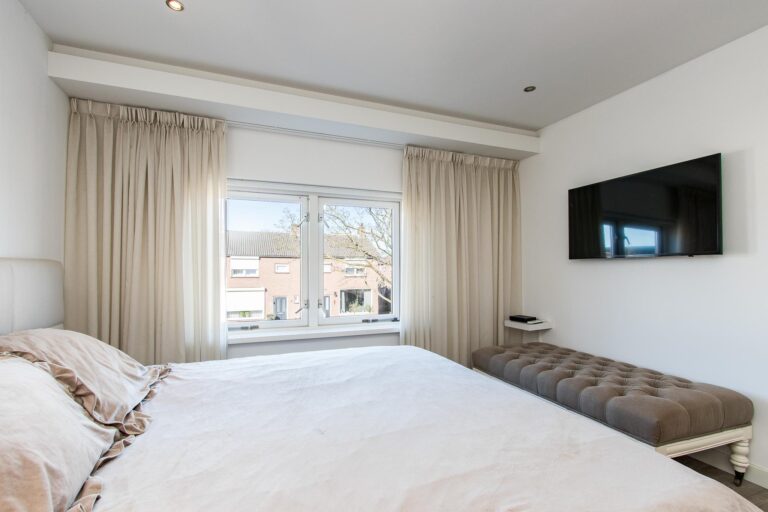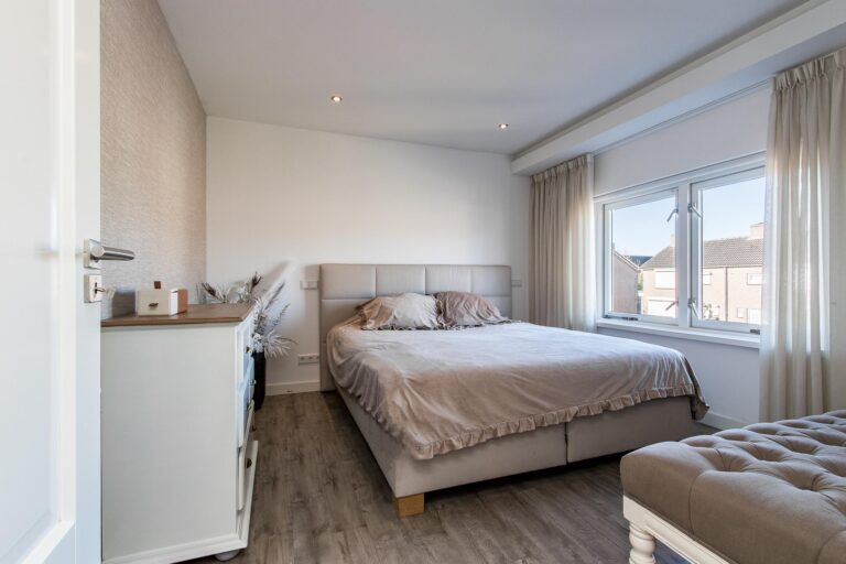 Verdieping: overloop toegang gevend tot 2 ruime slaapkamers, kleedkamer en moderne badkamer voorzien van inloopdouche, wandcloset en wastafelmeubel met 2 kranen.