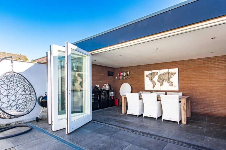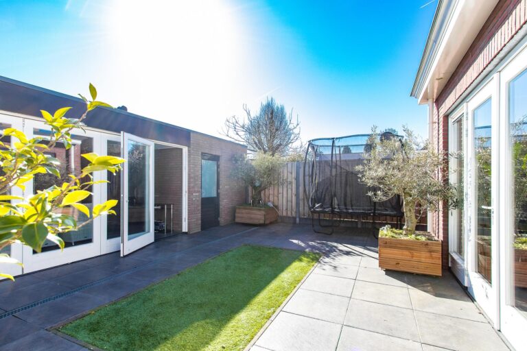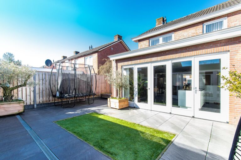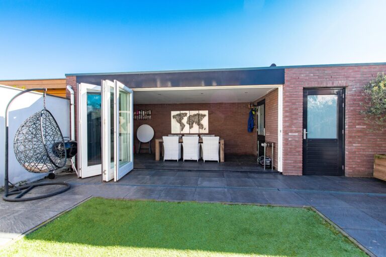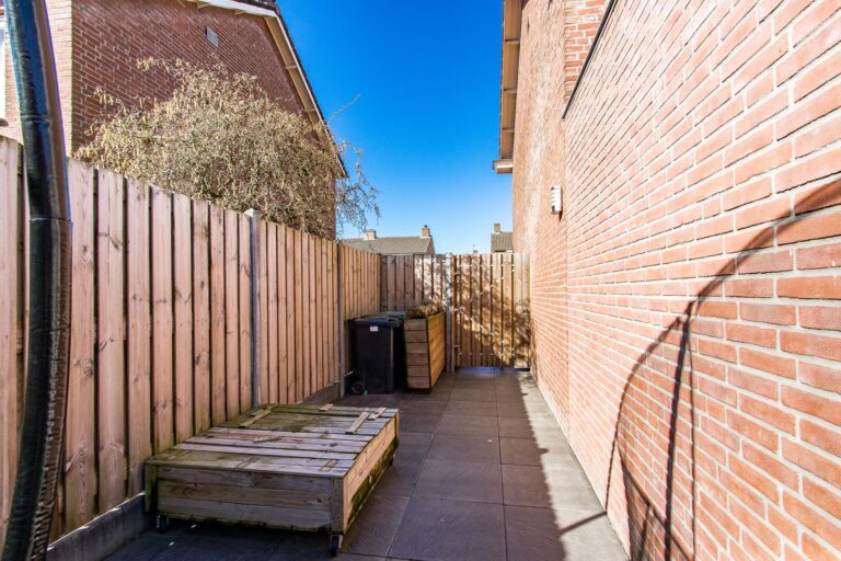 De onderhoudsvriendelijke achtertuin is voorzien van moderne tegels en kunstgras. De achtertuin is gelegen op het oosten en is voorzien van een sfeervolle overkapping met fraaie harmonicadeuren, stenen berging en achterom.