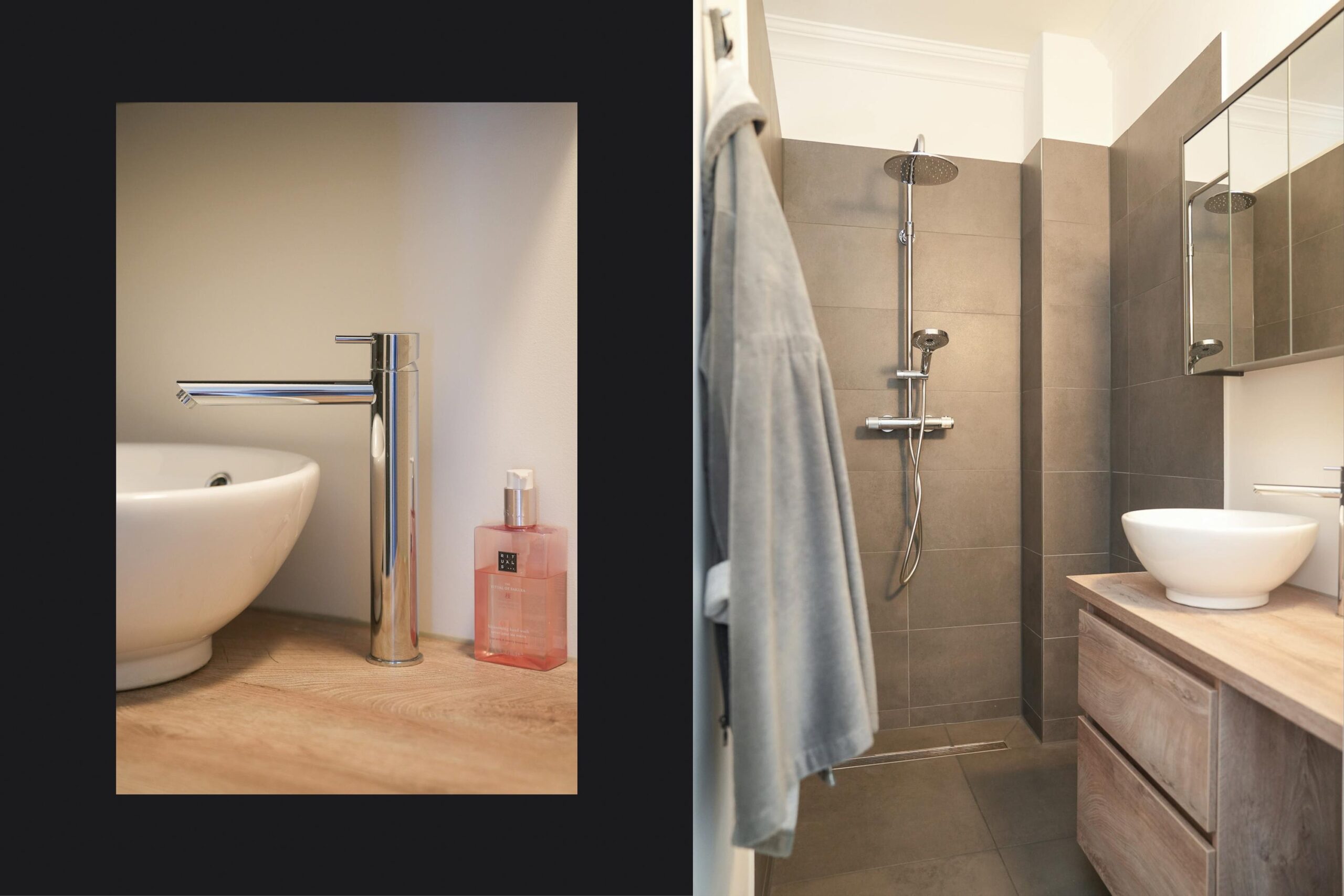 Eerste verdieping: de overloop geeft toegang tot twee royale slaapkamers en moderne badkamer met inloopdouche, wandcloset en wastafelmeubel met dubbele waskom. Via een portaal voorzien van vaste kastruimte zijn er nog twee slaapkamers te bereiken. De masterbedroom beschikt over een balkon.