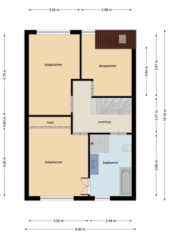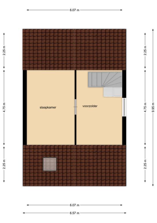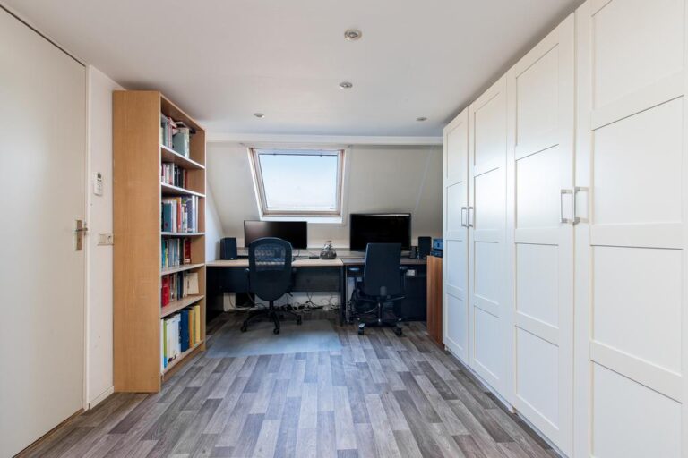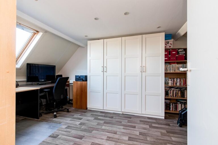 Tweede verdieping: voorzolder toegang gevend tot de 4e slaapkamer en bergzolder. Bij de voorzolder bevindt zich de witgoedaansluiting, C.V.-installatie en airco.