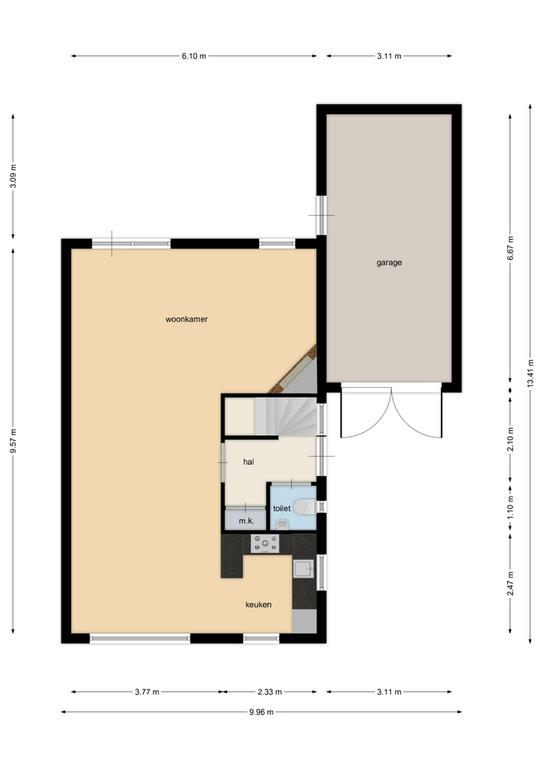 Indeling woonhuis: aan de rechterzijde van de woning is de entree gesitueerd. In de hal bevindt zich de trapopgang naar de eerste verdieping, toiletruimte, meterkast en bergruimte onder de trap. De hal geeft toegang tot de ruime woonkamer met houtkachel. De open keuken is aan de voorzijde van de woning gesitueerd en beschikt over een combioven, 5 gaspitten, afzuigkap en vaatwasser.