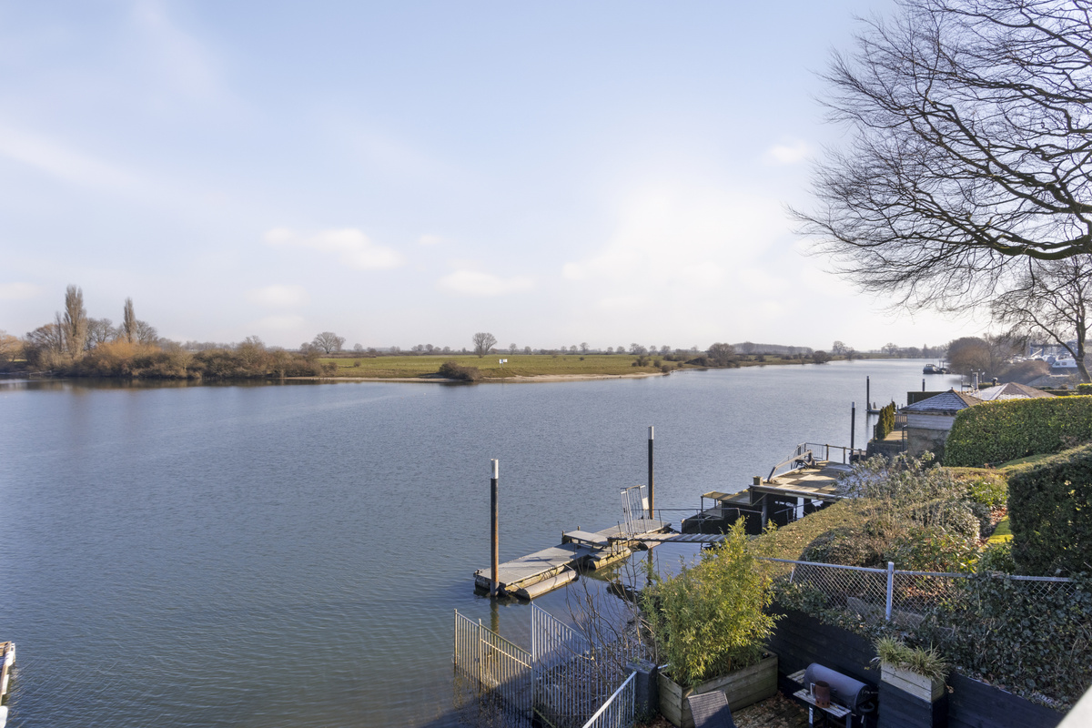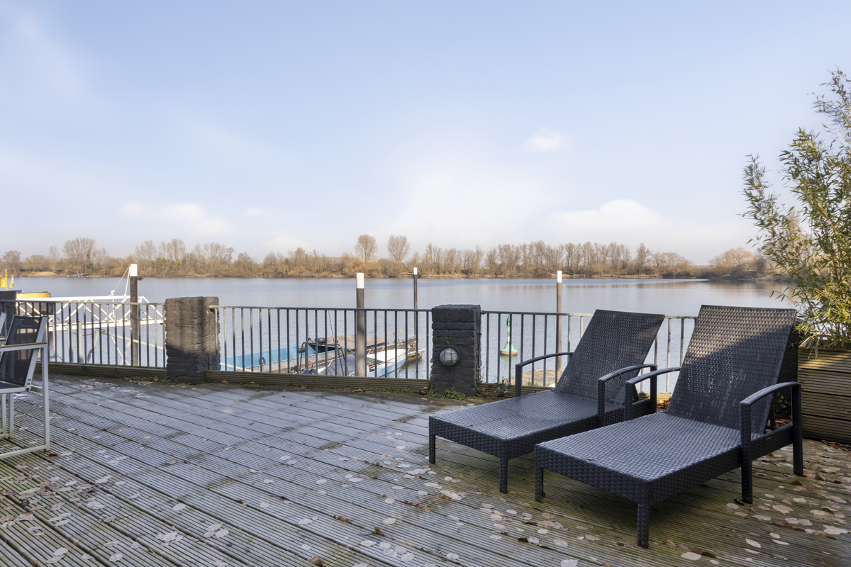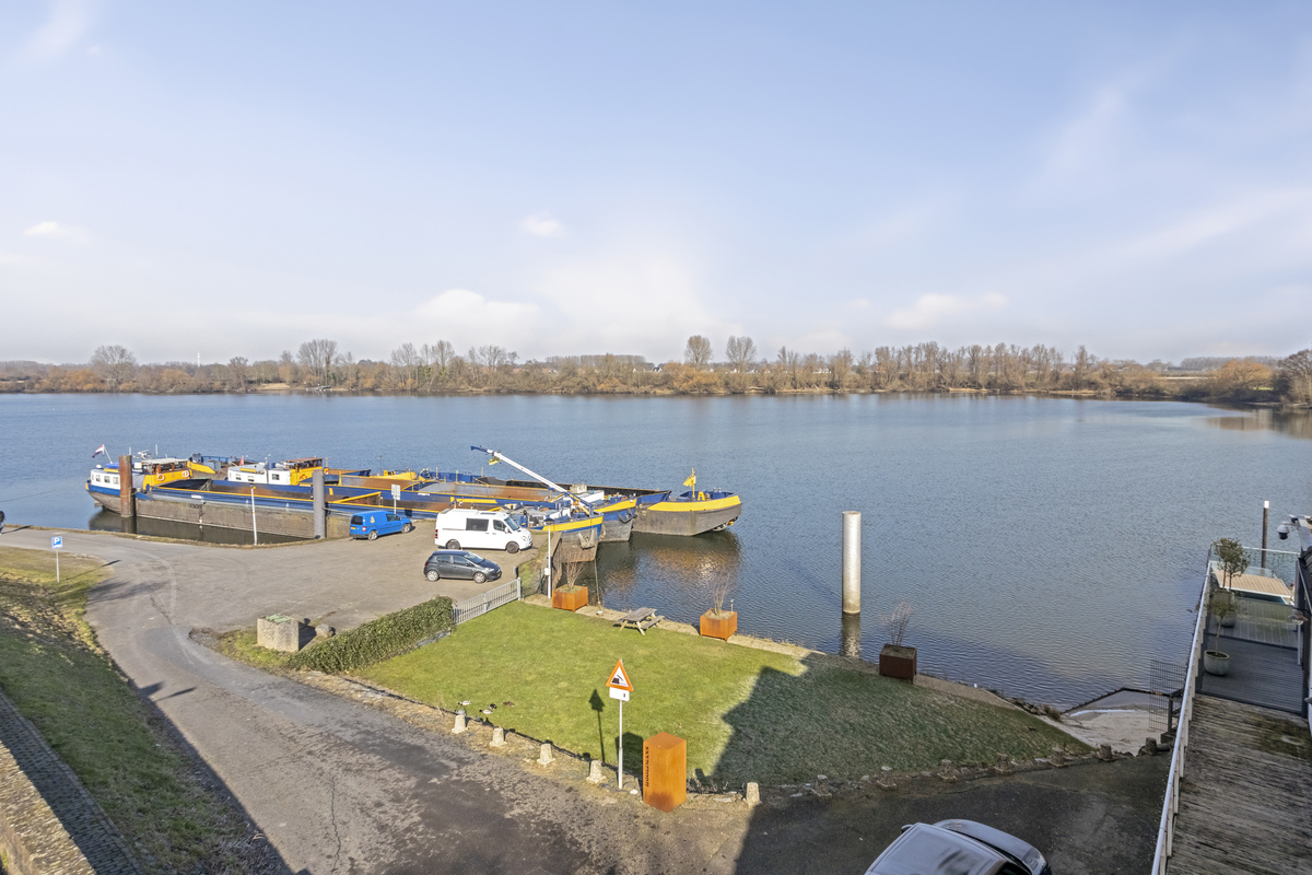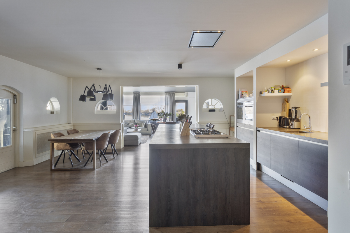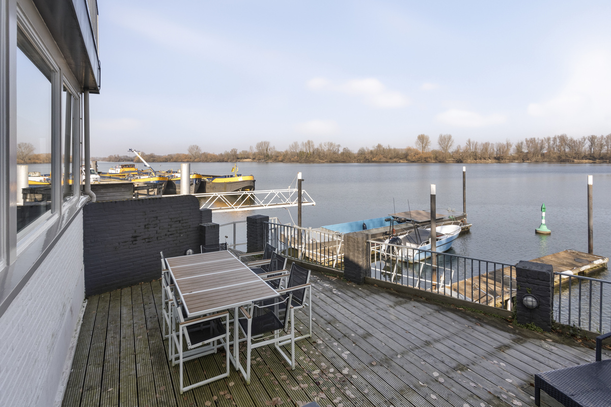 Indeling woning: de entree op dijkniveau geeft toegang tot het voorhuis voorzien van ruime living met open keuken, slaapkamer badkamer met douche en wastafelmeubel en separaat toliet. De lange hal leidt naar klapdeuren die toegang geven toegang tot het portaal, waar een afgesloten trapopgang naar de tweede verdieping en een trap naar de begane grond te vinden zijn. Hier stap je direct binnen in de royale leefkeuken, voorzien van een moderne keukenunit met kookeiland en diverse inbouwapparatuur. Aangrenzend ligt een praktische bijkeuken. De keuken staat in open verbinding met de ruim opgezette living, die een weids uitzicht biedt over de Maas en toegang geeft tot het dakterras. Aan de zijkant bevindt zich een sfeervolle tuinkamer, toegankelijk vanuit zowel de living als de keuken. Dankzij de openslaande deuren geniet deze ruimte van veel natuurlijk licht en directe toegang tot het terras. Daarnaast biedt een portaal vanuit de keuken toegang tot een trapkast en een toiletruimte, uitgerust met een wastafel, toilet en urinoir.