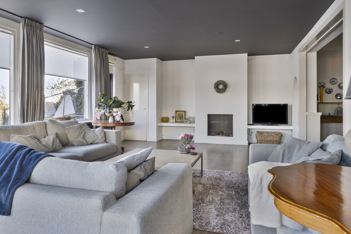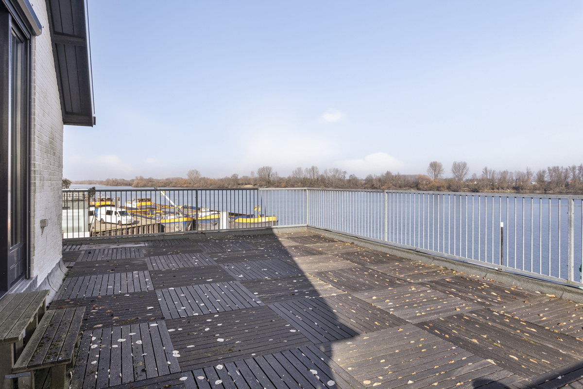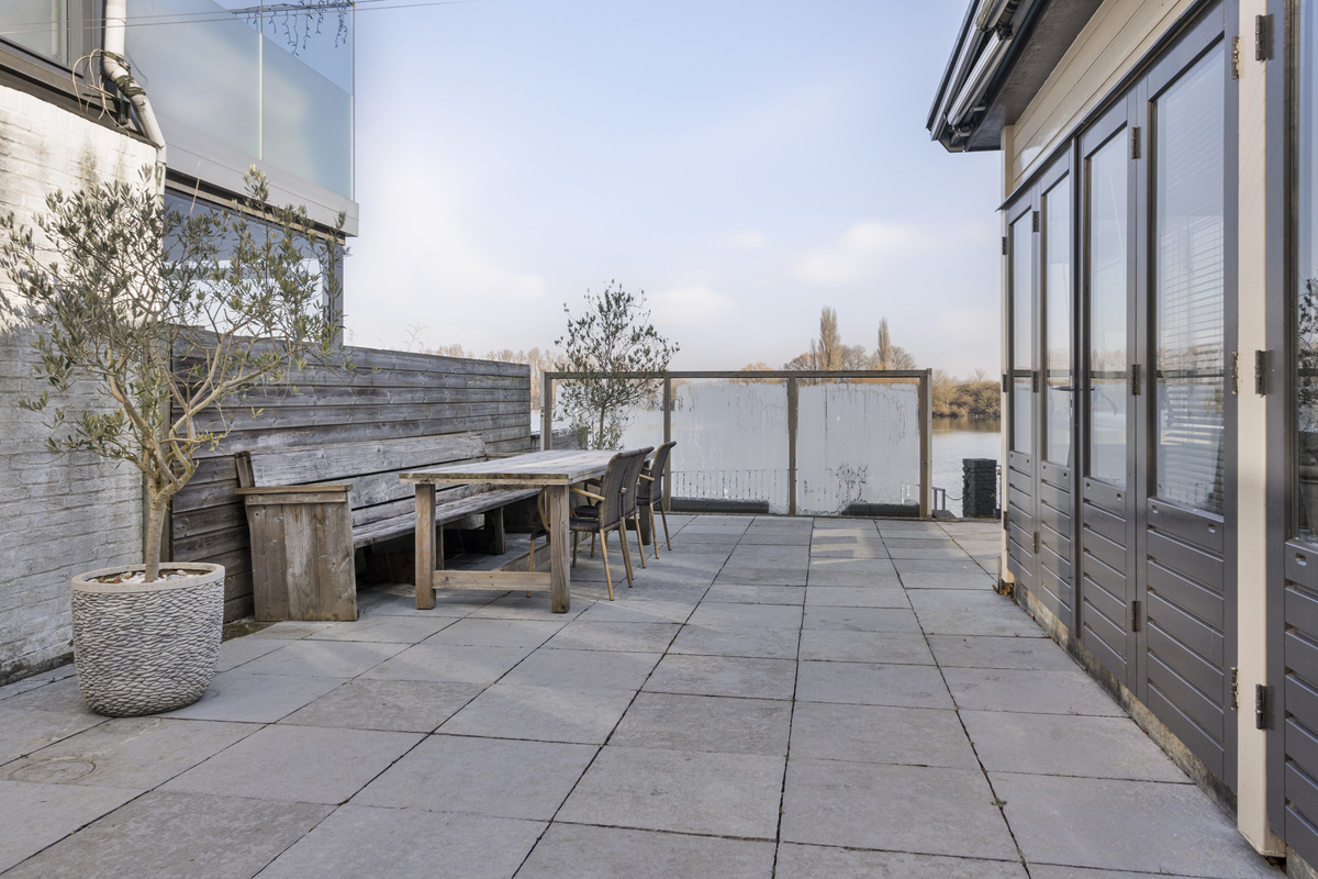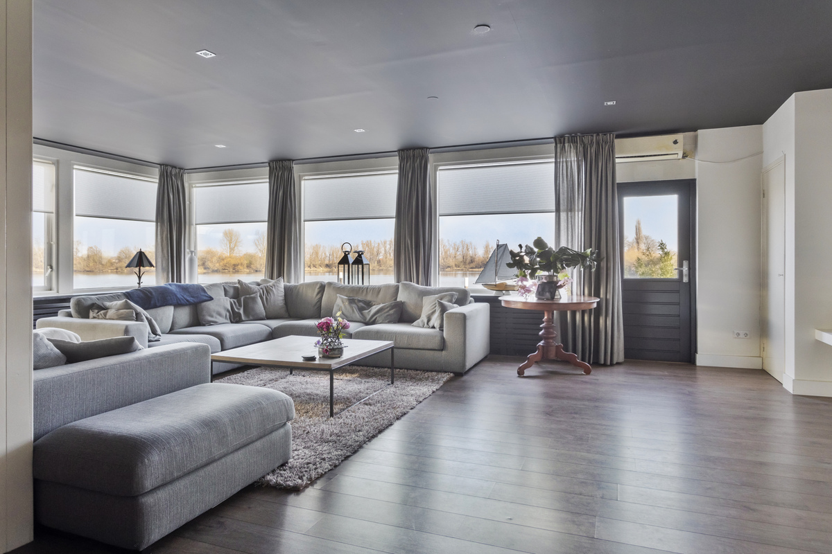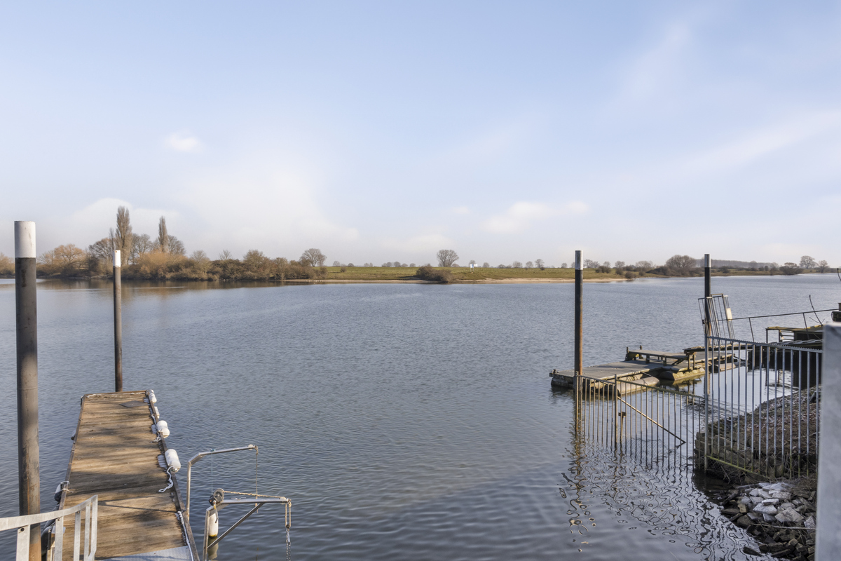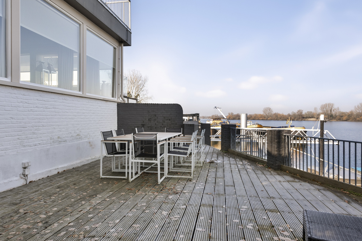 Indeling woning: de entree op dijkniveau geeft toegang tot het voorhuis voorzien van ruime living met open keuken, slaapkamer badkamer met douche en wastafelmeubel en separaat toliet. De lange hal leidt naar klapdeuren die toegang geven toegang tot het portaal, waar een afgesloten trapopgang naar de tweede verdieping en een trap naar de begane grond te vinden zijn. Hier stap je direct binnen in de royale leefkeuken, voorzien van een moderne keukenunit met kookeiland en diverse inbouwapparatuur. Aangrenzend ligt een praktische bijkeuken. De keuken staat in open verbinding met de ruim opgezette living, die een weids uitzicht biedt over de Maas en toegang geeft tot het dakterras. Aan de zijkant bevindt zich een sfeervolle tuinkamer, toegankelijk vanuit zowel de living als de keuken. Dankzij de openslaande deuren geniet deze ruimte van veel natuurlijk licht en directe toegang tot het terras. Daarnaast biedt een portaal vanuit de keuken toegang tot een trapkast en een toiletruimte, uitgerust met een wastafel, toilet en urinoir.