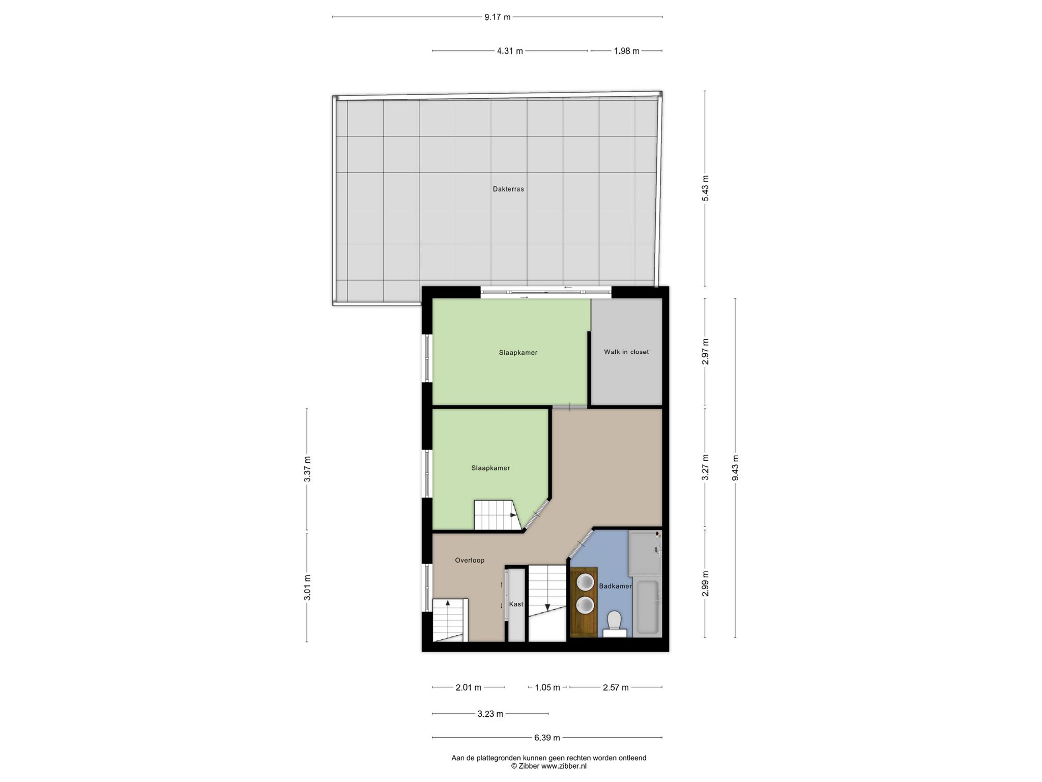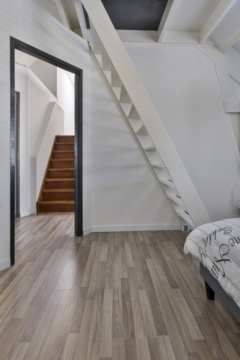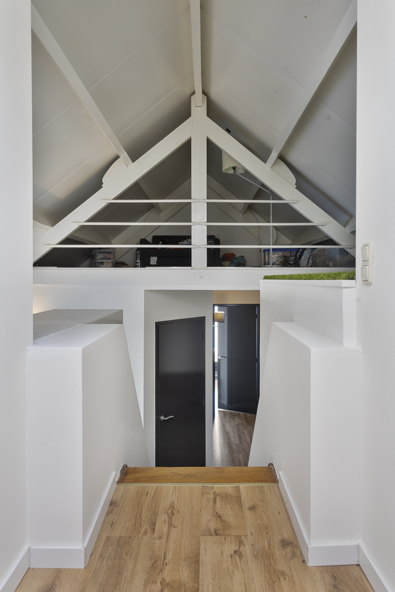 Tweede verdieping: een ruime overloop biedt toegang tot twee slaapkamers. De master bedroom heeft een inloopkast en schuifdeuren naar het dakterras, terwijl de andere slaapkamer is voorzien van een trap die leidt naar een bergzolder.