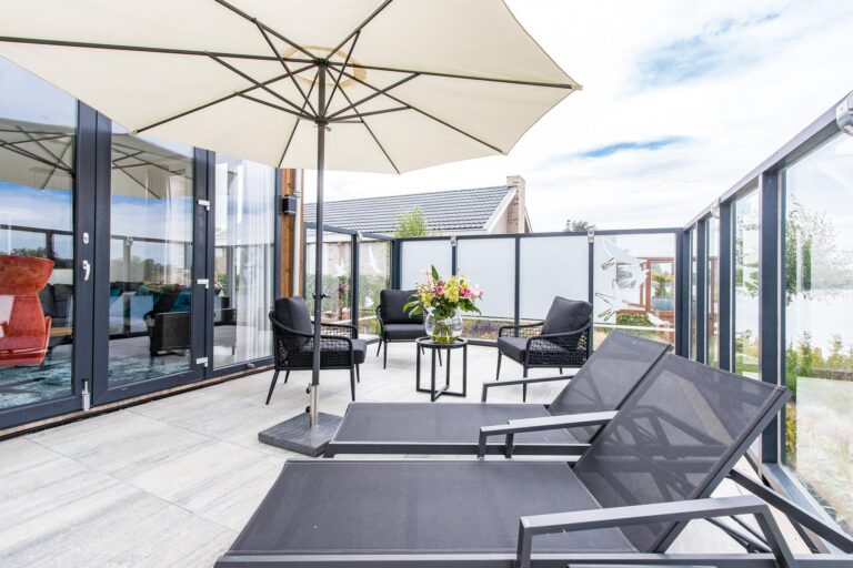 – inclusief fraai aangelegde tuin met ruim terras v.v. windschermen en sproei-installatie;