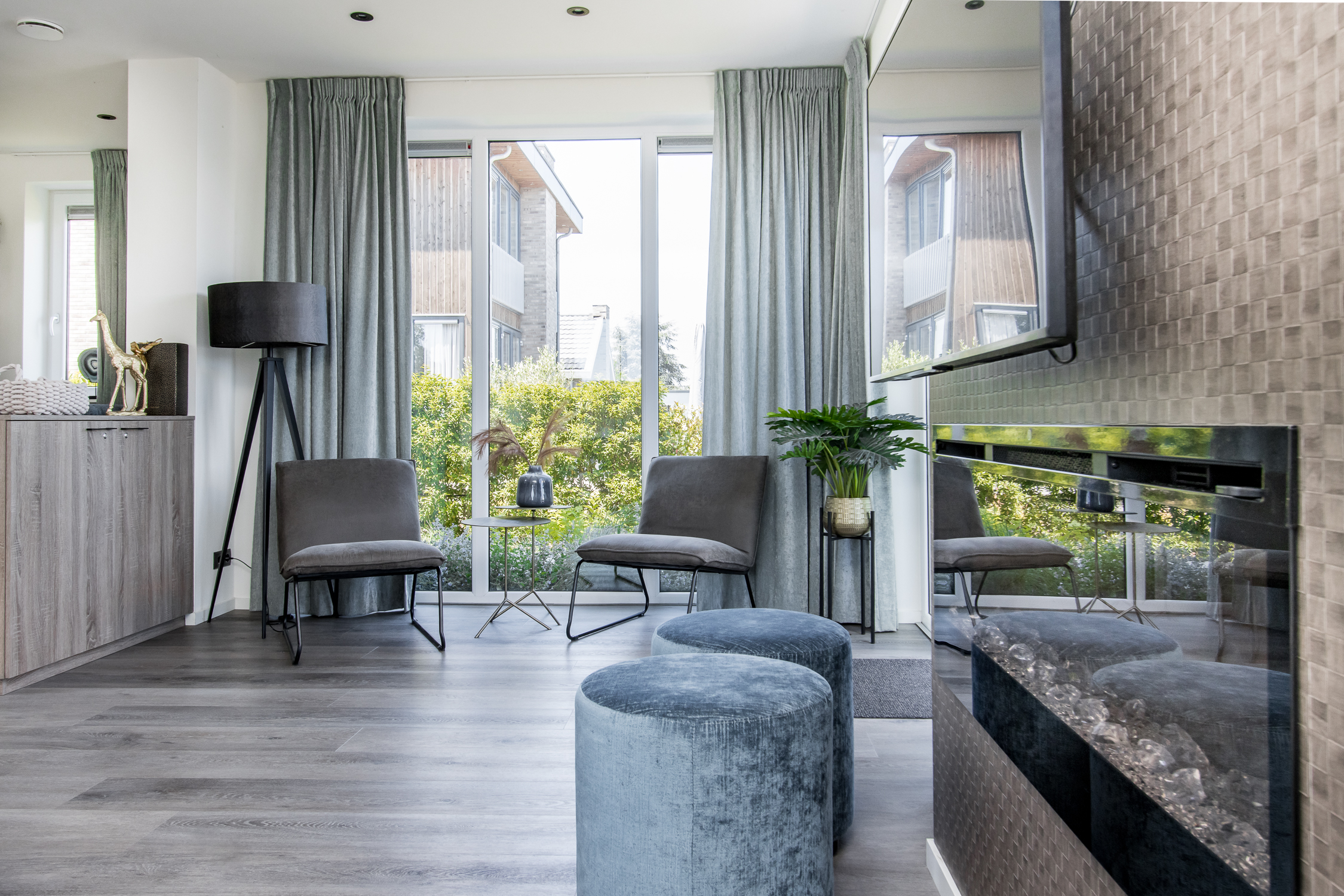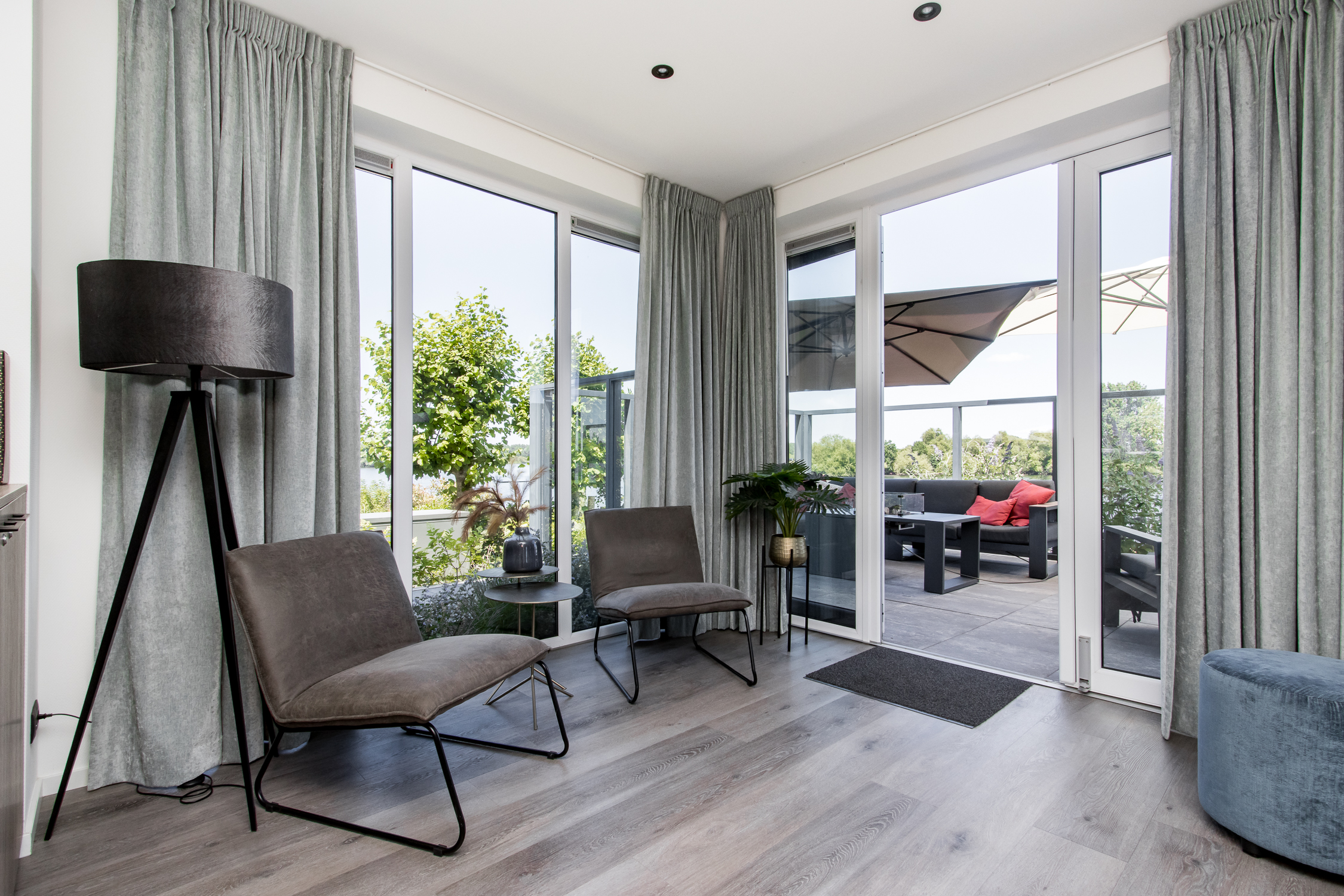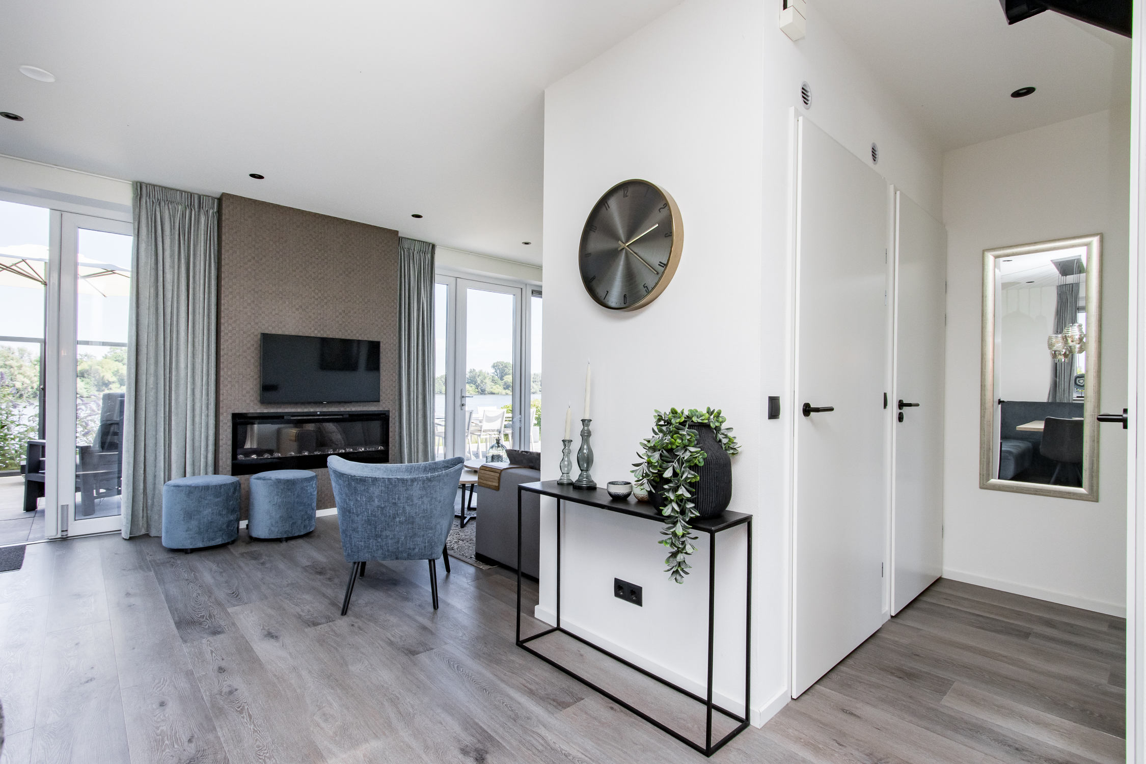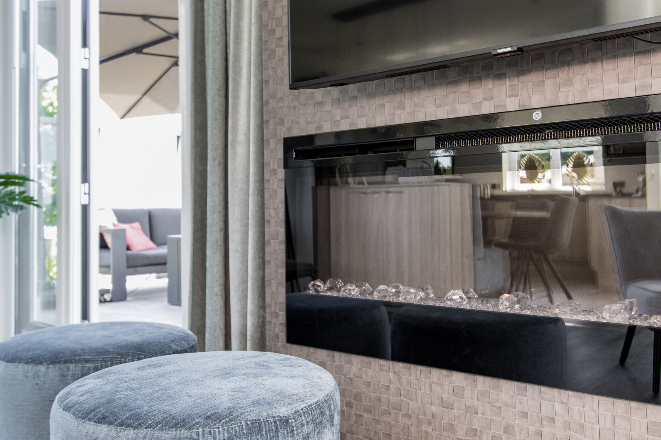 deuren naar terras inclusief grote raampartijen voor maximaal daglicht en uitzicht. Leuke extra is de ingebouwde elektrische haard.