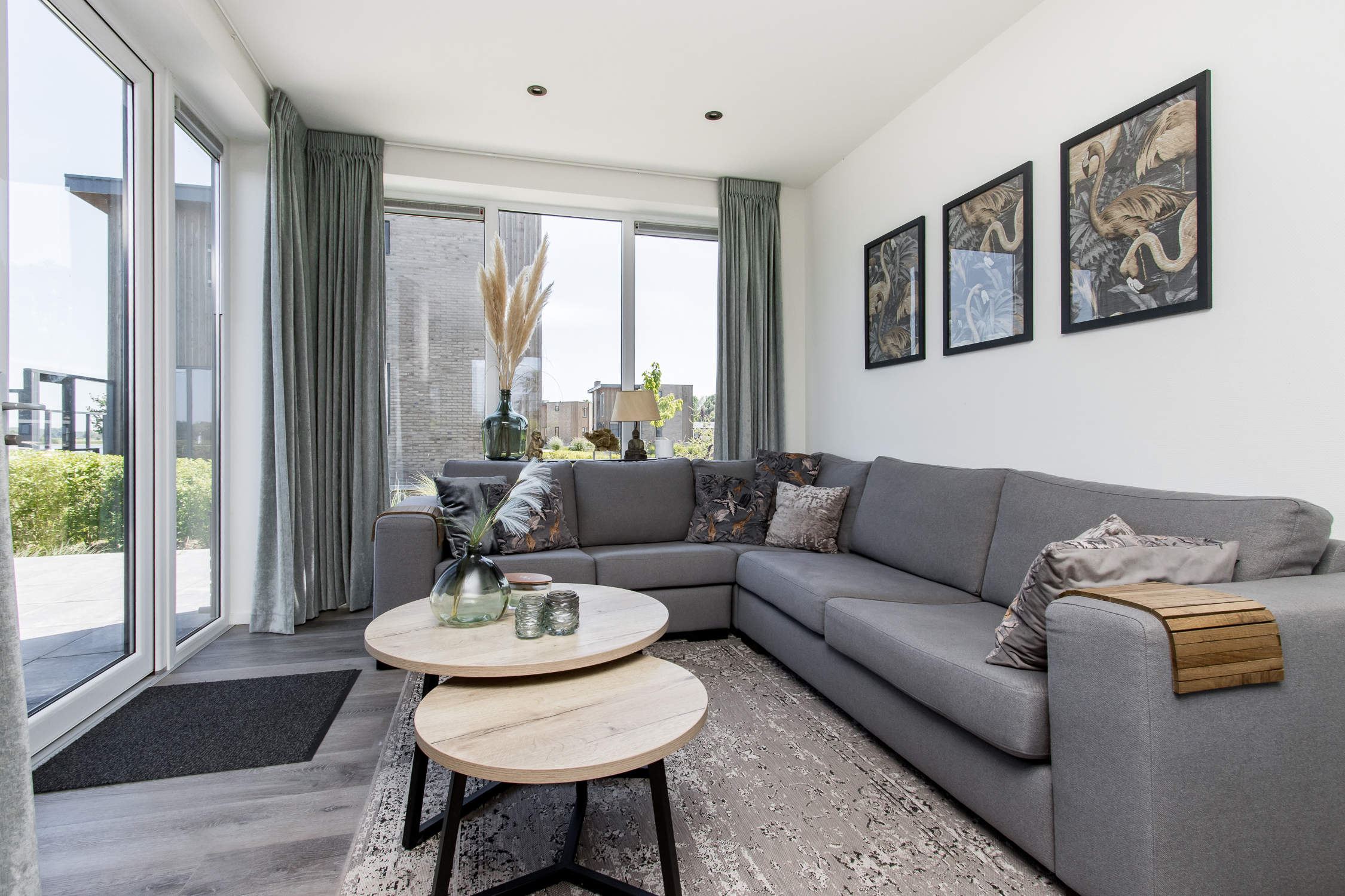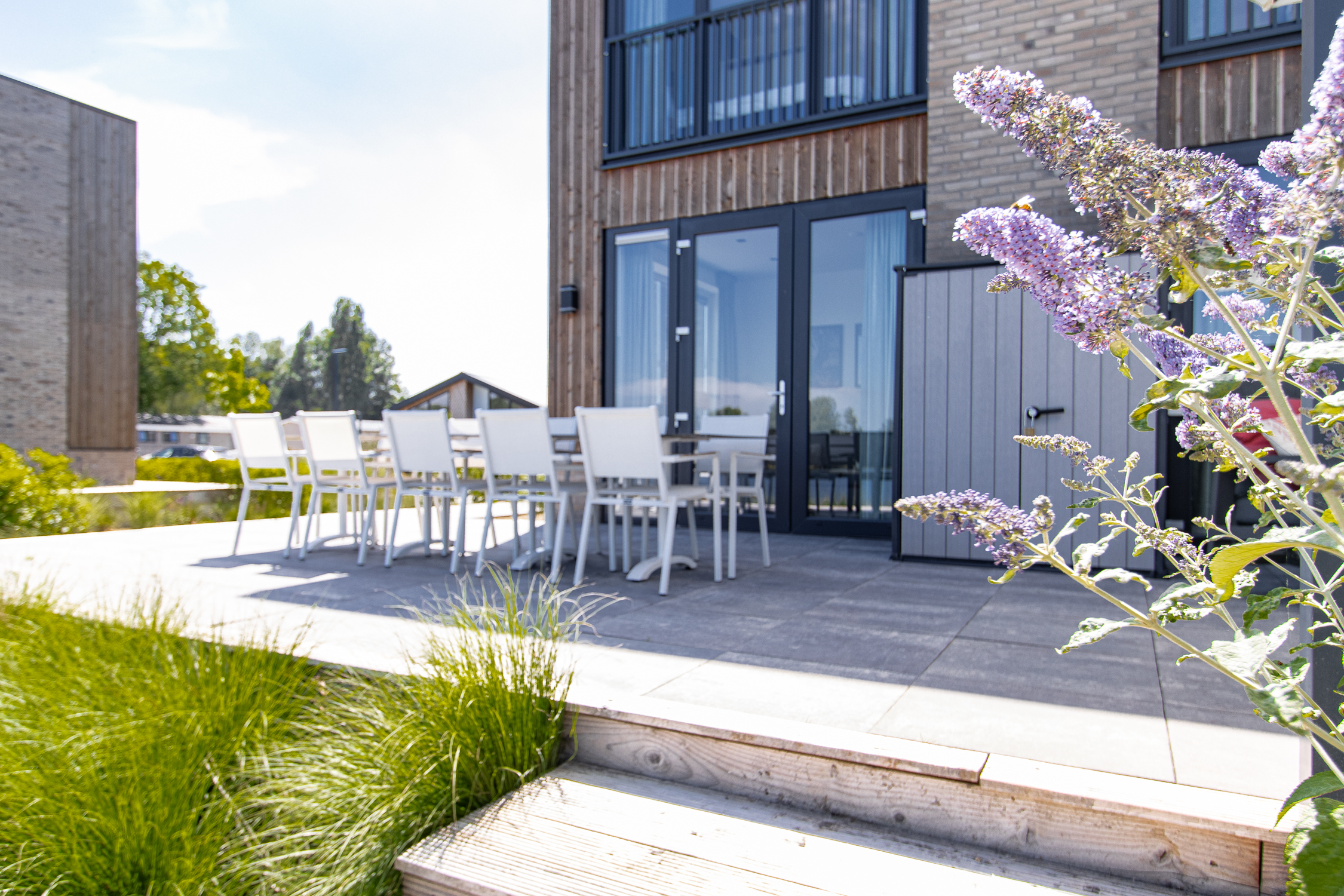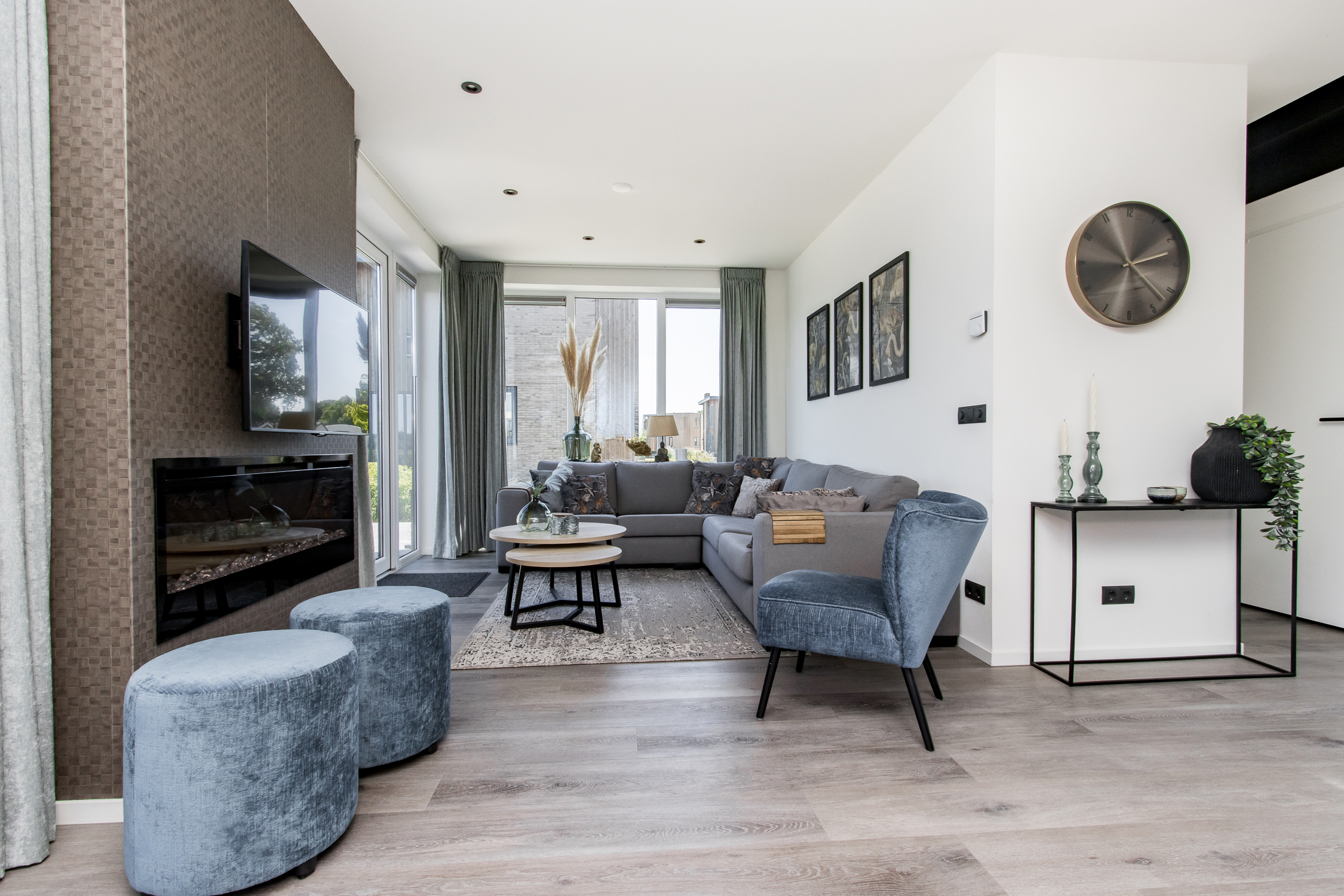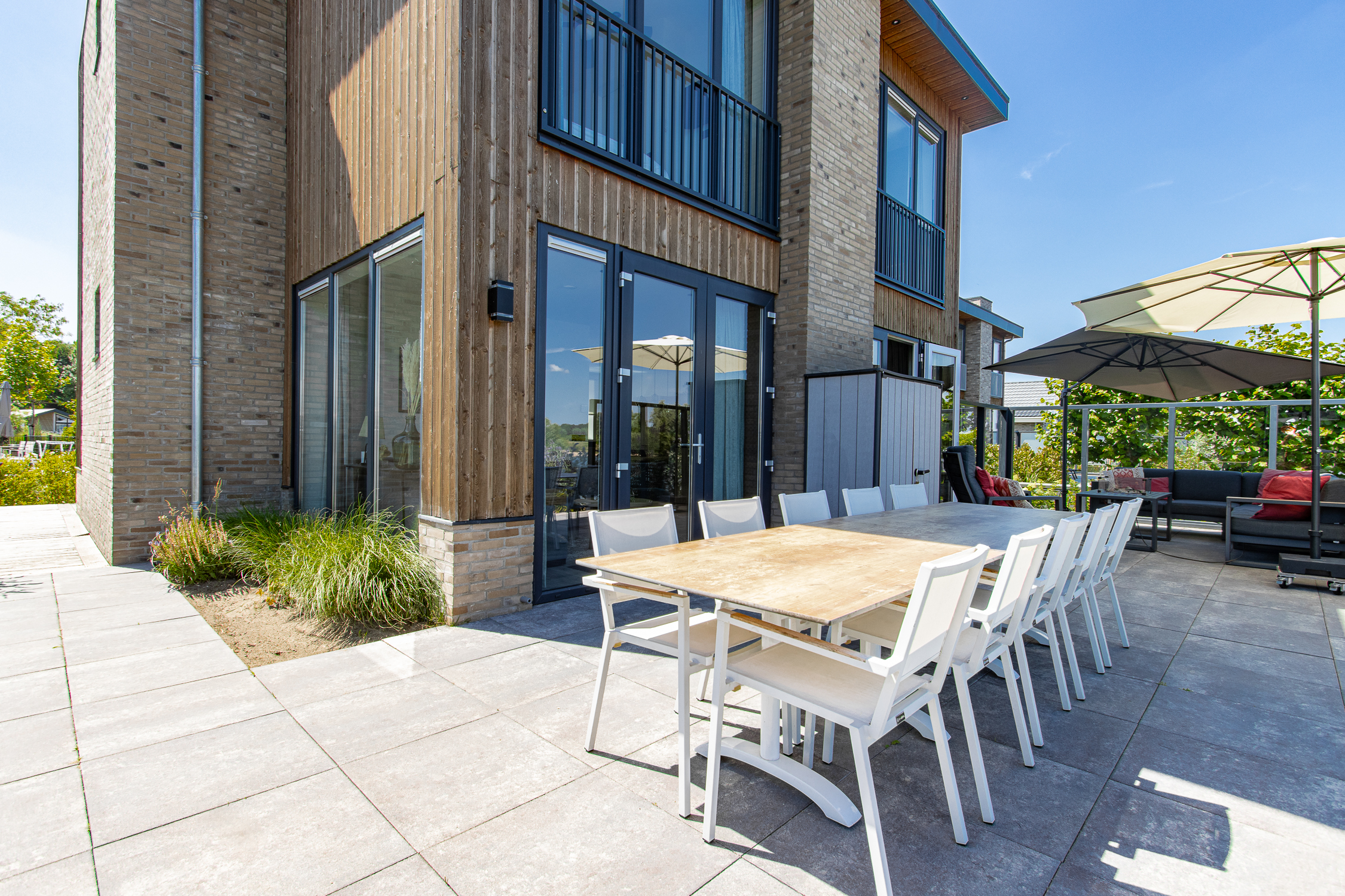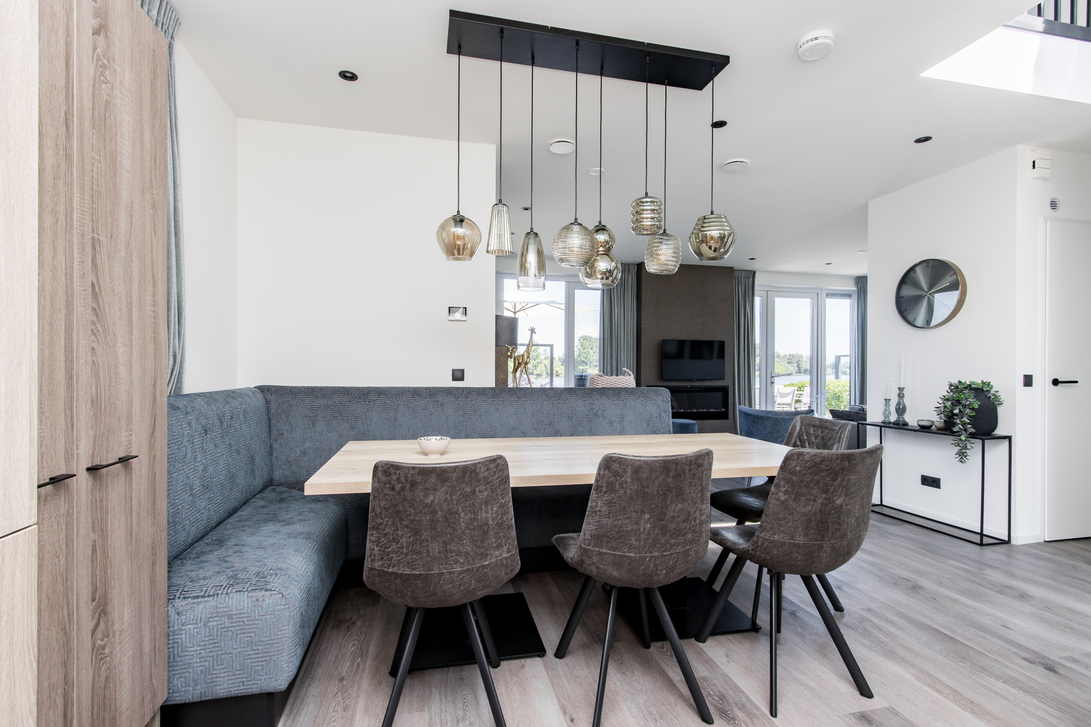 deuren naar terras inclusief grote raampartijen voor maximaal daglicht en uitzicht. Leuke extra is de ingebouwde elektrische haard.