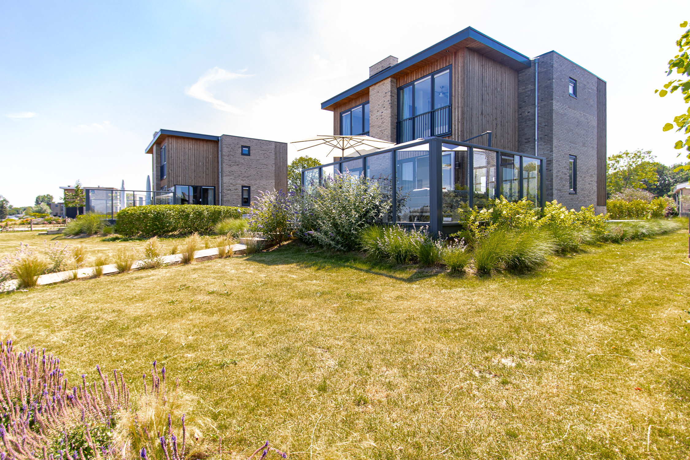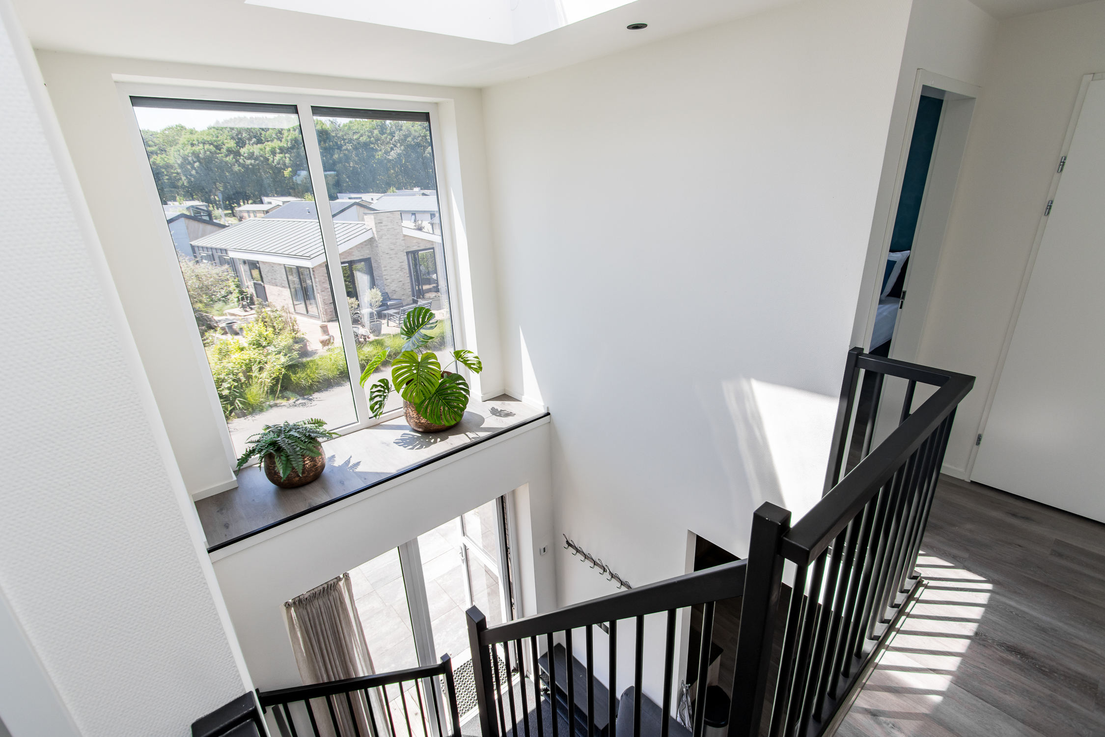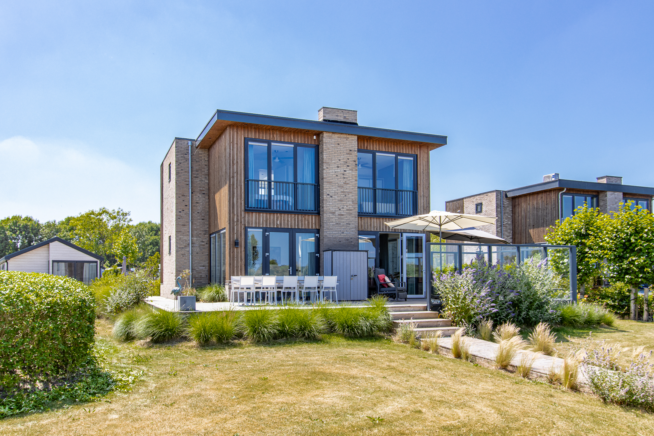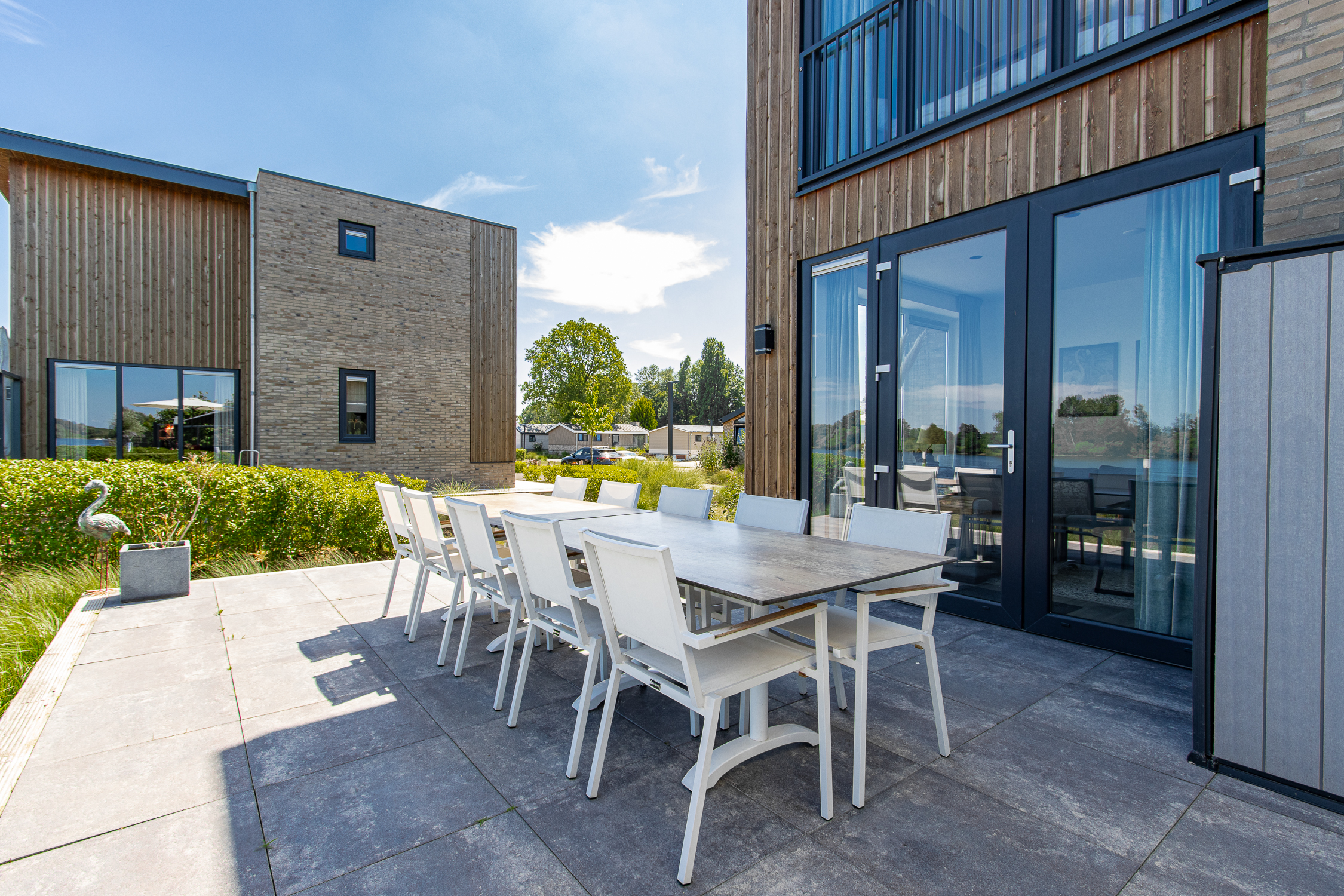 deuren naar terras inclusief grote raampartijen voor maximaal daglicht en uitzicht. Leuke extra is de ingebouwde elektrische haard.