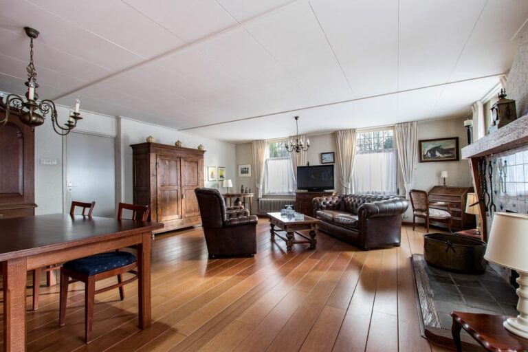 Begane grond: de entree aan de voorzijde geeft toegang tot de hal met fraaie granitovloer. Vanuit de hal met meterkast en trapopgang naar de verdieping bevindt zich aan de rechterzijde de zitkamer met praktische vaste kast. Deze ruimte zou ook als slaapvertrek gebruikt kunnen worden. Aan de linkerzijde is de riante woonkamer van maar liefst 47 m² gesitueerd. Deze sfeervolle ruimte is voorzien van open haard. Via de woonkamer bereikt u de keuken met landelijke keukenunit in hoekopstelling v.v. dubbele spoelbak, 4-pits gasfornuis en oven. De keuken geeft toegang tot de entree aan de achterzijde. Hier bevindt zich de toiletruimte en de moderne badkamer met douche en wastafelmeubel. Vanuit de entree is de ruime kelder van ca. 16 m² te bereiken.