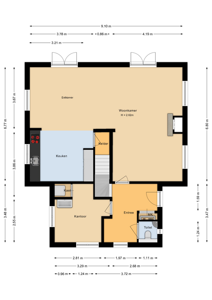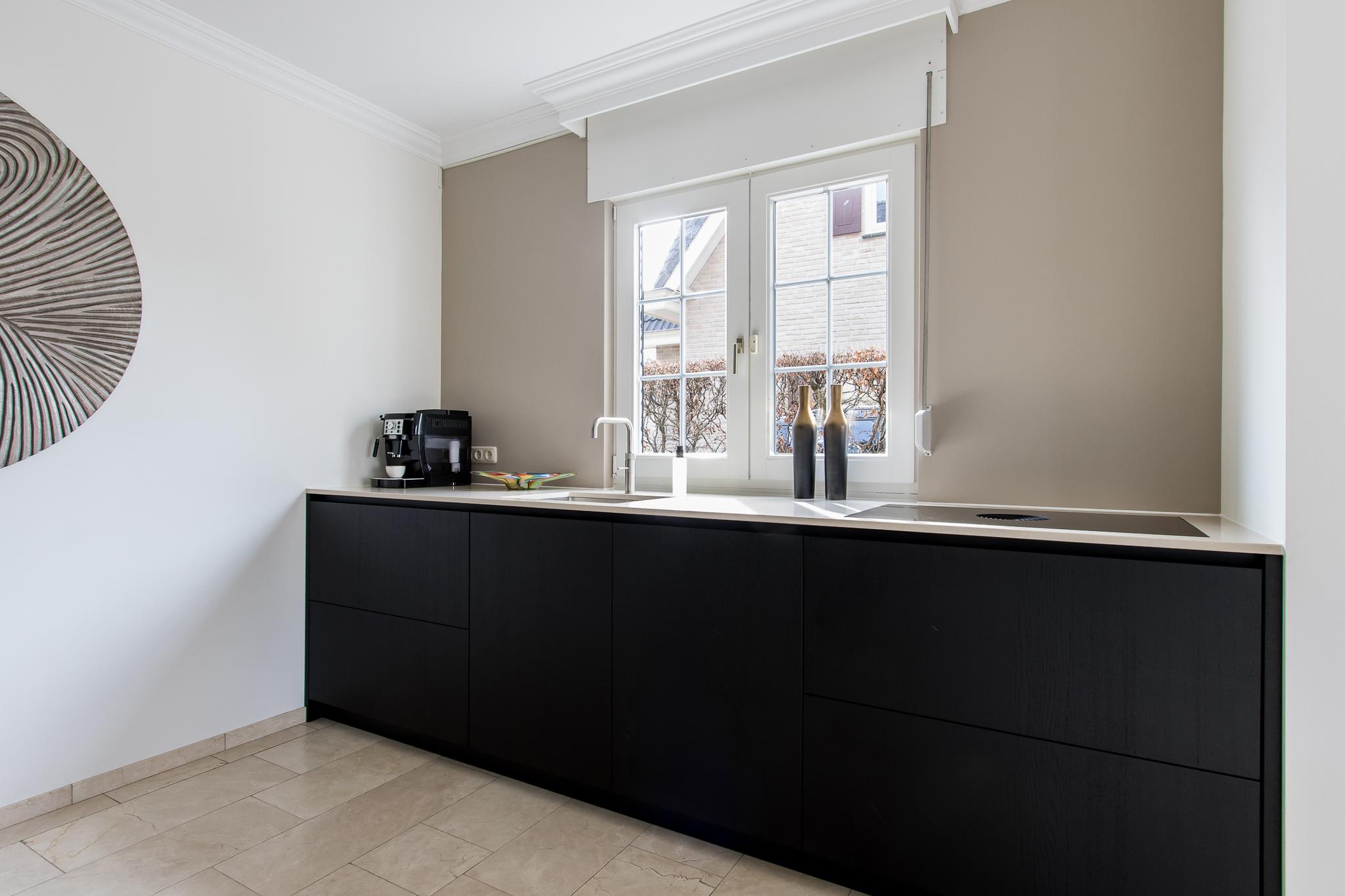 Indeling woonhuis: de lichte, ruime hal biedt toegang tot de garderobe, een uitgebreide meterkast en de trap naar de verdieping. Aan de voorzijde van de woning bevindt zich de praktijkruimte, voorzien van een handige kast met aansluitingen voor het witgoed. Vanuit de hal stapt u de woonkamer binnen, die door de grote raampartijen volop lichtinval heeft. De living staat in open verbinding met de moderne keuken (geplaatst in december 2024), uitgerust met een stijlvol keukenblok en kastenwand. De keuken is voorzien van diverse inbouwapparatuur, waaronder een inductiekookplaat met geïntegreerde afzuiging, Quooker, oven en wijnkoeler. Vanuit de keuken heeft u toegang tot de kelder, die zich uitstekend leent als extra berging of opslagruimte. Openslaande deuren geven toegang tot de achtertuin.
