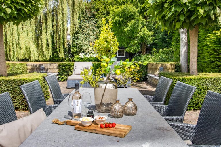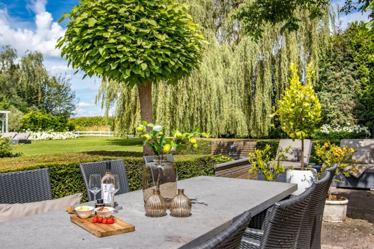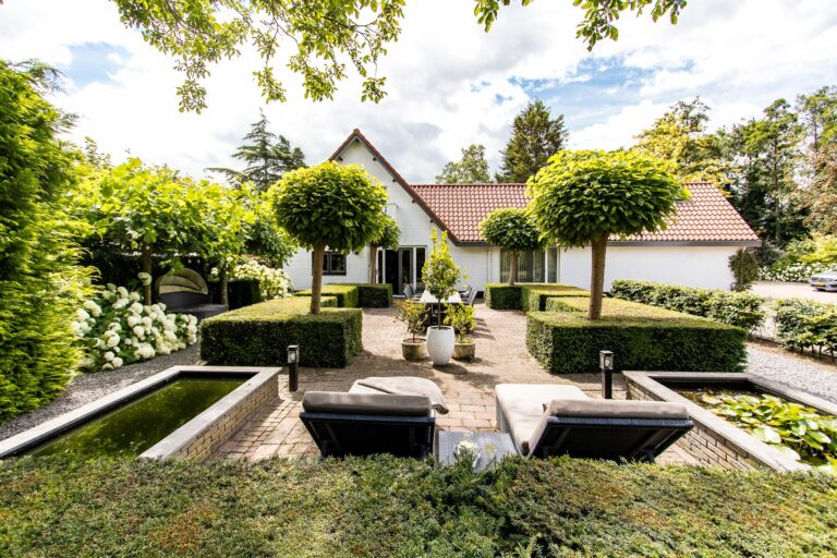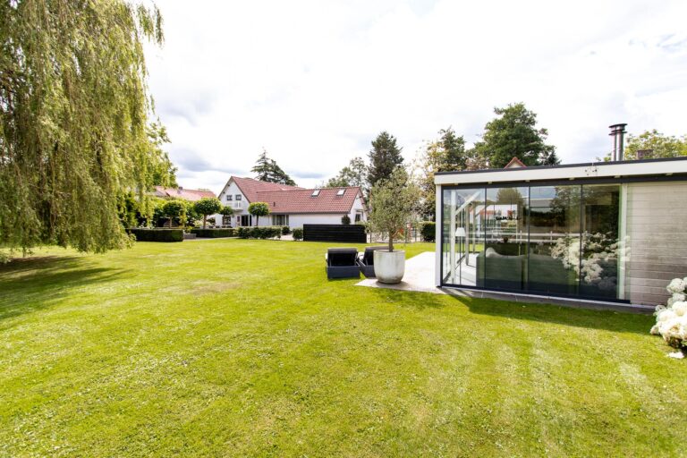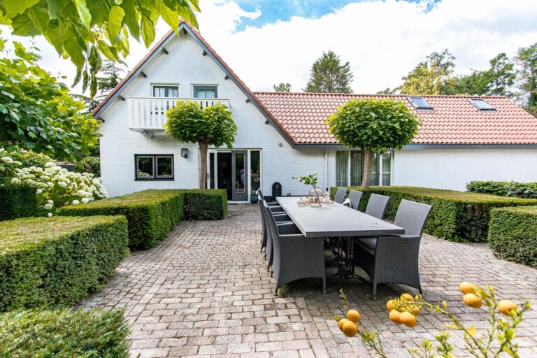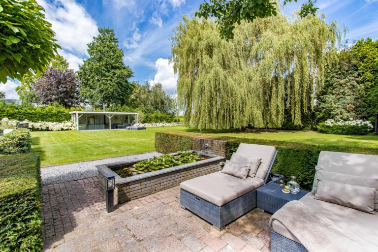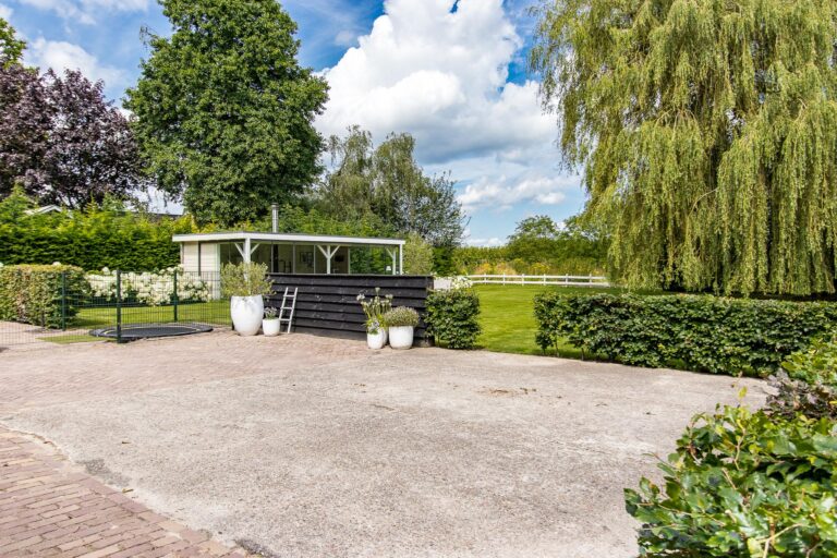 De tuin rondom de woning is verzorgd aangelegd met o.a. siergrind, gazon, verschillende struikgewassen, plantenborders en terrassen. De afsluitbare oprit aan de voorzijde van de woning biedt volop plek voor het parkeren van meerdere voertuigen. Met een uitgestrekt perceel, compleet met een weelderig gazon en sfeervolle terrassen, is er voldoende ruimte om in alle seizoenen te genieten van het buitenleven.
